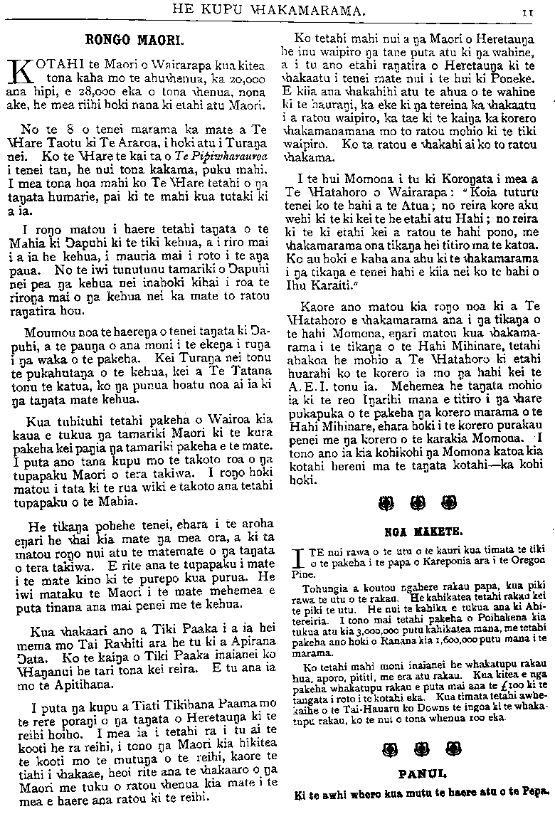 HE KUPU WHAKAMARAMA. 11 RONGO MAORI. KOTAHI te Maori o Wairarapa kua kitea tona kaha mo te ahuwhenua, ka 20, 000 ana hipi, e 28, 000 eka o tona whenua, nona ake, he mea riihi hoki nana ki etahi atu Maori. No te 8 o tenei marama ka mate a Te Whare Taotu ki Te Araroa, i hoki atu i Turanga nei. Ko te Whare te kai ta o Te Pipiwharauroa i tenei tau, he nui tona kakama, puku mahi. I mea tona hoa mahi ko Te Whare tetahi o nga tangata humane, pai ki te mahi kua tutaki ki a ia. I rongo matou i haere tetahi tangata o te Mahia ki Ngapuhi ki te tiki kehua, a i riro mai i a ia he kehua, i mauria mai i roto i te anga paua. No te iwi tunutunu tamariki o Ngapuhi nei pea nga kehua nei inahoki kihai i roa te rironga mai o nga kehua nei ka mate to ratou rangatira hou. Moumou noa te haerenga o tenei tangata ki Nga- puhi, a te paunga o ana moni i te ekenga i runga i nga waka o te pakeha. Kei Turanga nei tonu te pukahutanga o te kehua» kei a Te Tatana tonu te katua, ko nga punua hoatu noa ai ia ki nga tangata mate kehua. Kua tuhituhi tetahi pakeha o Wairoa kia kaua e tukua nga tamariki Maori ki te kura pakeha kei pangia nga tamariki pakeha e te mate. I puta ano tana kupu mo te takoto roa o nga tupapaku Maori o tera takiwa. I rongo hoki matou i tata ki te rua wiki e takoto ana tetahi tupapaku o te Mahia. He tikanga pohehe tenei, ehara i te aroha engari he whai kia mate nga mea ora, a ki ta matou rongo nui atu te matemate o nga tangata o tera takiwa. E rite ana te tupapaku i mate i te mate kino ki te purepo kua purua. He iwi mataku te Maori i te mate mehemea e puta tinana ana mai penei me te kehua. Kua whakaari ano a Tiki Paaka i a ia hei mema mo Tai Rawhiti ara he tu ki a Apirana Data. Ko te kainga o Tiki Paaka inaianei ko Whanganui he tari tona kei reira. E tu ana ia mo te Apitihana. I puta nga kupu a Tiati Tikihana Paama mo te rere porangi o nga tangata o Heretaunga ki te reihi hoiho. I mea ia i tetahi ra i tu ai te kooti he ra reihi, i tono nga Maori kia hikitea te kooti mo te mutunga o te reihi, kaore te tiahi i whakaae, heoi rite ana te whakaaro o nga Maori me tuku o ratou whenua kia mate i te mea e haere ana ratou ki te reihi. Ko tetahi mahi nui a nga Maori o Heretaunga he inu waipiro nga tane puta atu ki nga wahine, a i tu ano etahi rangatira o Heretaunga ki te whakaatu i tenei mate nui i te hui ki Poneke. E kiia ana whakahihi atu te ahua o te wahine ki te haurangi, ka eke ki nga tereina ka whakaatu i a ratou waipiro, ka tae ki te kainga ka korero whakamanamana mo to ratou mohio ki te tiki waipiro. Ko ta ratou e whakahi ai ko to ratou whakama. I te hui Momona i tu ki Korongata i mea a Te Whatahoro o Wairarapa: " Koia tutura tenei ko te hahi a te Atua; no reira kore aku wehi ki te ki kei te he etahi atu Hahi; no reira ki te ki etahi kei a ratou te hahi pono, me whakamarama ona tikanga hei titiro ma te katoa. Ko au hoki e kaha ana ahu ki te whakamarama i nga tikanga e tenei hahi e kiia nei ko te hahi o Ihu Karaiti." Kaore ano matou kia rongo noa ki a Te Whatahoro e whakamarama ana i nga tikanga o te hahi Momona, engari matou kua whakama- rama i te tikanga o te Hahi Mihinare, tetahi ahakoa he mohio a Te Whatahoro ki etahi huarahi ko te korero ia mo nga hahi kei te A. E. I. tonu ia. Mehemea he tangata mohio ia ki te reo Ingarihi mana e titiro i nga whare pukapuka o te pakeha nga korero marama o te Hahi Mihinare, ehara hoki i te korero purakau penei me nga korero o te karakia Momona. I tono ano ia kia kohikohi nga Momona katoa kia kotahi hereni ma te tangata kotahi—ka kohi hoki. NGA MAKETE. ITE nui rawa o te utu o te kauri kua timata te tiki o te pakeha i te papa o Kareponia ara i te Oregon Pine. Tohungia a koutou ngahere rakau papa, kua piki rawa te utu o te rakau. He kahikatea tetahi rakau kei te piki te utu. He nui te kahika e tukua ana ki Ahi- tereiria. I tono mai tetahi pakeha o Poihakena kia tukua atu kia 3.000, 000 putu kahikatea mana, me tetahi pakeha ano hoki o Ranana kia 1 ooo, ooo putu mana i te marama. Ko tetahi mahi moni inaianei he whakatupu rakau hua. aporo, pititi, me era atu rakau. Kua kitea e nga pakeha whakatupu rakau e puta mai aua te £8 100 ki te tangata i roto i te kotahi eka. Kua timata tetahi awhe- kaihe o te Tai-Hauaru ko Downs te ingoa ki te whaka- tupu rakau, ko te nui o tona whenua 100 eka. PANUI. Ki te awhi whero kua mutu te haere atu o te Pepa