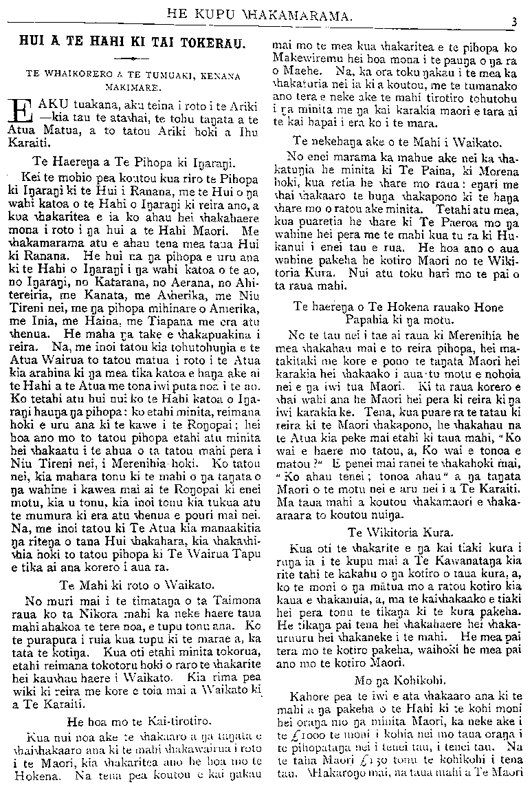 HE KUPU WHAKAMARAMA. HUI A TE HAHI KI TAI TOKERAU. TE WHAIKORERO A TE TUMUAKI, KENANA MAKIMARE. E AKU tuakana, aku teina i roto i te Ariki —kia tau te atawhai, te tohu tangata a te Atua Matua, a to tatou Ariki hoki a Ihu Karaiti. Te Haerenga a Te Pihopa ki Ingarangi. Kei te mohio pea koutou kua riro te Pihopa ki Ingarangi ki te Hui i Ranana, me te Hui o nga wahi katoa o te Hahi o Ingarangi ki reira ano, a kua whakaritea e ia ko ahau hei whakahaere mona i roto i nga hui a te Hahi Maori. Me whakamarama atu e ahau tena mea taua Hui ki Ranana. He hui na nga pihopa e uru ana ki te Hahi o Ingarangi i nga wahi katoa o te ao, no Ingarangi, no Katarana, no Aerana, no Ahi- tereiria, me Kanata, me Awherika, me Niu Tireni nei, me nga pihopa mihinare o Amerika, me Inia, me Haina, me Tiapana me era atu whenua. He maha nga take e whakapuakina i reira. Na, me inoi tatou kia tohutohungia e te Atua Wairua to tatou matua i roto i te Atua kia arahina ki nga mea tika katoa e hanga ake ai te Hahi a te Atua me tona iwi puta noa i te ao. Ko tetahi atu hui nui ko te Hahi katoa o Inga- rangi haunga nga pihopa ko etahi minita, reimana hoki e uru ana ki te kawe i te Rongopai; hei hoa ano mo to tatou pihopa etahi atu minita hei whakaatu i te ahua o ta tatou mahi pera i Niu Tireni nei, i Merenihia hoki. Ko tatou nei, kia mahara tonu ki te mahi o nga tangata o nga wahine i kawea mai ai te Rongopai ki enei motu, kia u tonu, kia inoi tonu kia tukua atu te mumura ki era atu whenua e pouri mai nei. Na, me inoi tatou ki Te Atua kia manaakitia nga ritenga o tana Hui whakahara, kia whakawhi- whia hoki to tatou pihopa ki Te Wairua Tapu e tika ai ana korero i aua ra. Te Mahi ki roto o Waikato. No muri mai i te timatanga o ta Taimona raua ko ta Nikora mahi ka neke haere taua mahi ahakoa te tere noa, e tupu tonu ana. Ko te purapura i ruia kua tupu ki te marae a, ka tata te kotinga. Kua oti etahi minita tokorua, etahi reimana tokotoru hoki o raro te whakarite hei kauwhau haere i Waikato. Kia rima pea wiki ki reira me kore e toia mai a Waikato ki a Te Karaiti. He hoa mo te Kai-tirotiro. Kua nui noa ake te whakaaro a na tangata e whaiwhakaaro ana ki te mahi whakawairua i ruto i te Maori, kia whakaritea ano he hoa mo te Hokena. Na tena pea koutou e kai ngakau mai mo te mea kua whakaritea e te pihopa ko Makewiremu hei hoa mona i te paunga o nga ra o Maehe. Na, ka ora toku ngakau i te mea ka whakaaturia nei ia ki a koutou, me te tumanako ano tera e neke ake te mahi tirotiro tohutohu i nga minita me nga kai karakia maori e tara ai te kai hapai i era ko i te mara. Te nekehanga ake o te Mahi i Waikato. No enei marama ka mahue ake nei ka wha- katungia he minita ki Te Paina, ki Morena hoki, kua retia he whare mo raua: engari me whai whakaaro te hunga whakapono ki te hanga whare mo o ratou ake minita. Tetahi atu mea, kua puaretia he whare ki Te Paeroa mo nga wahine hei pera me te mahi kua tu ra ki Hu- kanui i enei tau e rua. He hoa ano o aua wahine pakeha he kotiro Maori no te Wiki- toria Kura. Nui atu toku hari mo te pai o ta raua mahi. Te haerenga o Te Hokena rauako Hone Papania ki nga motu. No te tau nei i tae ai raua ki Merenihia he mea whakahau mai e to reira pihopa, hei ma,- takitaki me kore e pono te tangata Maori hei karakia hei whakaako i aua tu motu e nohoia nei e nga iwi tua Maori. Ki ta raua korero e whai waki ana he Maori hei pera ki reira ki nga iwi karakia ke. Tena, kua puare ra te tatau ki reira ki te Maori whakapono, he whakahau na te Atua kia peke mai etahi ki taua mahi," Ko wai e haere mo tatou, a, Ko wai e tonoa e matou?" E penei mai ranei te whakahoki mai, " Ko ahau tenei; tonoa ahau" a nga tangata Maori o te motu nei e aru nei i a Te Karaiti. Ma taua mahi a koutou whakamaori e whaka- araara to koutou nuinga. Te Wikitoria Kura. Kua oti te whakarite e nga kai tiaki kura i runga ia i te kupu mai a Te Kawanatanga kia rite tahi te kakahu o nga kotiro o taua kura, a, ko te moni o nga matua mo a ratou kotiro kia kaua e whakanuia, a, ma te kaiwhakaako e tiaki hei pera tonu te tikanga ki te kura pakeha. He tikanga pai tena hei whakahaere hei whaka- uruuru hei whakaneke i te mahi. He mea pai tera mo te kotiro pakeha, waihoki he mea pai ano mo te kotiro Maori. Mo na Kohikohi. Kahore pea te iwi e ata whakaaro ana ki te mahi a nga pakeha o te Hahi ki te kohi moni hei oranga mo nga minita Maori, ka neke ake i te £1ooo te moni i kohia nei mo taua oranga i te pihopatanga nei i tenei tau, i tenei tau. Na te taha Maori £130 tonu te kohikohi i tena tau. Whakarongo mai, na taua mahi a Te Maori