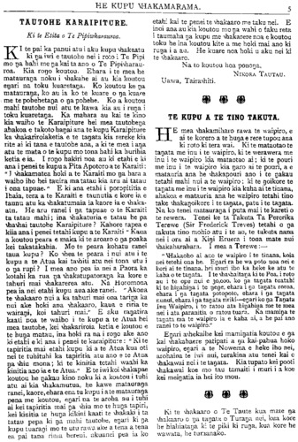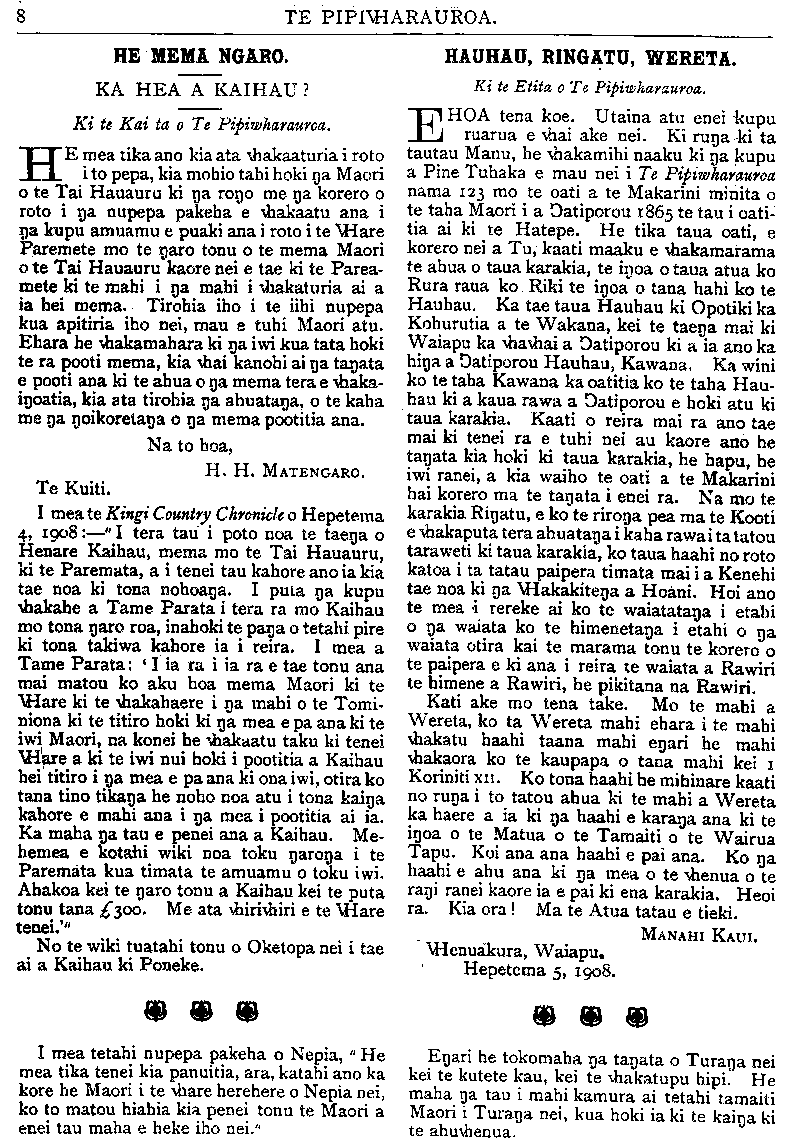 HE KUPU WHAKAMARAMA. TAUTOHE KARAIPITURE. Ki te Etita o Te Pipiwharauroa. KI te pai ka panui atu i aku kupu whakaatu ki nga iwi e tautohe nei i roto i Te Pipi mo nga hahi me nga kai ta ano o Te Pipiwharau- roa. Kia rongo koutou. Ehara i te mea he matauranga noku i whakahe ai au kia koutou engari na toku kuaretanga. Ko koutou ke nga matauranga, ko au ia ko te kuare o nga kuare me te pohehetanga o nga pohehe. Ko a koutou mahi tautohe nui atu te kawa kia au i runga i toku kuaretanga. Ka mahara au kai te kino kia waiho te Karaipiture hei mea tautohenga ahakoa e takoto hangai ana te kupu Karaipiture ka whakariroiaketia e te tangata kia rereke kia rite ai ki tana e tautohe ana, a ki te mea i anga atu te mata o te kupu mo tona hahi ka hurihia ketia e ia. I rongo hakiri noa au ki etahi e ki ana i penei te kupu a Pita Apotoro a te Karaiti: " I whakamatea hoki a te Karaiti mo nga hara a waiho iho hei tauira matatau kia aru ai tatau i ona tapuae." E ki ana etahi i poropititia e Ihaia, tera a te Karaiti e taunutia e kore ia e taunu atu ka whakatumaia ia kaore ia e whaka- atu. He aru ranei i nga tapuae o te Karaiti ta tatau mahi; ina whakaturia e tatau he pa whawhai tautohe Karaipiture? Kahore rapea e kiia ana i penei tetahi kupu a te Karaiti " Kaua a koutou peara e maka ki te aroaro o nga poaka kei takatakahia. Mo te peara kohatu ranei taua kupu? Ko whea te peara i nui atu i te kupu a te Atua kai tawhiti atu nei tona utu i o nga rupi? I mea ano pea ia nei a Paora ka kotahi ka rua nga whakatupatoranga ka kore e tahuri mai whakarerea atu. Na Horomona pea ia nei etahi kupu aua ake ranei. " Akona te whakaaro nui a ka tahuri mai ona taringa ka nui ake hoki ana whakaaro, kaua e riria te wairangi, koi tahuri mai." E aku rangatira kaati noa te waiho i te kupu a te Atua hei mea tautohe, kei whakariroia ketia e koutou e te hunga matau, ina hoki ra na i rongo ake ano ki etahi e ki ana i penei te karaipiture: " Ki te tapiritia mai etahi kupu ki a te Atua kua oti nei te tuhituhi ka tapiritia atu ano e te Atua nga whiu mona; ki te kinitia tetahi waahi ka kinitia ano ia e te Atua." E te iwi koi whakapae koutou he ngakau kino noku ki a koutou i tuhi atu ai kia whakamutua, he kawe matauranga ranei, kaore, ehara ena tu kupu i a te matauranga pena me koutou, engari na te aroha au i tuhi ai kei tapiritia mai nga whiu mo te hunga tapiri, kei kinitia te hunga kikini kaati te whakaki i ta tatau pepa ki nga mahi tautohe, engari ki na kupu tuarangi mo te utu rawa ake a tena a tena ea pai tana rima hereni. akuanei pea ia ko etahi kai te penei te whakaaro me taku nei. E inoi ana au kia koutou mo nga wahi o taku reta i taumaha nga kupu me whakarere noa e koutou toku he ina koutou kite a me hoki mai ano ki runga i a au. He kuare noa hoki u aku nei ki te whakaaro. Na to koutou hoa pononga, NIKORA TAUTAU. Uawa, Tairawhiti. TE KUPU A TE TINO TAKUTA. HE mea whakamiharo rawa te waipiro, e ai te korero a te hunga e rere tupou ana ki roto ki tera wai. Ki te mataotao te tangata me inu i te waipiro, ki te werawera me inu i te waipiro kia mataotao ai; ki te pouri me inu i te wai piro kia ngaro ai te pouri, a e matauria ana he whakapouri ano i te ngakau tetahi mahi nui a te waipiro; ki te ngoikore te tangata me inu i te waipiro kia kaha ai te tinana, ahakoa e matauria ana he waipiro tetahi tino take whakangoikore i te tangata, patu i te tangata. Na ko tenei matauranga i puta mai i te kareti o te rewera. Tenei ke ta Takuta Ta Pererika Terewe (Sir Frederick Treves) tetahi o nga takuta tino mohio atu i te ao, te takuta nana nei i ora ai a Kingi Eruera i tona mate nui whakaharahara. I mea a Terewe:— " Whakaoho ai ano te waipiro i te tinana, koia nei tetehi ona he. En ari ra he wa poto noa nei e kori ai te tinana, hei muri iho ka heke ke atu te kaha o te tanata. I te whawhaitanga ki te Poa, i roto au i te ope nui e 30, 000, ko na tanata tuatahi ki te hinahina i te nene, ehara i na tanata roroa, ehara i na tangata potopoto, ehara i nga tanata nunui, ehara i nga tangata ririki engari ko na Tanata Inu Waipiro, i to ratou ata hingahinga me te mea nei i ata paranitia o ratou tuara. Ka mamina te tanata ma te waipiro ia e kaha ai, a he pai ano ranei to te waipiro." Engari awhekaihe kei mamingatia koutou e nga kai whakahaere patipati a nga kai-pahua hoko waipiro, engari a te Nowema e heke iho nei, arohaina te iwi nui, turakina atu tenei kai e whakawai nei i te tangata. Kia tupato kei pooti whakawai koe mo tau tamaiti i muri i a koe kei meingatia ia hei ito mou. Ki te whakaaro o Te Taute kua mate nga whakaaro o nga tangata o Turanga nei, kua kore he hiahiatanga ki te piki ki runga, kua kore he wawata, he tumanako.