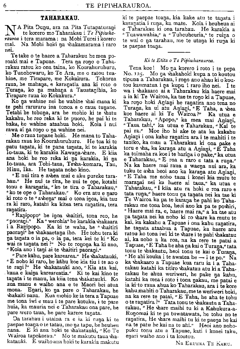 TE PIPIWHARAUROA. TAHARAKAU. NA Pita Ngungu, ara na Pita Tutapaturangi te korero mo Taharakau i Te Pipiwha- rauroa i tera marama: na Mohi Turei i korero mai. Na Mohi hoki nga whakamarama i raro nei. Te take o te haere a Taharakau he mea po- roaki mai e Tapuae. Tera nga rongo o Taha- rakau ratou ko ona taina, ko Kourahuruhuru, ko Tunohowaru, ko Te Ara, me o ratou tua- hine, me Tirapare, me Kokakura. Tokorua raua, he mahanga, e karangatia ana ki roto o Turanga, ko nga mahanga a Tauatangihia, ko Tirapare raua ko Kokakura." Ko nga wahine nei he wahine whai mana ki •te pehi raruraru ina tonoa e o raua tungane. Tetahi he tohunga, ara he mohio ki te whatu kakahu, he reo reka ki te puoro, he pai ki te haka, he wahine ataahua hoki. Koia i nui rawa ai nga rongo o nga wahine nei. Me o raua tungane hoki. He mana to Taha- rakau raua ko Kourahuruhuru. He toa ki te patu tangata, ki te pana tangata, ki te karakia lo-taua, ki te karakia Kawanga-whare. E kiia ana hoki he reo reka ki nga karakia, ki nga lo-taua, ara Tohi-taua, Tewha-kumara, Tau, Hinu, Ika. He tangata noho kino. "E nui tira e awhea mai e aku pureke tara- hau." He nui te tira, he nui te ope, kotahi tonu e karangatia," ko te tira o Taharakau," " ko te ope o Taharakau." Ko era atu e ngaro ki roto o te "awhenga" mai o tona ingoa, kia tau ra ki raro, katahi ka kitea tera rangatira, tera rangatira. "Rangipopo" he ingoa whaitiri, tona reo, he " paorangi." Ka " werohia" he karakia whakaara i a Rangipopo. Ka ki te waha, he " whaitiri paorangi" he whakaaetanga iho. He tohu tera ki nga tangata o ia pa, o ia pa, tera kei te ki " Ko wai ra tangata nei?" No te rongonga ka ki ano, " Koia ano i tangi ai te whaitiri paorangi." " Pare kahu, pare karearea." He whakatauki, " E noho ki raro, he kahu koe kia tiu i te ao o te rangi?" He whakatauki ano," Kia ata kai, kaua e kainga kareareatia." Ki te kai kino te tangata i te manu, ka kiia tena whakatauki. Ko aua manu e waiho ana e te Maori hei atua mona. Engari, ko nga pare o Taharakau, he whakaiti nana. Kua mohio ke ia tera a Tapuae me tona iwi e mau i te pare kotuku, i te pare huia, ka mauria nei e Taharakau ona pare, he pare wero taua, he pare karere tangata. Da tarahau i utaina ra e ia ki runga ki te paepae toanga o te tatau, mo nga tapu, he heuheu nana. E ki ana hoki te whakatauki, " Ko Te Wairoa tapokorau." Mo te makutu taua wha- katauki. E waiho ana hoki te karakia makutu ki te paepae toanga, kia kake atu te tangata i karangatia i runga, ka mate. Koia i heuheua ai e Taharakau ki ona tarahau. He karakia a " Tuawawahia," a " Tuheuheuria," te ruinga o te wai o nga tarahau, me te utanga ki runga ki te paepae toanga. Ki te Etita o Te Pipiwharauroa. Tena koe! Mo nga korero i roto i te pepa No. 125 Mo nga whakahoki kupa a to koutou tipuna a Taharakau, i rongo ano ahau ki o kou- tou kaumatua i nga kupu i raro iho nei. I te wa i whakaaro ai a Taharakau kia haere mai a ia ki Te Wairoa, ka tae te rongo ki a Tapuae, ka rongo hoki Angiangi he rangatira ano tena no Turanga, ka ui atu Angiangi, " E Taha, a whea koe haere ai ki Te Wairoa?" Ka utua e Taharakau, "Apopo," ka mea mai Angiangi, " Taua tahi," ka utua e Taharakau, " Kai te pai ra." Moe iho hi ake te ata ka kakahu Angiangi i ona kahu rangatira ara i te mahiti i te taniko, ka mau a Taharakau ki ona pake e toru e wha, ka karanga atu a Angiangi, " E Taha ka toimaha ra koe i te haringa i o pake," ka utua e Taharakau, " E roa a raro e tata a runga." Na ka haere mai raua a waenga nui ara, ka tuku te awha heoi ano ka karanga atu Angiangi, " E Taha me noho taua i konei kia mutu te marangai nei ka haere ai taua," ka utua e Taharakau, " I kiia atu ra hoki e roa raro e tata runga," haere tonu nga tangata nei ka tae ki Te Wairoa ka pa te karanga he pahi ko Taha- rakau me tona hoa, heoi ano ka pa te powhiri, " Haere mai ra, e, haere mai ra," a ka tae atu nga tangata nei ka noho ki ro whare ka mutu te kai, ka kakahu a Tapuae i ona kahu rangatira, he tangata ataahua a Tapuae, ka haere atu ratou ko tona iwi ki te whare i te pahi whakatau ai, ka noho a ka roa, na ka rere te patai a Tapuae," E Taha he aha nga kai o Turanga," tata tonu te whakautu, heoi tonu te kai o Turanga, " He ahi kouka i te awatea he — i te po." Na ka whakaaro a Tapuae kua raru ia i a Taha- rakau katahi ka titiro whakatau atu ki a Taha- rakau he ahua weriweri, he pake nga kahu, katahi ka mea i roto i tona ngakau, me patai e ia ki to raua ahua ko Taharakau, ara i te kore kahu, mahiti o Taharakau, me te weriweri hoki, na ka rere te patai, " E Taha, he aha te tohu o te rangatira?" Tata tonu te whakautu a Taha- rakau, " He whare maihi tu ki a Kahukura-a- Rongomai ki te pa tuwatawata, he tohu no te rangatira. He whare maihi tu ki te paenga he kai na te patu he kai na te ahi." Heoi ano noho- puku tonu atu a Tapuae, kati i konei taku, engari waiho ano i ta koutou. Na ERUERA TE KAHU.