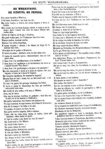 HE KUPU WHAKAMARAMA. HE WHAKATAUKI, HE TITOTITO, HE PEPEHA. Kia mau tautiti o Whatiua. Uwhi tere, horahia; na wai, na oti. He kura kainga e hokia, he kura tangata e kore e hokia. Hei konei ra i to taua kainga, kaore e taea e au te mau: kati i muri nei nou te tuara tetere hei waha ake. Titiro ki Opou, ki te pa o Kaitoa. He pati waka pea, ko Tawharau kia riro noa. Haere maha, mahue maha. Matua i te waka ringaringa. E tama tangata i akona i te whare, te tuna ki te marae tau ana. Werohia ki te poho o Huatare. E tama te atea whakatu noa ra koi atea ana. E tama te kanohi ngaro; whakorekore noa ra koi ngaro ana. I whea koe i te matikaotanga o te kowhai? I whea koe i te tangihanga o te honrenre, ka tanu ai i tetahi kawei hue mau? I whea koe i te ngawhatanga o te pua o te akiraho? He ata marama e kore ai e mau te kiore: he ata tangata e kore ai e mau te tangata. He kopura tipokaia, he manawa tangata. Hoatu koe te kai i mua, ko au hei muri nei e ki ana a Ruarua. Te kai i te ngaro, he putanga whananga ka kitea. E kore e puta te whanaunga ka rau na mahara, rakuraku noa aua. He mahi te ata noho, e ki ana a Wheke. Ana, na te taua. Kia ma te marae, hurihia te pohatu whai iho ma te ahi ka ki te marae e whakaatu. He patu takaukau kia hume kia kakara ai. Te anga karaka, te ana koura, koi kitea ki te marae. Kia iti te manga i te taha o te ahi. Tu pupu, tu naro, tu hao, tu ea. Ka ngaro reoreo tangata, kiki o manu. Taku ahi tu tata, taku mata ki koha, taku ahi mamao, taku mata ki poro. E tipi te waha i uia hoki ko wai ki muri? Ka whati toki o Te Whare. Ka whati toku tuara. . Ka ngaro tatua ki roto. Whanga-pirita whakakaha ngatahi. E rua nga whatu o Matarae. Ko taku tama ka whakairi. Ko whanga te kai i tua o toka rarangi. Haere koe, ka noho tenei he kura, katahi ano ka mau iho. Kati e noho, ka pa ianei he poroporo e hoki mai, tena pea he poroporo e hinga atu. Tena koe ko te rangatira ko Tupurupuru, kia haere noa, a ka whakawharona. Kaore he taua a te kai kia ata kai. Porotiti ra ou mahara, e Toi e. Waiho ma te tangata e mihi kia tau ai. Ka hua au ka ua? Mahara ra au noku anake te rangi) i. He kai titowera rawa hoki nau te wai. He taonga kei te ringaringa. Akuanei a Kino to ai me he ra. Tena te nga tango parahia. Kua heke te ra he kapura koriorio. Te taru nei a Rutawa, te ara o Ninihi. Ki te kainga weratia te karaka ka roria. Ki te inumea weratia te tutu ka rore. He mea mate he hau-whitia. He poti na Uekahia, ma Rogotakutama e kumanu. Ko te po Wairaka i raru ai. E hia ianei o tawhiwhitanga? He matihe ianei, e hoki mai ki te ihu?: Ka rukuruku Huna, ka horahora Papakanui, ka hari Tuma huka nui. Kei rarua koe i te po a Tamaiarehe. . He ao te rangi ka uhia, he huruhuru te manu ka rere. He ao te rangi ka uhia, he pou to Rauru ta tu. He ao te rani ka uhia, he kai te whare wananga ka toroa. E tata mate, e roa taihoa. Me hoatu te mate i roto i Keteriki? He waka, kia herea? Ka hia ko takura waha e tuturu ihorangi. Ka riro te irikura ka waiho te purapura a WH te take o te irikura. Te paku peka tanekaha, te iti kahikatoa. Te toa o te tanata kei runga ko kaeaea. Ko te manu koau nui, kahore ona rangatira, kahore ona aha. Ka konewa haere te tangata. Iti te kopara kai takirikiri ana i runga i te kahikatea. Ko Kotore maumau tangata, maumau taonga. Hauhake tu ka to Matariki. He pakihiwi tanata e kore e mawhaki, tena he pakihiwi kai ko te mea tena e mawhaki. Taku kiri kai matai o Tapuiropa, ka tokia e te hau. Makariri piri noa, tahae mahana he arero. Korero ahiahi, tumata ngaingai. Tutohu ahiahi, whakarere hapara. Haere atu te wahine, haere marokore. Ahiahi mowai, ata roki. Tumutumu parea, rakau parea, whanui; te: ara ki; a Tane. Oti ano tan e mau ko te maro anake, he mokai ahi tere koe. Te patiki taha nui o Tiere, te paua patatoro Tahia, ko te kai tenei o Kahu!) unu.