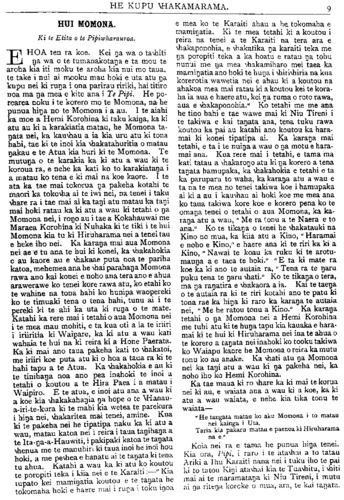 HE KUPU WHAKAMARAMA. 9 HUI MOMONA. Ki te Etita o te Pipiwharauroa. EHOA ten ra koe. Kei nga wa o tawhiti nga wa o te tumanakotanga e ta mou te aroha kia iti moku te aroha kia nui mo taua, te take i nui ai mooku mau hoki e uta atu nga kupu nei ki runga i ona parirau ririki, hai titiro noa ma nga mea e kite ana i Te Pipi. He po- rearea noku i te korero mo te Momona, na- he punua hinga no te Momona i a au. I te aiahi ka moe a Hemi Korohina ki taku kainga, ka ki atu au ki a karakiatia matau, he Momona ta- ngata nei, ka kauwhau a ia kia uru atu ki tona hahi, tae ki te inoi kia whakatahuritia o matau ngakau e te Atua kia huri ki te Momona. Te mutunga o te karakia ka ki atu a wau ki te koroua ra, e nehe ka kati ko to karakiatanga i a matau ko tena e ki mai na koe kaore. I te ata ka tae mai tokorua nga pakeha kotahi te maori ka tokowha ai te iwi nei, na tenei i taku whare ra i tae mai ai ka tangi atu matau ka tangi mai hoki ratau ka ki atu a wau ki tetahi o nga Momona nei, i rongo au i tae a Kokahauwai me Maraea Korohina ki Nuhaka ki te tiki i te hui Momona kia tu ki Hiruharama nei a tenei tau e heke iho nei. Ka karanga mai aua Momona nei ae e tu ana te hui ki konei, ka whakahokia e au kaore au e whakaae puta noa te pariha katoa, mehemea ana he whai parahanga Momona rawa ano kai konei e noho ana tera ano e ahua arawerawe ko tenei kore rawa atu, ko etahi ko te wahine na tona hahi ko hunipa waopereki ko te timuaki tena o tena hahi, tunu ai i te pereki ki te ahi ka uta ki runga o te mate; Katahi ka rere mai i tetahi o aua Momona nei i te mea mau mohiti, e ta kua oti a ia te iriiri i iriiritia ki Waipare, ka ki atu a wau kati wahaia te hui na ki reira ki a Hone Paerata. Ka ki mai ano taua pakeha kati to whakatoi, me iriiri koe puta atu ki o hoa a taua ra ki te hahi tapu a te Atua. Ka whakahokia e au ki te tinihanga noa ano pea inahoki te inoi a tetahi o koutou a te Hira Paea i a matau i Waipiro. E te atua, e inoi atu ana a wau ki a koe kia whakakahangia nga hope o te Whanau- a-iri-te-kura ki te mahi kia wetea te parekura i hina nei, whakaritea mai tenei, amine. Kua ki te pakeha nei he tipatipa naku ka ki atu a wau, matau katoa nei i reira i taua tangihanga a te Ita-nga-a-Hauwiti. i pakipaki katoa te tangata whenua me te manuhin ki taua inoi he inoi hou hoki, a me pewhea e hanatu ai te tangata ki tena tu ahua. Katahi a wau ka ki atu ko koutou te poropiti teka i kiia nei e te Karaiti Kia tupato kei mamingatia koutou e te tangata he tokomaha hoki e haere mai i runa i toku ingoa e mea ko te Karaiti ahau a ha tokomaha e mamingatia. Ki te mea tetahi ki a koutou i reira na tenei a te Karaiti na tera ara e whakaponohia, e whakatika nga karaiti teka me nga poropiti teka a ka hoatu e ratau nga tohu nunui me nga mea whakamiharo mei taea ka mamingatia ano hoki te hunga i whiriwhiria na kua korerotia wawetia nei e ahau ki a koutou na ahakoa mea mai ratau ki a koutou kei te kora- ha ia aua e haere atu, kei nga ruma o roto rawa, aua e whakaponohia." Ko tetahi me me ana he tino hahi e tae wawe mai ki Niu Tireni i te takiwa e kai tangata ana, tena tuku rawa koutou ka pai au katahi ano koutou ka hara- mai ki konei tipatipa ai. Ka karanga mai tetahi, e ta i te nuinga a wau o nga motu e hara- mai ana. Kua rere mai i tetahi, e tama ma kati tatau a whakarongo atu ki nga korero a tena tangata hamupaka, ka whakahokia e tetahi e ta ka paruparu to waha, ka karanga atu a wau e ta na te mea no tenei takiwa koe i hamupaka ai ki a au i kauwhau ai hoki koe me mea ana ko taua takiwa kore koe e korero pena ko te omanga tenei o tetahi o aua Momona, ka ka- ranga atu a wau," Me ra tonu a te Naera e to ana." Ko te tikanga o tenei he whakatauki na Kino no mua, ka kiia atu a Kino, " Haramai e noho e Kino," e haere ana ki te riri ka ki a Kino, " Nawai te koau ka ruku ki te arotu- maunga a e taea te hoki." " E ta ki mate ra koe ka ki ano te autaia ra," Tena ra te ngaru puku tena te ngaru whati." Ko te tikanga o tera, ma nga rangatira e whakaora a ia. Kai te taenga o te autaia ra ki te riri kotahi ano te patu ki tona rae ka hinga ki raro ka karanga te autaia nei, " Me he ratou tonu a Kino." Ka karanga tetahi o nga Momona nei a Hemi Korohina me tuhi atu ki te hunga tapu kia kauaka e hara- mai ki te hui ki Hiruharama nei ina te ahua o te korero a tangata nei inahoki ko tooku takiwa ko Waiapu kaore he Momona o reira ka mutu tonu ko au anake. Ka whati atu nga Momona nei ka tangi atu a wau ki nga pakeha nei, ka noho iho ko Hemi Korohina. Ka tae maua ki ro whare ka ki mai te korua nei ki au, e waiata ana a wau ki a koe, ka ki atu a wau waiata, e nehe kia tika tonu te waiata— - He tangata matau ko aku Momona i to matau nei kainga i Uta, Taria kia pakaru matau e paenoa ki Hiruharama na e." Koia nei ra e tama he punua hinga tenei. Kia ora, Pipi, i raru i te atawhai a to tatau Ariki a Ihu Karaiti nana nei i tuku iho te pai ki to tatou Kingi atawhai kia te Tuawhitu, i whiti mai ai te maramatanga ki Niu Tireni, i mutu ai na ritenga koroke o mua, ara, te kai tangata.