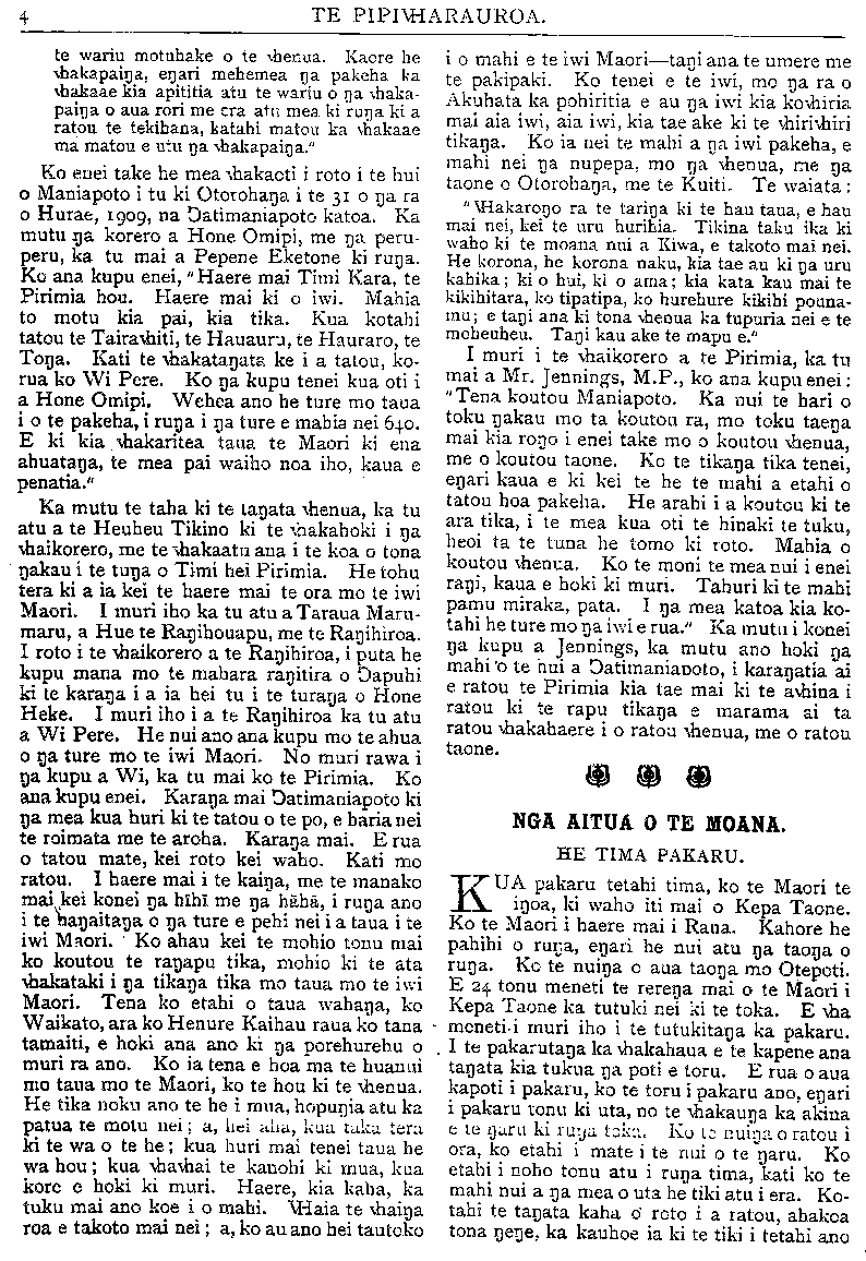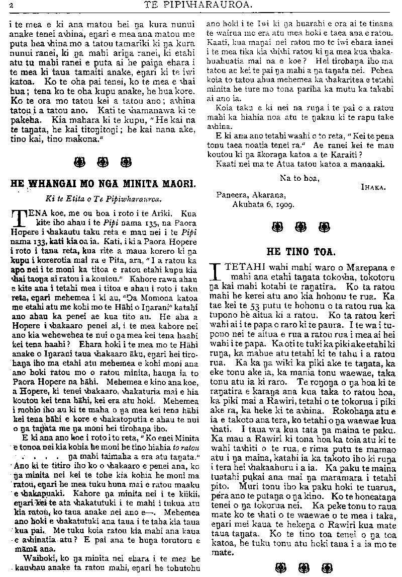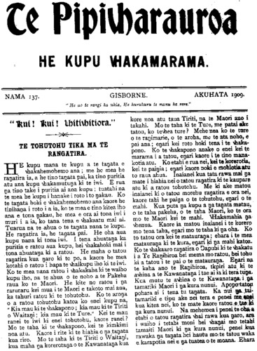 Te Pipiwharauroa HE KUPU WHAKAMARAMA NAMA 137 GISBORNE. "He ao te rangi ka uhia, He huruhuru te manu ka rere." AKUHATA 1909. "Kui! Kui! Whitiwhitiora." TE TOHUTOHU TIKA MA TE RANGATIRA. HE kupu mana te kupu a te tangata e whakahemohemo ana; me he mea he rangatira ia, a he tino tangata pai, ka tino puritia atu ana kupu whakamutunga ki te iwi. E rua nga tino take i puritia ai ana kupu; tuatahi na te mea he kupu i hanake i roto i to ngakau. Ko te tangata hoki e whakahemohemo ana kaore he tinihanga i roto i a ia, ko te mea e tino kitea iho ana e tona ngakau, he mea e ora ai tona iwi i muri i a ia, ko tana tena e whakaatu mai ai. Tuarua na te ahua o te tangata nana te kupu. He rangatira ia, he tangata pai. He oha aua kupu nana ki tona iwi. I tena ahuatanga ka puritia e ratou aua kupu, hei whakahoki mai i tona ahuatanga ki a ratou. He maha o tatou rangatira kua ngaro ki te po, a kaore he mea kotahi o ratou i hapa te whaikupu iho ki te iwi. Ko te mea nana ratou i whakakaha ki te waiho kupu iho, na te ahua o te noho a te Pakeha raua ko te Maori. He kite no ratou i nga raruraru kei mua i te Maori e takoto mai ana, ka tahuri ratou ki te tohutohu. Ko te aronga o a ratou tohutohu katoa ko enei kupu na, " Kia mau ki te whakapono; kia mau ki te Tiriti o Waitangi; kia mau ki te Ture." Kei te mau ranei te iwi ki enei tohutohu, kaore ranei? Mo te taha ki te whakapono, kei te kimkimi noa atu. Kaore i rite ki te hiahia o nga tangata kua riro. Mo te taha ki te Tiriti o Waitangi, kua maha nga korerotanga o te Kawanatanga kua kore noa atu taua Tiriti, na te Maori ano i takahi. Mo te taha ki te Ture, me patai ake tatou, ko tewhea ture? Mehemea ko te ture o te rangimarie, o te aroha, me te ata noho, e pai ana; engari kei roto hoki tena i te whaka- pono. Ko te whakapono anake o enei kei te marama i a tatou, engari kaore i te ano mana- kotia atu. Ko etahi e rua nei, kei te korerotia, kei te paingia; engari kaore noki e mohiotia atu to raua ahua. Inaianei kua tata rawa mai na mate i hiahia hei o tatou rangatira ki te kaupare atu ki a ratou tohutohu. Me ki ake matou inaianei ki o tatou morehu rangatira e ora nei, kaore tahi he painga o te tohutohu, engari o te mahi. Kua puta nga kupu a nga tangata matau, o te taha pakeha, o te taha Maori, ko te ora mo te Maori kei te mahi. Whakamahia na whenua. Kaore ia matou inaianei i te korero mo tena taha, engari mo te taha ki nga oha. Ko to tatou ora kei te matauranga; ehara i te mea matauranga ki te kura, engari ki nga mahi katoa. Ko te whakaaro rangatira o Ngapuhi ki te whakatu i a Te Rangihiroa hei mema mo ratou, hei tohu ki a tatou i te pai o te matauranga. Engari na te kaha ano te Rangihiroa, tapiri atu ki te awhina a te Kawanatanga i tae ai ia ki tera tuna. Kua mutu te awhina o te Kawanatanga i, nga tamariki Maori i nga kura nunui. Apopo tatou pohara ai i tena tu tangata. Ka nui nga, tai. tamariki e tipu ake nei tera e penei me enei kua kitea nei, ko te mate kaore ratou; e, tae ki nga kura nunui. Na mehemea i penei te oha a etahi o tatou rangatira whai rawa kua ngaro, ara i waiho i tetahi moni hei whangai mo tetahi tamaiti Maori ki nga kura nunui, penei kua rawaka nga tangata hei hautu mo te tatou waka e. karapotia nei e nga tuatea o te moana. Ehara