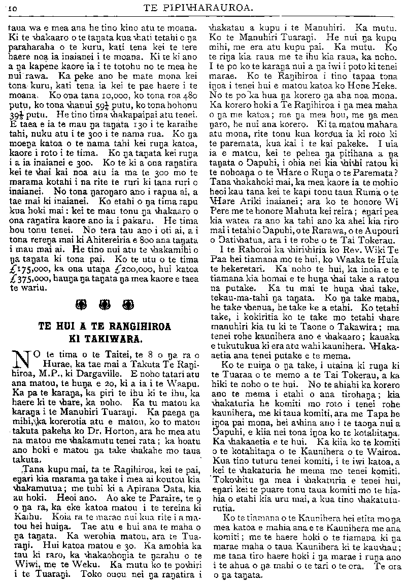 TE PIPIWHARAUROA. taua wa e mea ana he tino kino atu te moana. Ki te whakaaro o te tangata kua whati tetahi o nga paraharaha o te kuru, kati tena kei te tere haere noa ia inaianei i te moana. Ki te ki ano a nga kapene kaore ia i te totohu no te mea he nui rawa. Ka peke ano he mate mona kei tona kuru, kati tena ia kei te pae haere i te moana. Ko ona tana 10, 000, ko tona roa 480 putu, ko tona whanui 59¼ putu, ko tona hohonu 39 1/3 putu. He tino tima whakapaipai atu tenei. E taea e ia te mau nga tangata 130 i te karaihe tahi, nuku atu i te 300 i te nama rua. Ko nga moenga katoa o te nama tahi kei runga katoa, kaore i roto i te tima. Ko nga tangata kei runga i a ia inaianei e 300. Ko te ki a ona rangatira kei te whai kai noa atu ia ma te 300 mo te marama kotahi i na rite te ruri ki tana ruri o inaianei. No tona ngarongaro ano i rapua ai, a tae mai ki inaianei. Ko etahi o nga tima rapu kua hoki mai: kei te mau tonu nga whakaaro o ona rangatira kaore ano ia i pakaru. He tima hou tonu tenei. No tera tau ano i oti ai, a i tona rerenga mai ki Ahitereiria e 800 ana tangata i mau mai ai. He tino nui atu te whakamihi o nga tangata ki tona pai. Ko te utu o te tima £175,ooo, ka ona utanga £200, 000, hui katoa £375>ooo, haunga nga tangata nga mea kaore e taea te wariu. TE HUI A TE RANGIHIROA KI TAKIWARA. NO te tima o te Tahei, te 8 o nga ra o Hurae, ka tae mai a Takuta Te Rangi- hiroa, M.P., ki Dargaville. E noho tatari atu ana matou, te hunga e 20, ki a ia i te Waapu. Ka pa te karanga, ka piri te ihu ki te ihu, ka haere ki te whare, ka noho. Ka tu matou ka karanga i te Manuhiri Tuarangi. Ka paenga nga mihi, ka korerotia atu e matou, ko to matou takuta pakeha ko Dr. Horton, ara he mea atu na matou me whakamutu tenei rata; ka hoatu ano hoki e matou nga take whakahe mo taua takuta. , Tana kupu mai, ta te Rangihiroa, kei te pai, engari kia marama nga take i mea ai koutou kia whakamutua; me tuhi ki a Apirana Ngata, kia au hoki. Heoi ano. Ao ake te Paraire, te 9 o nga ra, ka eke katoa matou i te tereina ki Kaihu. Koia ra te marae nui kua rite i a ma- tou hei huinga. Tae atu e hui ana te maha o nga tangata. Ka werohia matou, ara te Tua- rangi. Hui katoa matou e 30. Ka amohia ka tau ki raro, ka whakaohongia te ngarahu o te Wiwi, me te Weku. Ka mutu ko te powhiri i te Tuarangi. Toko ouou nei nga rangatira i whakatau a kupu i te Manuhiri. Ka mutu. Ko te Manuhiri Tuarangi. He nui nga kupu mihi, me era atu kupu pai. Ka mutu. Ko te ringa kia raua me te ihu kia raua, ka noho. I te po ko te karanga nui a nga iwi i poto ki tenei marae. Ko te Rangihiroa i tino tapaa tona ingoa i tenei hui e matou katoa ko Hone Heke. No te po ka hua nga korero nga aha noa mona. Ka korero hoki a Te Rangihiroa i nga mea maha o nga me katoa; me nga mea hou, me nga mea ngaro, he nui ana korero. Ki ta matou mahara atu mona, rite tonu kua koroua ia ki roto ki te paremata, kua kai i te kai pakeke. I uia ia e matou, kei te pehea nga pitihana a nga tangata o Ngapuhi, i ohia nei kia whiwhi ratou ki te nohoanga o te Whare o Runga o te Paremata? Tana whakahoki mai, ka mea kaore ia te mohio heoi kau tana kei te kapi tonu taua Ruma o te Whare Ariki inaianei; ara ko te honore Wi Pere me te honore Mahuta kei reira; engari pea kia watea ra ano ka tahi ano ka ahei kia riro mai i tetahi o Ngapuhi, o te Rarawa, o te Aupouri o Ngatiwhatua, ara i te rohe o te Tai Tokerau. I te Rahoroi ka whiriwhiria ko Rev. Wiki Te Paa hei tiamana mo te hui, ko Waaka te Huia te hekeretari. Ka noho te hui, ka inoia e te tiamana kia homai e te hunga whai take a ratou na putake. Ka tu mai te hunga whai take, tekau-ma-tahi nga tangata. Ko nga take maha, he take whenua, he take ke a etahi. Ko tetahi take, i kokiritia ko te take mo tetahi whare manuhiri kia tu ki te Taone o Takawira; ma tenei rohe kaunihera ano e whakaaro; kauaka e tukutukua ki era atu wahi kaunihera. Whaka- aetia ana tenei putake e te mema. Ko te nuinga o nga take, i utaina ki runga ki te Tuaraa o te memo a te Tai Tokerau, a ka hiki te noho o te hui. No te ahiahi ka korero ano te mema i etahi o ana tirohanga; kia whakaturia he komiti mo roto i tenei rohe kaunihera, me ki taua komiti, ara me Tapa he ingoa pai mona, hei awhina ano i te taonga nui a Ngapuhi, e kiia nei tona ingoa ko te kotahitanga. Ka whakaaetia e te hui. Ka kiia ko te komiti o te kotahitanga o te Kaunihera o te Wairoa. Kua tino tuturu tenei komiti, i te iwi katoa, a kei te whakaturia he mema mo tenei komiti. Tokowhitu nga mea i whakaturia e tenei hui, engari kei te puare tonu taua komiti mo te hia- hia o etahi kia uru mai, a kua tino whakatutu- rutia. Ko te tiamana o te Kaunihera hei etita mo nga mea katoa e mahia ana e te Kaunihera me ana komiti; me te haere hoki o te tiamana ki nga marae maha o taua Kaunihera ki te kauwhau; me tana tiro haere hoki i nga marae i runga ano i te ahua o nga mahi o te tari o te ora. Te ora o nga tangata.