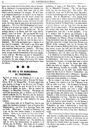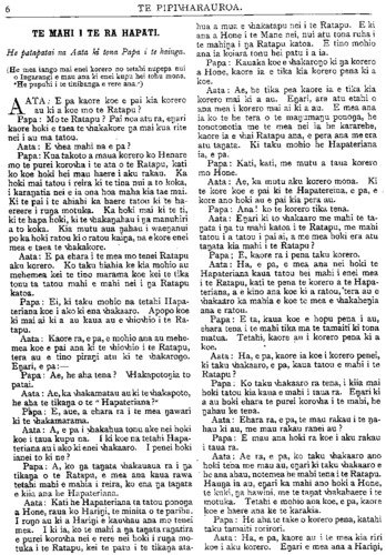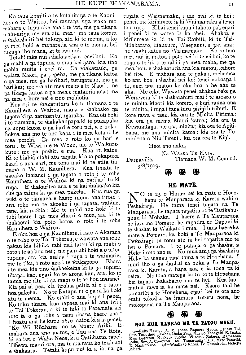 HE KUPU WHAKAMARAMA. 11 Ko taua komiti o te kotahitanga o te Kauni- hera o te Wairoa, hei tauranga unga waka mo mahara e tupu ake ana i te iwi, me nga tikanga mahi-aringa me era atu mea; ma taua komiti e whakawhaiti hei tukunga atu ki te mema, a ko nga mea hoki e maharatia ana e te mema, hei tukunga iho mana, ki te iwi nui. Tetahi take nui i whakaaetia e tenei hui. Ko nga mahi a nga tupuna o mua kei ngaro, kia tino mahia nuitia i enei ra. Nga whakatauki, nga waiata Maori, nga pepeha, me nga tikanga katoa o nga mea, me nga harihari, tutungarahu, me nga hari kai; me era atu mea maha te Maori; me nga tikanga katoa o nga mea e matauria ana; me nga mea e kore nei e tino mohiotia. Kua oti te whakatuturu ko te tiamana o te Kaunihera o Wairoa, mana e whakaako nga tangata ki nga harihari tutungaraha. Kua oti hoki i te tiamana, te whakakaupapa ki te pukapuka nga kupu katoa o nga hari e toru nei, a e hoko- hokoa ana mo te ono kapa i te mea kotahi, he mea perehi. Nga mea o roto ko nga hari e toru; te Wiwi me te Weku, me te Waikure- kure; me nga powhiri e rua. Kua oti katoa. Ki te hiahia etahi atu tangata ki aua pukapuka kaari o aua hari, me tono mai ki te etita tia- mana o W. M. Kaunihera. Kua timata te akoako inaianei i nga tangata o roto i te rohe Kaunihera o te Wairoa ki nga harihari tu ki runga. E whakaritea ana e te kai whakaako kia rite nga taima ki nga mea pakeha. Kua rua nga wiki o te tiamana e haere rauna ana i roto i ana rohe mo te akoako i nga tangata, wahine, tane, kia mohio: Me te mahi ano hoki ki te tuhi haere i nga mea Maori o mua, ara ki te whakaemi kia poto katoa o roto i te rone Kaunihera o Wairoa. E oku hoa o nga Kaunihera, i raro o Akarana o te rohe o te Tai Tokerau, e wawata ana toku ngakau kia hihiko tahi mai tatou ki nga mahi o roto i te ao hou nei; me nga mahi hoki a o tatou tupuna, ara kia mahia i runga i te waimarie, me te tika, i roto ano i te whakapono. Ehara i te mea kia tino whakaekeina ki ta nga tupuna tikanga, kao, engari ko te aronga kau, ara, ko te taima me rite ki nga mahi o te ao hou inaianei. Kia pai ai pea, kia tirohia paitia ai e o tatou hoa pakeha. No te Ratapu 11 o nga ra ka hoki atu te mema. Ko etahi o ana kupu i penei, Ko toku tinana kua tapaea mai ki ana iwi i te Tai Tokerau, a ki te hiki to Paremata kei roto ia o nga rohe o tana tinana haere ana." I hoatu ana he kupu h6, e matou ki a ia penei, "Ko Wi Rikihana mo te Whare Ariki. E mahara ana ano matou, e Tau ana Te Rota, ki nga iwi o Waka Nene, ki a Ngatiwhatua ranei. Tihewa mauri ora, ma te ata raua ko te ahiahi e whakaatu. Tetahi kupu nui ki a ia, na nga tangata o Waimamaku, i tae mai ki te hui; penei, me kirihimete ia ki Waimamaku a tenei tau 1909. Kihai tenei kupu i takoto pai engari i penei ki te watea ia ka ahei. Ahakoa e kirihimete ia ki te Tai-Rawhiti, ki te Tai- Whakararo, Hauauru, Waenganui, e pai ana; he waahi katoa no Waimamaku. Ko te tino mea nui ia matou i poto nei ki tenei hui, ko te rongo o te iti, o te rahi i nga mea maha, me nga mea hou, e whakaaturia ana kia matou, kahore hei rite. E mahara ana te ngakau, mehemea ko ana hoa, i whawhai nei kei tenei nohoanga i tu, enei noa matou ko oku hoa a he aha te aha. Me toku Wawata penei, ahakoa heke nga Werawera ki te whakatahuri mai i te aroaro o te minita Maori kia korero, e huri rauna ana te minita, i runga i tana turu piringi hurihuri. E kore rawa e taea, kia ora te Minita Pirimia: kia ora nga mema Maori katoa; kia ora te Kawanatanga, me ana minita; kia ora te Apiti- hana, me ana minita katoa; kia ora te To- miniona o Niu Tireni; kia ora roa te Kingi. Heoi ano naku, Na WAAKA TE HUIA, Dargaville, Tiamana W. M. Council. 3/8/1909. HE MATE. NO te 25 o Hurae nei ka mate a Hone- hana te Mauparaoa ki Karetu wahi o Pewhairangi. He tama tenei tangata na Te Mauparaoa, he tangata rangatira no te Ngatikahu- ngunu ki Mohaka. I haere a Te Mauparaoa he hoa mo Pomare, he rangatira no Ngapuhi ki te whawhai ki Waikato i mua. I taua haere ka mate a Pomare, ka hoki a Te Mauparaoa ki Pewhairangi, tu tonu atu ia hei rangatira mo te iwi o Pomare. I te putanga o nga whawhai a Heke i roto ano ia. No mua atu i nga whawhai a Heke ka whanau tana tama a te Honehana. I muri iho o nga whawhai ka nuku a Te Maupa- raoa ki Karetu, a hanga ana e ia tona pa ki reira. No tona matenga ka tu ko te Honehana hei tangata whakahaere mo te iwi. Kua kau- matua rawa ia ka mate nei. Kaore tahi he tamariki a te Honehana, engari kei te ora ano etahi tokowha he iramutu tuturu nona, he mokopuna na Te Mauparaoa. NGA HUA KAREAO MA TA TATOU MANU. 5/—Ruka Haenga, A. M. Tones, Rapaera Haora, Taurau Toi, Rev. Timutimu Tawhai, Ihaka Pera, Mariao Taongaiti, K. Ihaka. Miss Brereton, Ngakete Tutoko, Wiremu Rokena, Hamahona' Puha, Rev. A. Compton. 10/—Tamaranga Taua, Mere Patariki, D. MacFarlane. 2/6 Waaka te Ranui Te Tamairoha, Hohepa Rihari.