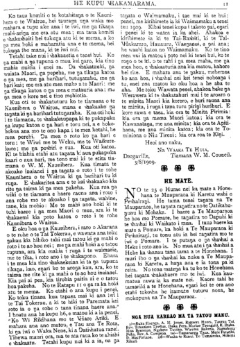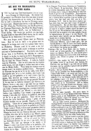 HE KUPU WHAKAMARAMA. HE HUI NA MANIAPOTO MO TIMI KARA. ITU he hui ma Ngatimaniapoto i te 31 o nga ra o Hurae ki Otorohanga. Ko tenei hui he powhiri i te Pirimia hou kia tae mai ki tenei takiwa, kia korerotia ai te mate o te whenua. No te tahi o Akuhata ka tae te Pirimia ratou ko tona ope. Haere ake ratou:—Ko te Pirimia, ko Wi Pere, ko Te Heuheu, ko Te Rangihiroa, ko Taraua Marumaru, ko Hue Te Rangihoapu, ko Mr. Jennings, M.P., me te hekeretari a Timi Kara. Ka mutu nga powhiri me nga tangi, ka pae hoki te manuhiri kite whare, ka tu mai a Taonui ki te whakatau i te manuhiri. Ko ana kupu enei, "Hare mai te Pirimia hou. Kei te nui te mihi o te ngakau mo to taenga ki te tunga nui o te iwi ngakau kino nei o te Pakeha. Haere mai ki te enei o te iwi mokai, tenei ano hoki etahi o tikanga e puritia atu nei e Ngatimaniapoto." Ka mutu ana kupu ki nga hoa o te Pirimia, ka hikitia te waiata. I muri i a ia ka tu mai ko te Hihi Rangiwhenua, ko Whitinui Hohepa, ko Poututerangi te Tomo. Ka tu mai ko Hone Omipi. I mea ia, haere mai te Pirimia. Kei te nui noa atu ta matou mihi mou, mo nga mate e waha mai nei e koe, me te Motu hoki. Tino koa atu matou mo to taenga mai i ta matou powhiri mou. Na runga i te mamae ka pa ki te iti ki te rahi, koia koe i karangatia atu ai e o iwi mokai, mo runga i nga mahi a nga iwi pakeha e ki nei i roto i nga nu- pepa, kia murua nga toenga whenua o te iwi Maori, moumou te whenua mo nga paraki Maori. E ki nei kei te takoto mangere nga whenua o te Maori, kore e utu ana i nga reiti me nga taake. Tena me pewhea koia? E hereheretia tonutia nei hoki o matou ringaringa me o matou waewae. Kaore koia matou nga Maori e utu ana i nga huka, i nga tupeka, i nga maati, i nga pata, i nga taonga, i era atu tini mea a te pakeha, kia tika ai te ki a nga iwi pakeka. Kati na te kore kaore he ture herehere mona i pena ai ana korero moku mo te paraki Maori, e ki nei nga pakeha. Otira ki te puare mai nga peeke moni ki te Maori, ka rue tonu ki te pakeha te Maori. Tena i ana e Timi, tukua mai nga peeke moni a te Kawanatanga ki nga iwi Maori o te motu nei. Hanga he ture mo nga whenua kia pai, mau tonu e mahi, kia rite ki te hiahia o nga Maori, pera me nga ture e takoto nei mo nga iwi nohonoho whenua o te pakeha. Ki te oti enei hei tare, ka whakaae matou ki te utu i nga reiti, me nga taake. He nui nga tikanga o te mate o te Maori i roto i nga ture huhua a te pakeha, tai- hoa ena e whakararangi atu, ma te motu nei e hoatu ki to ringa. Tenei ta matou ka hoatu. "E te Honore Timi Kara, Pirimia o te Tominiona o Niu Tireni E pa tena koe. Kei te tino nui ta matou whakamini mou kua tu nei i runga i te turanga nui e taea te whakawhiwhi ki ona kai hautu e 15 a iwi o te Tominiona. Tena koutou me o hoa mema, ko Wi Pere, ko Te Rangihiroa, me o koutou hoa rangatira o nga iwi nunui o te motu, kua tae mai nei; hui atu ki a Mr. Jennings, M.P. Kei te tino koa o matou nga- kau mou kua tae mai nei i runga i te pohiri a Ngatimaniapoto. Ko nga tino take i mahara ai matou kia karangatia atu koe, ehara i te take e pa ana ki a matou anake, en ari he take e pa ana ki nga iwi Maori katoa o te motu nei; a ko aua take kei te mahia e te taha pakeha kia pa te taimahatanga ki runga i te iwi Maori; ite mea kaore ano i takoto pai na tikanga whaka- haere mo o matou whenua. Tuatahi Ko te Tekiona II o te Ture whaka- nohonoho whenua, 1907 e mea ana, Ko nga whenua katoa e riro ki raro i te Poari whenua o iia takiwa me wahi tonu i waenanui, he hawhe mo te hoko, he hawhe mo te nihi.' Tuarua.—Ko nga Ture Reiti, me na Taake, e mahi nei te taha pakeha, kia whakaekea ki runga i nga whenua Maori, i te mea kaore ano i takoto he tikanga marama e taea ai te mahi na whenua; kia whiwhi i te painga o te whenua na Maori. Tuatoru.—Kia mahia he Ture Whakapuare i nga peeke moni ki na Maori ahu whenua, ka tika kia utu nga Maori i nga reiti me na taake, kia pera me nga pakeha e puare nei na peeke ki nga iwi ahu whenua. Tuawha.—Ko nga Taone Maori. Ko nga taitara e tono nei nga pakeha kia whakarereketia, a kia wehea hoki etahi o nga moni reti hei utu i na whakapainga o aua taone. Na ko matou, tenei wehena o te iwi Maori e noho tahi nei me te iwi pakeha i raro i te maru o te kingitanga o Igarani, kaore e hiahia kia araitia nga tikanga e tipu haere ai te Tominiona. Oti ra kaore matou e pai kia tipu haere aua tikanga i roto i te pa mai o te mate ki a matou. Ko to matou hiahia mo nga take kua whakararangitia ake nei koia tenei:— Mo te take tuatahi. Me patu rawa te Tekiona II o te Ture Whakanohonoho whenua Maori, 1907, a me whakahaere nga whenua e te Poari whenua i raro i te rarangi 17 o te Ture Whakanohonoho Whenua Maori 1905. Mo nga take tuarua, tuatoru. Mehemea ka whakapuaretia ki te iwi Maori na huarahi nama moni i runga i ua huarahi ngawari e puare nei i te Kawanatanga ki nga iwi noho whenua o te pa- keha kia taea ai nga mahi ahu whenua i runa i a te pakeha whakahaere i raro ano hoki i na tikanga tupato kei kore whenua na Maori, ka tino whakaae matou ki te utu nihi, taake hoki. Take tuawha. Kaore matou e pai kia whaka- rereketia nga whakahaere o nga taone Maori. Me waiho tonu i tenei ahua e mau nei, Kaore ano hoki matou e whakaae kia tangohia etahi o nga moni reti i runga i te hiahia o nga pakeha e mea nei hei whakapai i aua taone. Ko te take, ko aua taone i maketetia nga tekihana i runga i