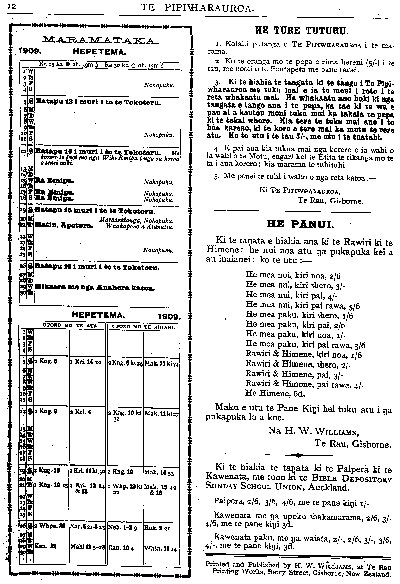 TE PIPIWHARAUROA. HE TURE TUTURU. 1. Kotahi putanga o TE PIPIWHARAUROA i te ma- rama. 2. Ko te oranga mo te pepa e rima hereni (5/-) i te tau, me nooti o te Poutapeta me pane ranei, auaka i te tiaki he pane kingi hepene nga pane e tino hiahiatia ana. 3. Ki te pau nga hereni a tetahi tangata i tuku mai ai ka tukua atu he kaute. Ki te tae atu te kaute kia hohoro te tuku mai i te moni, na te moni hoki i puta atu ai te pepa ehara i te mea tupu noa. 4. E pai ana kia tukua mai nga korero o ia wahi o ia wahi o te Motu, engari kei te Etita te tikanga mo te ta i aua korero : kia marama te tuhituhi. 5. Me penei te tuhi i waho o nga reta katoa: — Ki TE PIPIWHARAUROA, Te Rau, Gisborne. HE PANUI Ki te tangata e hiahia ana ki te Rawiri ki te Himene : he nui noa atu nga pukapuka kei a au inaianei : ko te utu : — He mea nui, kin noa ... 2/6 He mea nui, kiri wher ... 3/- He mea nui, kiri pai ... 4/— He mea nui kiri pai rawa ... 5/6 H e mea paku, kiri whero ... 1/6 H e mea paku, kiri pai . . . 2/6 He mea paku, kiri noa ... 1/- He mea paku, kiri pai rawa 3/6 Rawiri & Himene, kiri noa 1/6 Rawiri & Himene, whero ... 2/- Rawiri & Himene, pai ... 3/- Rawiri & Himene, pai rawa 4/- He Himene ... ... -/6 Maku e utu te Pane Kingi hei tuku atu i nga pukapuka ki a koe. Na H. W. WILLIAMS, Te Rau, Gisborne. Ki te hiahia te tangata ki te Paipera ki te, Kawenata, me tono ki te BIBLE DEPOSITORY SUNDAY SCHOOL UNION, Auckland. Paipera, 2/6, 3/6, 4/6, me te pane kingi //- Kawenata me nga upoko whakamarama 2/6 3/- 4/6, me te pane kingi 3d. Kawenata paku, me nga waiata 2/-, 2/6, 3/-, 3/6, 4/-, me te pane kingi, 3d. Printed and Published by H. W. WILLIAMS, at Te Rau Printing Works, Berry Street, Gisborne, New Zealand.