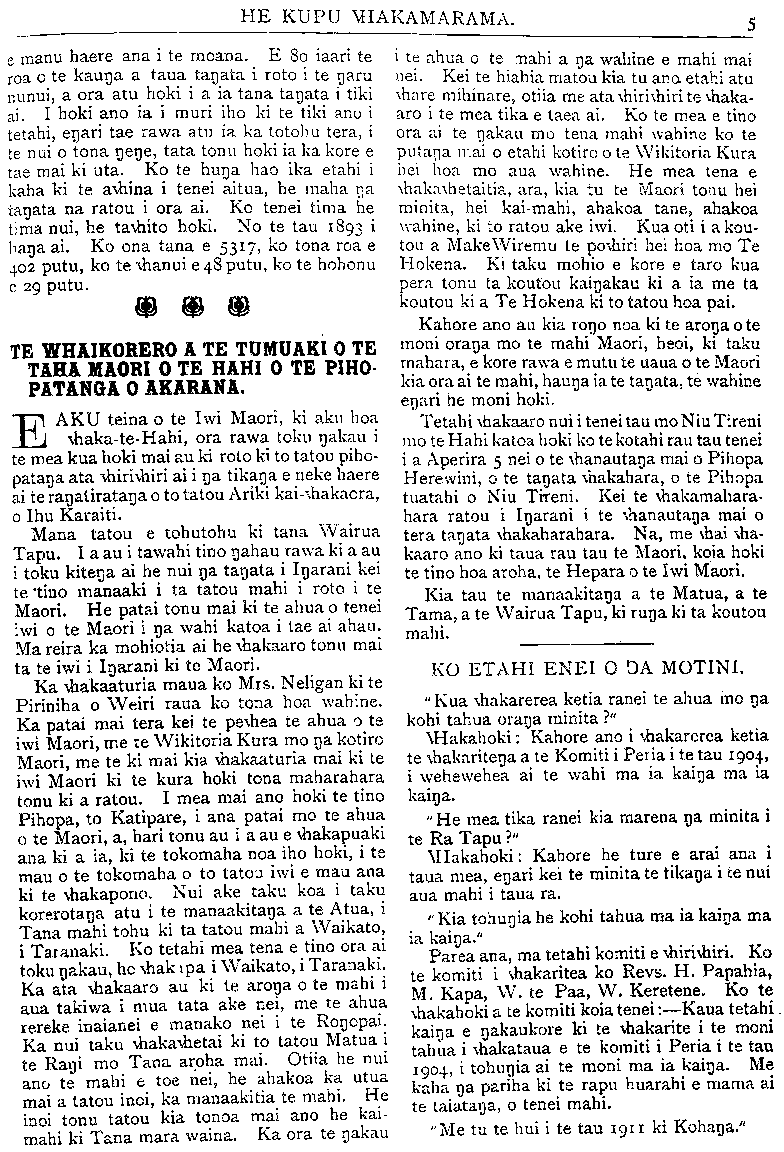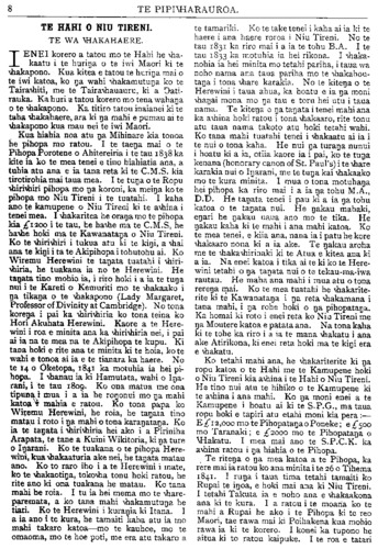 HE KUPU WHAKAMARAMA. e manu haere ana i te moana. E 8o iaari te roa o te kaunga a taua tangata i roto i te ngaru nunui, a ora atu hoki i a ia tana tangata i tiki ai. I hoki ano ia i muri iho ki te tiki anu i tetahi, engari tae rawa atu ia ka totohu tera, i te nui o tona ngenge, tata tonu hoki ia ka kore e tae mai ki uta. Ko te hunga hao ika etahi i kaha ki te awhina i tenei aitua, he maha na tangata na ratou i ora ai. Ko tenei tima he tima nui, he tawhito hoki. No te tau 1893 i hanga ai. Ko ona tana e 5317, ko tona roa e 402 putu, ko te whanui e 48 putu, ko te hohonu e 29 putu. TE WHAIKORERO A TE TUMUAKI O TE TAHA MAORI O TE HAHI O TE PIHO PATANGA O AKARANA. E AKU teina o te Iwi Maori, ki aku hoa whaka-te-Hahi, ora rawa toku ngakau i te mea kua hoki mai au ki roto ki to tatou piho- patanga ata whiriwhiri ai i nga tikanga e neke haere ai te rangatiratanga o to tatou Ariki kai-whakaora, o Ihu Karaiti. Mana tatou e tohutohu ki tana Wairua Tapu. I a au i tawahi tino ngahau rawa ki a au i toku kitenga ai he nui nga tangata i Ingarani kei te tino manaaki i ta tatou mahi i roto i te Maori. He patai tonu mai ki te ahua o tenei iwi o te Maori i nga wahi katoa i tae ai ahau. Ma reira ka mohiotia ai he whakaaro tonu mai ta te iwi i Ingarani ki te Maori. Ka whakaaturia maua ko Mrs. Neligan ki te Piriniha o Weiri raua ko tona hoa wahine. Ka patai mai tera kei te pewhea te ahua o te iwi Maori, me te Wikitoria Kura mo nga kotiro Maori, me te ki mai kia whakaaturia mai ki te iwi Maori ki te kura hoki tona maharahara tonu ki a ratou. I mea mai ano hoki te tino Pihopa, to Katipare, i ana patai mo te ahua o te Maori, a, hari tonu au i a au e whakapuaki ana ki a ia, ki te tokomaha noa iho hoki, i te mau o te tokomaha o to tatou iwi e mau ana ki te whakapono. Nui ake taku koa i taku korerotanga atu i te manaakitanga a te Atua, i Tana mahi tohu ki ta tatou mahi a Waikato, i Taranaki. Ko tetahi mea tena e tino ora ai toku ngakau, he whakapai i Waikato, i Taranaki. Ka ata whakaaro au ki te aronga o te mahi i aua takiwa i mua tata ake nei, me te ahua rereke inaianei e manako nei i te Rongopai. Ka nui taku whakawhetai ki to tatou Matua i te Rangi mo Tana aroha mai. Otiia he nui ano te mahi e toe nei, he ahakoa ka utua mai a tatou inoi, ka manaakitia te mahi. He inoi tonu tatou kia tonoa mai ano he kai- mahi ki Tana mara waina. Ka ora te ngakau te ahua o te mahi a nga wahine e mahi mai nei. Kei te hiahia matou kia tu ana etahi atu whare mihinare, otiia me ata whiriwhiri te whaka- aro i te mea tika e taea ai. Ko te mea e tino ora ai te ngakau mo tena mahi wahine ko te putanga mai o etahi kotiro o te Wikitoria Kura hei hoa mo aua wahine. He mea tena e whakawhetaitia, ara, kia tu te Maori tonu hei minita, hei kai-mahi, ahakoa tane, ahakoa wahine, ki to ratou ake iwi. Kua oti i a kou- tou a Make Wiremu te powhiri hei hoa mo Te Hokena. Ki taku mohio e kore e taro kua pera tonu ta koutou kaingakau ki a ia me ta koutou ki a Te Hokena ki to tatou hoa pai. Kahore ano au kia rongo noa ki te aronga o te moni oranga mo te mahi Maori, heoi, ki taku mahara, e kore rawa e mutu te uaua o te Maori kia ora ai te mahi, haunga ia te tangata, te wahine engari he moni hoki. Tetahi whakaaro nui i tenei tau mo Niu Tireni mo te Hahi katoa hoki ko te kotahi rau tau tenei i a Aperira 5 nei o te whanautanga mai o Pihopa Herewini, o te tangata whakahara, o te Pihopa tuatahi o Niu Tireni. Kei te whakamahara- hara ratou i Ingarani i te whanautanga mai o tera tangata whakaharahara. Na, me whai wha- kaaro ano ki taua rau tau te Maori, koia hoki te tino hoa aroha, te Hepara o te Iwi Maori. Kia tau te manaakitanga a te Matua, a te Tama, a te Wairua Tapu, ki runga ki ta koutou mahi. KO ETAHI ENEI O NGA MOTINI. " Kua whakarerea ketia ranei te ahua mo nga kohi tahua oranga minita?" Whakahoki: Kahore ano i whakarerea ketia te whakaritenga a te Komiti i Peria i te tau 1904 i wehewehea ai te wahi ma ia kainga ma ia kainga. " He mea tika ranei kia marena nga minita i te Ra Tapu?" Whakahoki: Kahore he ture e arai ana i taua mea, engari kei te minita te tikanga i te nui aua mahi i taua ra. " Kia tohungia he kohi tahua ma ia kainga ma ia kainga." Parea ana, ma tetahi komiti e whiriwhiri. Ko te komiti i whakaritea ko Revs. H. Papania, M. Kapa, W. te Paa, W. Keretene. Ko te whakahoki a te komiti koia tenei:—Kaua tetahi kainga e ngakaukore ki te whakarite i te moni tahua i whakataua e te komiti i Peria i te tau 1904, i tohungia ai te moni ma ia kainga. Me kaha nga pariha ki te rapu huarahi e mama ai te taiatanga, o tenei mahi. "Me tu te hui i te tau 1911 ki Kohanga."