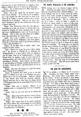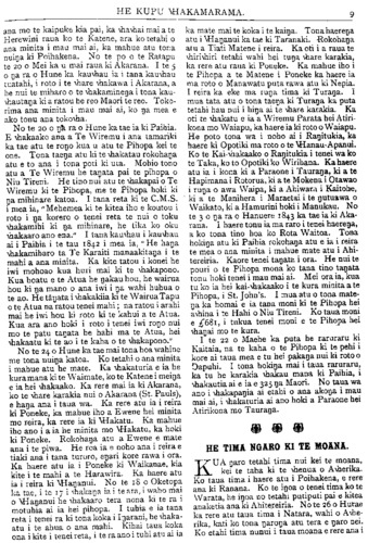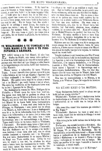 HE KUPU WHAKAMARAMA. 9 ana mo te kaipuke kia pai, ka whawhai mai a te Herewini raua ko te Katene, ara ko tetahi o ana minita i mau mai ai, ka mahue atu tona nuinga ki Poihakena. No te po o te Ratapu te 20 o Mei ka u mai raua ki Akarana. I te 5 o nga ra o Hune ka kauwhau ia i tana kauwhau tuatahi, i roto i te whare whakawa i Akarana, a he nui te miharo o te whakaminenga i tona kau- whautanga ki a ratou he reo Maori te reo. Toko- rima ana minita i mau mai ai, ko nga mea e ako tonu ana tokowha. No te 20 o nga ra o Hune ka tae ia ki Paihia. E whakaako ana a Te Wiremu i ana tamariki ka tae atu te rongo kua u atu te Pihopa kei te one. Tona taenga atu ki te whakatau rokohanga atu e to ana i tona poti ki uta. Mohio tono atu a Te Wiremu he tangata pai te pihopa o Niu Tireni He tino nui atu te whakapai o Te Wiremu ki te Pihopa, me te Pihopa hoki ki nga mihinare katoa. I tana reta ki te C.M.S. i mea ia, " Mehemea ki te kitea iho e koutou i roto i nga korero o tenei reta te nui o toku whakamihi ki nga mihinare, he tika ko oku whakaaro ano ena." I tana kauwhau i kauwhau ai i Paihia i te tau 1842 i mea ia, " He hanga whakamiharo ta Te Karaiti manaakitanga i te mahi a ana minita. Ka kite tatou i konei he iwi mohoao kua huri mai ki te whakapono. Kua hoatu e te Atua he ngakau hou, he wairua hou ki nga mano o ana iwi i nga wahi huhua o te ao. He tangata i whakakiia ki te Wairua Tapu o te Atua na ratou tenei mahi; na ratou i arahi mai he iwi hou ki roto ki te kahui a te Atua. Kua ara ano hoki i roto i tenei iwi rongo nui mo te patu tangata he hahi ma te Atua, hei whakaatu ki te ao i te kaha o te whakapono." No te 24 o Hune ka tae mai tona hoa wahine me tona nuinga katoa. Ko tetahi o ana minita i mahue atu he mate. Ka whakaturia e ia he kuramana ki te Waimate, ko te Katene i meinga e ia hei whakaako. Ka rere mai ia ki Akarana, ko te whare karakia nui o Akarana (St. Pauls), e hanga ana i taua wa. Ka rere atu ia i reira ki Poneke, ka mahue iho a Ewene hei minita mo reira, ka rere ia ki Whakatu Ka mahue iho ano i a ia he minita mo Whakatu, ka hoki ki Poneke. Rokohanga atu a Ewene e mate ana i te piwa. He roa ia e noho ana i reira e tiaki ana i tana turoro, engari kore rawa i ora. Ka haere atu ia i Poneke ki Waikanae, kia kite i te mahi a te Harawira. Ka haere atu ia i reira ki Whanganui. No te 180 Oketopa ka tae, i te 17 i whakanga ia i te ara, i waho mai o Whanganui he whakaaro tera nona ki te ra i motuhia ai ia hei pihopa. I tuhia e ia tana reta i tenei ra ki tona koka i Ingarani, he whaka- atu i te ahua o ana mahi. Kihai taua koka ona i kite i tenei reta, i te ra ano i tuhi atu ai ia ka mate mai te koka i te kainga. Tona haerenga atu i Whanganui ka tae ki Taranaki. Rokohanga atu a Tiati Matene i reira. Ka oti i a raua te whiriwhiri tetahi wahi hei tunga whare karakia, ka rere atu raua ki Poneke. Ka mahue iho i te Pihopa a te Matene i Poneke ka haere ia ma roto o Manawatu puta rawa atu ki Nepia. I reira ka eke ma runga tima ki Turanga. I mua tata atu o tona taenga ki Turanga ka puta tetahi hau nui i hinga ai te whare karakia. Ka oti te whakatu e ia a Wiremu Parata hei Atiri- kona mo Waiapu, ka haere ia ki roto o Waiapu. He poto tona wa i noho ai i Rangitukia, ka haere ki Opotiki ma roto o te Whanau-Apanui. Ko te Kai-whakaako o Rangitukia i tenei wa ko te Taka, ko to Opotiki ko Wirihana. Ka haere atu ia i kona ki a Paraone i Tauranga, ki a te Hapimana i Rotorua, ki a te Mokena i Otawao i runga o awa Waipa, ki a Ahiwara i Kaitohe, ki a te Manihera i Maraetai i te ngutuawa o Waikato, ki a Hamurini hoki i Manukau. No te 3 o nga ra o Hanuere 1843 ka tae ia ki Aka- rana. I haere tonu ia ma raro i tenei haerenga, a ko tona tino hoa ko Rota Waitoa. Tona hokinga atu ki Paihia rokohanga atu e ia i reira te mea o ana minita i mahue mate atu i Ahi- tereiria. Kaore tenei tangata i ora. He nui te pouri o te Pihopa mona ko tana tino tangata tonu hoki tenei i mau mai ai. Mei ora ia, kua tu ko ia hei kai-whakaako i te kura minita a te Pihopa, i St. John's. I mua atu o tona mate- nga ka homai e ia tana moni ki te Pihopa hei awhina i te Hahi o Niu Tireni Ko taua moni e £681, i tukua tenei moni e te Pihopa hei whangai mo te kura. I te 22 o Maehe ka puta he raruraru ki Kaitaia, na te kaha o te Pihopa ki te pehi i kore ai taua mea e tu hei pakanga nui ki roto o Ngapuhi. I tona hokinga mai i taua raruraru, ka tu he karakia whakau mana ki Paihia, i whakautia ai e ia e 325 nga Maori. No taua wa ano i whakapangia ai etahi o ana akonga i mau mai ai, i whakaturia ai ano hoki a Paraone hei Atirikona mo Tauranga. HE TIMA NGARO KI TE MOANA. KUA ngaro tetahi tima nui kei te moana, kei te taha ki te whenua o Awherika. Ko taua tima i haere atu i Poihakena, e rere ana ki Ranana. Ko te ingoa o tenei tima ko te Warata, he ingoa no tetahi putiputi pai e kitea anaketia ana ki Ahitereiria. No te 26 o Hurae ka rere atu taua tima i Natara, wahi o Awhe- rika, kati ko tona ngaronga atu tera e ngaro nei. Ko etahi tima nunui i taua moana e rere ana i