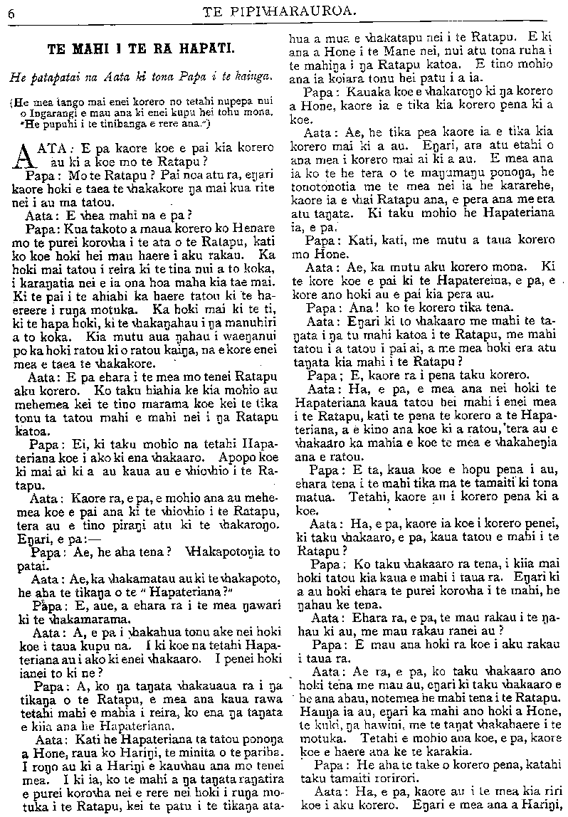 6 TE PIPIWHARAUROA. TE MAHI I TE RA HAPATI. He patapatai na Aata ki tona Papa i te kainga. (He mea tango mai enei korero no tetahi nupepa nui o Ingarangi e mau ana ki enei kupu hei tohu mona, "He pupuhi i te tinihanga e rere ana.") AATA: E pa kaore koe e pai kia korero au ki a koe mo te Ratapu? Papa: Mo te Ratapu? Pai noa atu ra, engari kaore hoki e taea te whakakore nga mai kua rite nei i au ma tatou. Aata: E whea mahi na e pa? Papa: Kua takoto a maua korero ko Henare mo te purei korowha i te ata o te Ratapu, kati ko koe hoki hei mau haere i aku rakau. Ka hoki mai tatou i reira ki te tina nui a to koka, i karangatia nei e ia ona hoa maha kia tae mai. Ki te pai i te ahiahi ka haere tatou ki te ha- ereere i runga motuka. Ka hoki mai ki te ti, ki te hapa hoki, ki te whakangahau i nga manuhiri a to koka. Kia mutu aua ngahau i waenganui po ka hoki ratou ki o ratou kainga, na e kore enei mea e taea te whakakore. Aata: E pa ehara, i te mea mo tenei Ratapu aku korero. Ko taku hiahia ke kia mohio au mehemea kei te tino marama koe kei te tika tonu ta tatou mahi e mahi nei i nga Ratapu katoa. Papa: Ei, ki taku mohio na tetahi Hapa- teriana koe i ako ki ena whakaaro. Apopo koe ki mai ai ki a au kaua au e whiowhio i te Ra- tapu. Aata: Kaore ra, e pa, e mohio ana au mehe- mea koe e pai ana ki te whiowhio i te Ratapu, tera au e tino pirangi atu ki te whakarongo. Engari, e pa:— Papa: Ae, he aha tena? Whakapotongia to patai. Aata: Ae, ka whakamatau auki te whakapoto, he aha te tikanga o te " Hapateriana?" Papa: E, aue, a ehara ra i te mea ngawari ki te whakamarama. Aata: A, e pa i whakahua tonu ake nei hoki koe i taua kupu na. I ki koe na tetahi Hapa- teriana au i ako ki enei whakaaro. I penei hoki ianei to ki ne? Papa: A, ko nga tangata whakauaua ra i nga tikanga o te Ratapu, e mea ana kaua rawa tetahi mahi e mahia i reira, ko ena nga tangata e kiia ana he Hapateriana. Aata: Kati he Hapateriana ta tatou pononga a Hone, raua ko Haringi, te minita o te pariha. I rongo au ki a Haringi e kauwhau ana mo tenei mea. I ki ia, ko te mahi a nga tang ata rangatira e purei korowha nei e rere nei hoki i runga mo- tuka i te Ratapu, kei te patu i te tikanga ata- hua a mua e whakatapu nei i te Ratapu. E ki ana a Hone i te Mane nei, nui atu tona ruha i te mahinga i nga Ratapu katoa. E tino mohio ana ia koiara tonu hei patu i a ia. Papa: Kauaka koe e whakarongo ki nga korero a Hone, kaore ia e tika kia korero pena ki a koe. Aata: Ae, he tika pea kaore ia e tika kia korero mai ki a au. Engari, ara atu etahi o ana mea i korero mai ai ki a au. E mea ana ia ko te he tera o te mangumangu pononga, he tonotonotia me te mea nei ia he kararehe, kaore ia e whai Ratapu ana, e pera ana me era atu tangata. Ki taku mohio he Hapateriana ia, e pa. Papa: Kati, kati, me mutu a taua korero mo Hone. Aata: Ae, ka mutu aku korero mona. Ki te kore koe e pai ki te Hapatereina, e pa, e kore ano hoki au e pai kia pera au. Papa: Ana! ko te korero tika tena. Aata: Engari ki to whakaaro me mahi te ta- ngata i nga tu mahi katoa i te Ratapu, me mahi tatou i a tatou i pai ai, a me mea hoki era atu tangata kia mahi i te Ratapu? Papa; E, kaore ra i pena taku korero. Aata: Ha, e pa, e mea ana nei hoki te Hapateriana kaua tatou hei mahi i enei mea i te Ratapu, kati te pena te korero a te Hapa- teriana, a e kino ana koe ki a ratou, tera au e whakaaro ka mahia e koe te mea e whakahengia ana e ratou. Papa: E ta, kaua koe e hopu pena i au, ehara tena i te mahi tika ma te tamaiti ki tona matua. Tetahi, kaore au i korero pena ki a koe. Aata: Ha, e pa, kaore ia koe i korero penei, ki taku whakaaro, e pa, kaua tatou e mahi i te Ratapu? Papa: Ko taku whakaaro ra tena, i kiia mai hoki tatou kia kaua e mahi i taua ra. Engari ki a au hoki ehara te purei korowha i te mahi, he ngahau ke tena. Aata; Ehara ra, e pa, te mau rakau i te nga- hau ki au, me mau rakau ranei au? Papa: E mau ana hoki ra koe i aku rakau i taua ra. Aata: Ae ra, e pa, ko taku whakaaro ano hoki tena me mau au, engari ki taku whakaaro e he ana ahau, notemea he mahi tena i te Ratapu. Haunga ia au, engari ka mahi ano hoki a Hone, te kuki, nga hawini, me te tangata whakahaere i te motuka. Tetahi e mohio ana koe, e pa, kaore koe e haere ana ke te karakia. Papa: He aha te take o korero pena, katahi taku tamaiti rorirori. Aata: Ha, e pa, kaore au i te mea kia riri koe i aku korero. Engari e mea ana a Haringi,