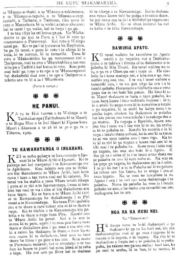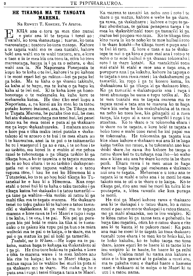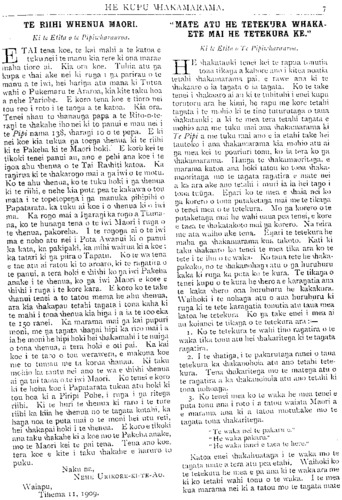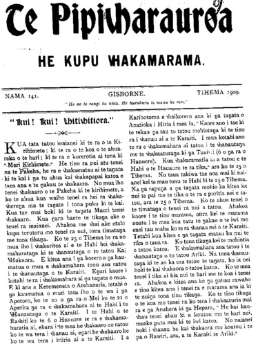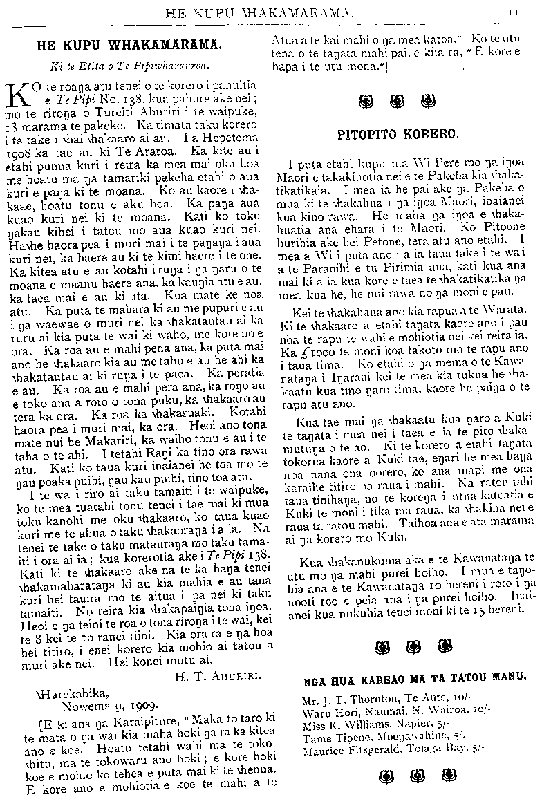 HE KUPU WHAKAMARAMA. TE RIIHI WHENUA MAORI. Ki te Etita o te Pipwharauroa E TAI tena koe, te kai mahi a te katoa e tuku nei i te manu kia rere ki ona marae maha tioro ai. Kia ora koe. Tuhia atu na kupa e whai ake nei ki runa i na parirau o te manu a te iwi, hei haringa atu mana ki Tutua wahi o Pukemaru te Araroa kia kite taku hoa a nehe Pariohe. E koro tena koe e tioro nei tou reo i roto i te taonga a te katoa. Kia ora. Tenei ahau to whanaunga papa a te Rito-o-te- rangi te whakahe iho nei ki to panui e mau nei i te Pipi nama 138, wharangi 10 o te pepa. E ki nei koe kia tukua na toenga whenua ki te nihi ki te Pakeha ki te Maori hoki. E koro kei te tikoki tenei panui au, ano e pehi ana koe i te ingoa ahu whenua o te Tai Rawhiti katoa. Ka rangirua ki te whakarongo mai a na iwi o te motu. Ko te ahu whenua, ko te tuku hoki i na whenua ki te nihi, e nehe kia puta pea te kakawa o tou mata i te topetopenga i nga manuka pihipihi o Papatarata, ka tuku ai koe i o whenua ki o iwi ma. Ka rongo mai a Ingarani ka rongo a Tiama- na, ko te hunanga tena o te iwi Maori i runa o te whenua, pakoreha. I te rongonga ai o te iwi ma e noho atu nei i Pota Awanui ki o panui ka kata, ka pakipaki, ka mihi wairua ki a koe; ka tatari ki nga piira o Tapatu. Ko te wa tena e tae atu ai ratou ki to aroaro, ki te rangatira o te panui, a tera hoki e whiwhi ko nga iwi Pakeha anake i te whenua, ko nga iwi Maori e kore e whiwhi i runga i te kore- kara. E koro ko te take whanui tenei a to tatou mema he ahu whenua, ara kia whakapau tetahi tangata i tona kaha ki te mahi i tona whenua kia hinga i a ia te loo eka te 150 ranei. Ka marama mai nga kai pupuri moni, me nga tangata whangai hipi ka riro mai i a ia he moni he hipi hoki hei whakamahi i te nuinga o tona whenua, a tera hoki e oti pai. Ka kai koe i te taro o tou werawera, e makona koe me to tumau me ta korua whanau. Ki taku mohio ka mutu nei ano te wa e whiwhi whenua ai na tai tama o te iwi Maori. Ko tenei e koro ki te hoha kue i Papatarata tukua atu hoki ki tou hoa ki a Piripi Pohe, i runga i nga ritenga riihi. Ki te huri te whenua ki raro i te ture nihi ka kiia he whenua no te tanata kotahi, ka hanga noa te puta mai o te moni hei utu reti, hei whakapai hoki i te whenua. E koro e tikoki ana taku whakahe ki a koe mo te Pakeha anake, mo te Maori kei te pai tena. Tena ano koe, tera koe e kite i taku whakahe e haruru to puku. Naku na, NEHE URlKORE-Kl-TE-Ao. Waiapu, Tihema 11, 1909 MATE ATU HE TETEKURA WHAKA- ETE MAI HE TETEKURA KE." Ki te Etita o Te Pipiwharauroa. HE whakatauki tenei kei tu rapua tonutia tona tikanga a kahore ano i kitea noatia tetahi whakamarama pai, e rawe ana ki te whakaaro o ia tangata o ia tanata. Ko te take tenei i whakaaro ai au ki te tuhituhi i enei kupu torutoru ara he kimi, he rapu me kore tetahi tanata i te mohio ki te tino tuturutanga o taua whakatauki; a ki te mea tera tetahi tanata e mohio ana me tuku mai ana whakamarama ki Te Pipi a me tuku mai ano e ia etahi take hei tautoko i ana whakamarama kia mohio atu ai na mea kei te pouriuri tonu, ko ia tera ko nga whakamarama. Haunga te whakamaoritanga, e marama katua ana hoki tatou ko tona whaka- maoritanga mo te tangata rangatira e mate nei a ka ara ake ano tetahi i muri ia ia hei tango i tona tuunga. Engari ko te mea e whaia nei ko nga korero o tona putakatanga mai me te tikanga u tenei mea o te tetekura. Mo na korero o te putaketanga mai he wahi uaua pea tenei, e kore e taea te whakatakoto mai nga korero. Na reira me ata waiho ake tena. Engari te tetekura he maha na whakamarama kua takoto. Kati ki taku whakaaro ko tenei te mea tika ara ko te tete i te ihu o te waka Ko taua tete he whaka- pakoko, no te whakanohanga atu o nga huruhuru kaka ki runga ka puta ko te kura. Te tikanga o tenei kupu o te kura he whero a e karangatia ana te kaka whero ona huruhuru he kakakura. Waihoki i te nohanga atu o aua huruhuru ki runa ki te tete karangatia tonutia atu taua mea katoa he tetekura Ko na take enei i mea ai au koianei te tikanga o te tetekura ara: 1. Ko te tetekura te wahi tino rangatira o te waka tika tunu atu hei whakaritenga ki te tanata rangatira 2. I te whatinga, i te pakarutanga ranei o taua tetekura ka whakanohoia atu ano tetahi tete- kura. Tena whakaritenga mo te matenga atu o te rangatira a ka; whakanohoia atu ano tetahi ki tona nohoanga. 3. Ku tenei mea ko te waka he mea tenei e puta tonu ana i roto i a tatou waiata Maori a e marama ana ki a tatou motuhake mo te tangata tuna whakaritenga " Te waka nei te pakaru e." " He waka pakaru." " He waka ranei e taea te haere." Katoa enei whakahuatanga i te waka mu te tangata mate a tera atu pea etahi. Waihoki ko te tetekura he mea e pa ana ki te waka ara me ki ko tetahi wahi tonu o te waka. I te mea kua marama nei ki a tatou mo te tangata mate