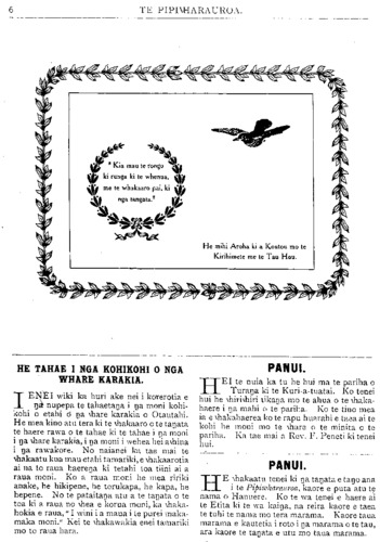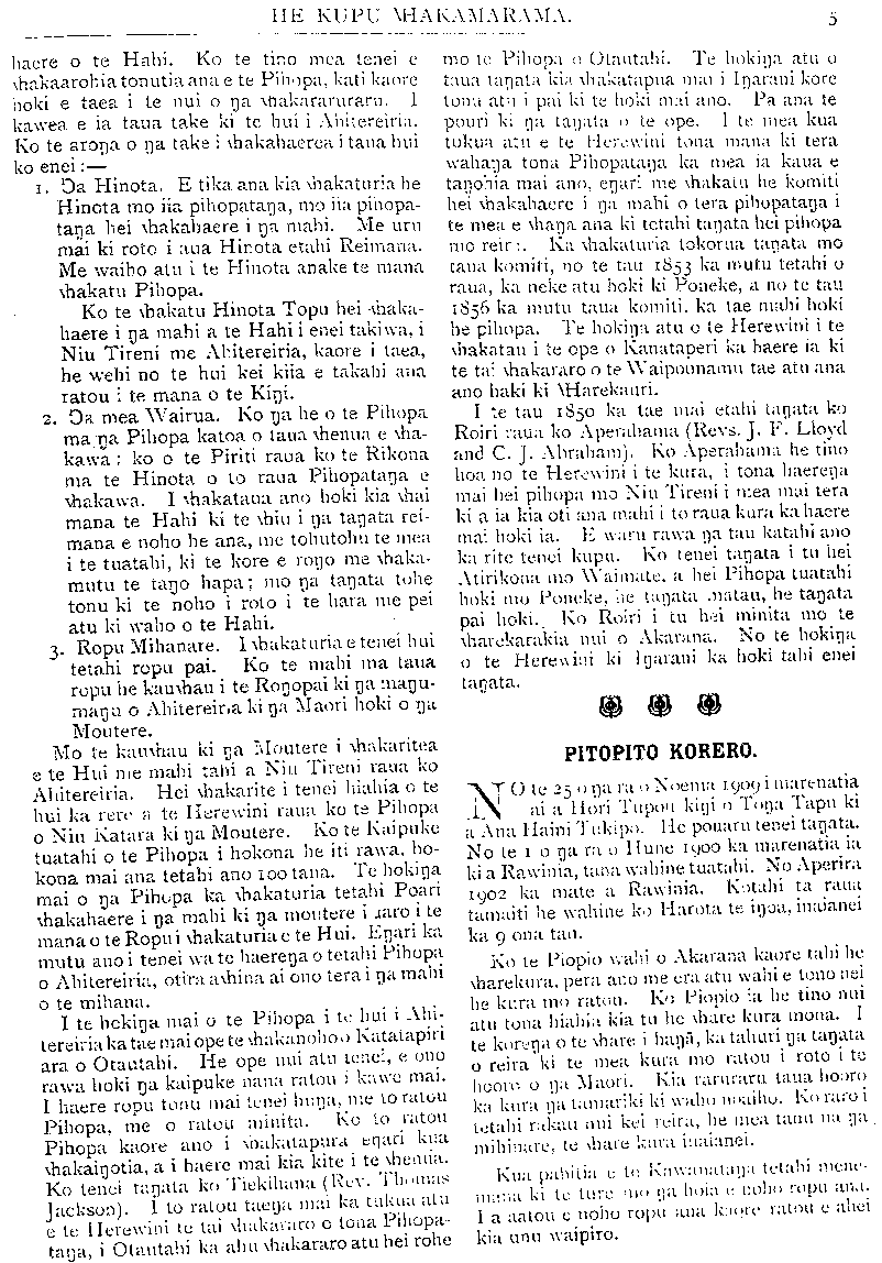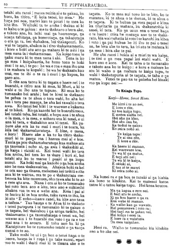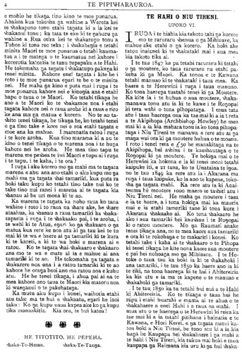 TE PIPIWHARAUROA. e mohio he tikanga tino kino te moe punarua. Ahakoa kua tokowha nga wahine a Wereta kei te whakapono tonu etahi tangata ki a ia kei te whakanui tonu; ka tata te eke ki te ngahuru nga wahine a Rua otira kei te whakarongo tonu a Tuhoe ki tona reo teka; i whakahengia e tetahi minita Maori te moe punarua o tetahi kauma- tua a i te matenga o te kaumatua nei kahore i korerotia katoatia te tanu tupapaku a te Hahi. He tokomaha nga tangata i whakatupu pakanga ki tenei minita. Kahore enei tangata i kite he i roto i te moe punarua engari te he o te minita nei. He maha nga kino e puta mai i runga i te moe punarua kahore nei e kinongia ana e etahi hapu o taua o te Maori. Ko tetahi tikanga he ano a te Maori ko te whakamoe noa i etahi tangata kahore nei o raua aroha ki a raua e riro ke ana ma- nga matua e korero. No te ao ta- whito tenei tikanga, he tikanga he, ko tetahi tenei o nga tino take e kore nei e roa etahi tangata e moe ana ka mahue. I marenatia ratou i runga i te kore aroha. Kua tino marama ki a au te kino o tenei tikanga o te marena noa i te hunga kahore nei he aroha. He mea tino tapu te marena me pewhea te iwi Maori e tupu ai i runga i te tapu, i te kaha, i te ora? I runga i aku korero mo nga mahi ma te tangata marena e ahu ana ano etahi o aku kupu mo nga mahi ma nga tangata whai tamariki, kua puta ra hoki taku kupu ko tetahi tino take nui ko te take tino nui ranei i marena ai te tangata kia whanau ai he uri mona ki te ao. Ka marena te tangata ka noho raua ko tana wahine i roto i to raua na whare ake, he whare ataahua, ka whanau a raua tamariki ka whaka- tupuria i runga i te whakaako pai, i te aroha, i te wehi ki te Atua, engari ko nga whakaaro o nga matua kua rere ke noa atu ki nga tau kei te tu mai ki te wa e haere ai nga tamariki ki te kura ki te kareti, a ki te wa hoki e marena ai e ratou. Ko te tangata whai-whakaaro e whakaaro ana mo te wa e mate ai ia e mahue ai ana tamariki ki te ao. He tokomaha nga tangata e whakarere noa ana i a ratou tamariki ki te ao kahore he oranga heoi ano ma ratou noa e kuhu atu. He he tenei tikanga, i ahua pai ai na te mea kahore ano taua te Maori kia matoru noa ki waenganui o te pakehatanga. Ka mutu aku kupu i konei, waihotia etahi atu take ma te hui e whakaatu, engari he inoi taku: Ko nga kupu uaua kapea ake ko nga kupu tika manaakitia. Kia ora, te hui katoa! HE TITOTITO. HE PEPEHA. whaka-Te-Humu. whaka-Te-Taunga. TE HAHI O NIU TIRENI. UPOKO VI. I RUNGA i te hiahia kia takoto tahi nga korero mo te raruraru whenua o nga Mihinare, ka mahue ake etahi o nga korero. Ka hoki ake tatou inaianei ki te whakataki mai i aua mea kia takoto tika ai. I te tau 1847 ka pa tetahi raruraru ki tetahi o nga moutere, ko taua raruraru na etahi pa- keha ki nga Maori. Ka tonoa e te Kawana tetahi manuao ki te whakataki i taua mea. Ka haere a te Herewini i runga i taua manuao. Ko tona haerenga tuatahi tenei ki nga Moutere. Ka kite ia i te huhua o aua moutere, whaka- manawa tonu atu ia ki te kawe i te Rongopai ki tera wahi o tona pihopatanga. I mua tata atu i taua haerenga ona ka tae mai ki a ia te reta a te Akipihopa (Archbishop Howley) he mea mai ki a ia kia mahara tonu ia ko tona pihopa- tanga i Niu Tireni te manawa e rere atu ai nga manga wai ora ki nga moutere huhua o te moana. I roto i tenei reta e £50 he manakitanga na te Akipihopa, hei awhina i te kauwhautanga o te Rongopai ki nga moutere. Te hokinga mai o te Herewini ka hokona e ia ki tenei moni tetahi kaipuke iti, e 21 tana, ko te Unataina te ingoa. no te tau 1849 ka rere atu ia i Akarana ma runga i taua kaipuke, ko ia ano te kapene, toko- wha nga tangata mahi. Ka rere atu ia ki Anai- teuma he moutere 1ooo maero te tawhiti atu i Niu Tireni nei. He maha nga moutere i taea e ia te haere, a i tona hokinga mai ka mauria mai e ia etahi tamariki tane ki tona kura i Akarana whakaako ai. Ko tona whakaaro he ako i aua tamariki hei kauwhau i te Rongopai ki o ratou moutere. Mo nga Raumati anake tenei tikanga ana, no te mea kaore aua tamariki e ora ki te rokohanga e te makariri i konei. Ko tetahi take i kaha ai te whakaaro o te Pihopa ki tenei tikanga he kite nona kaore aua moutere e pai hei nohoanga mo nga Mihinare. I te Ho- toke o taua tau ka hoki ia ki te whakahoki i ana tamariki, i te tau 1850 ka haere ano ia ki te tiki, na tona haerenga ki te hui i Ahitereiria ka kia atu e ia ma te kapene o te manuao e whakahoki nga tamariki. I te tau 1850 ka tu tetahi hui nui a te Hahi ki Ahitereiria. Ko te tikanga o taua hui he rapu i etahi huarahi e mama ai te ahua o te whakahaere a enei Hahi i a raua na mahi. I mua atu o te haerenga o te Herewini ki reira ka tae mai ki a ia tetahi pitihana i hainatia e te Kawana, e Hori Kerei, e nga tangata nunui ka- toa hoki a Niu Tireni, he tono atu ki a ia kia hanga he Kaupapa hei whakahaere i nga mahi a te hahi i Niu Tireni, kia tukua mai hoki e taua kaupapa nga Reimana kia uru ki nga hui whaka-