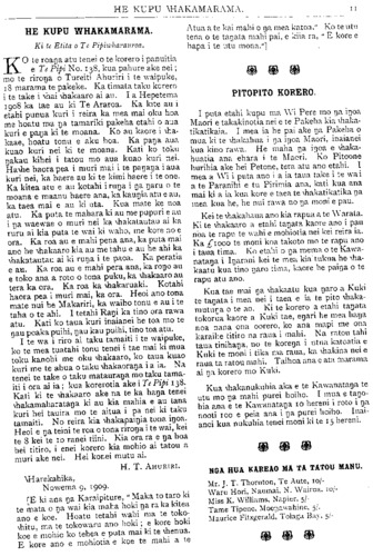 HE KUPU WHAKAMARAMA. 11 HE KUPU WHAKAMARAMA. Ki te Etita o Te Pipiwharauroa. KO te roanga atu tenei o te korero i panuitia e Te Pipi No. 138, kua pahure ake nei; mo te rironga o Tureiti Ahuriri i te waipuke, 18 marama te pakeke. Ka timata taku korero i te take i whai whakaaro ai au. Ia Hepetema 1908 ka tae au ki Te Araroa. Ka kite au i etahi punua kuri i reira ka mea mai oku hoa me hoatu ma nga tamariki pakeha etahi o aua kuri e panga ki te moana. Ko au kaore i wha- kaae, hoatu tonu e aku hoa. Ka panga aua kuao kuri nei ki te moana. Kati ko toku ngakau kihei i tatou mo aua kuao kuri nei. Hawhe haora pea i muri mai i te panganga iaua kuri nei, ka haere au ki te kimi haere i te one. Ka kitea atu e au kotahi i runga i nga ngaru o te moana e maanu haere ana, ka kaungia atu e au, ka taea mai e au ki uta. Kua mate ke noa atu. Ka puta te mahara ki au me pupuri e au i nga waewae o muri nei ka whakatautau ai ka ruru ai kia puta te wai ki waho, me kore no e ora. Ka roa au e mahi pena ana, ka puta mai ano he whakaaro kia au me tahu e au he ahi ka whakatautau ai ki runga i te paoa. Ka peratia e au. Ka roa au e mahi pera ana, ka rongo au e toko ana a roto o tona puku, ka whakaaro au tera ka ora. Ka roa ka whakaruaki. Kotahi haora pea i muri mai, ka ora. Heoi ano tona mate nui he Makariri, ka waiho tonu e au i te taha o te ahi. I tetahi Rangi ka tino ora rawa atu. Kati ko taua kuri inaianei he toa mo te ngau poaka puihi, ngau kau puihi, tino toa atu. I te wa i riro ai taku tamaiti i te waipuke, ko te mea tuatahi tonu tenei i tae mai ki mua toku kanohi me oku whakaaro, ko taua kuao kuri me te ahua o taku whakaoranga i a ia. Na tenei te take o taku matauranga mo taku tama- iti i ora ai ia; kua korerotia ake i Te Pipi 138. Kati ki te whakaaro ake na te ka hanga tenei whakamaharatanga ki au kia mahia e au tana kuri hei tauira mo te aitua i pa nei ki taku tamaiti. No reira kia whakapaingia tona ingoa. Heoi e nga teini te roa o tona rironga i te wai, kei te 8 kei te 10 ranei tiini. Kia ora ra e nga hoa hei titiro, i enei korero kia mohio ai tatou a muri ake nei. Hei konei mutu ai. H. T. AHURIRI. Wharekahika, Nowema 9 1909 [E ki ana nga Karaipiture, " Maka to taro ki te mata o nga wai kia maha hoki nga ra ka kitea ano e koe. Hoatu tetahi wahi ma te toko- whitu, ma te tokowaru ano hoki; e kore hoki koe e mohio ko tehea e puta mai ki te whenua. E kore ano e mohiotia e koe te mahi a te Atua a te kai mahi o na mea katoa." Ko te utu tena o te tangata mahi pai, e kiia ra, " E kore e hapa i te utu mona."] PITOPITO KORERO. I puta etahi kupu ma Wi Pere mo nga ingoa Maori e takakinotia nei e te Pakeha kia whaka- tikatikaia. I mea ia he pai ake nga Pakeha o mua ki te whakahua i na ingoa Maori, inaianei kua kino rawa. He maha nga ingoa e whaka- huatia ana ehara i te Maori. Ko Pitoone hurihia ake hei Petone, tera atu ano etahi. I mea a Wi i puta ano i a ia taua take i te wai a te Paranihi e tu Pirimia ana, kati kua ana mai ki a ia kua kore e taea te whakatikatika nga mea kua he, he nui rawa no nga moni e pau. Kei te whakahaua ano kia rapua a te Warata. Ki te whakaaro a etahi tangata kaore ano i pau noa te rapu te wahi e mohiotia nei kei reira ia. Ka £1000 te moni koa takoto mo te rapu ano i taua tima. Ko etahi o nga mema o te Kawa- natanga i Ingarani kei te mea kia tukua he wha- kaatu kua tino ngaro tima, kaore he painga o te rapu atu ano. Kua tae mai nga whakaatu kua ngaro a Kuki te tangata i mea nei i taea e ia te pito whaka- mutunga o te ao. Ki te korero a etahi tangata tokorua kaore a Kuki tae, engari he mea hanga noa nana ona oorero, ko ana mapi me ona karaihe titiro na raua i mahi. Na ratou tahi taua tinihanga, no te korenga i utua katoatia e Kuki te moni i tika ma raua, ka whakina nei e raua ta ratou mahi. Taihoa ana e ata marama ai nga korero mo Kuki. Kua whakanukuhia aka e te Kawanatanga te utu mo nga mahi purei hoiho. I mua e tango- hia ana e te Kawanatanga 10 hereni i roto i nga nooti loo e peia ana i nga purei hoiho. Inai- anei kua nukuhia tenei moni ki te 15 hereni. NGA HUA KAREAO MA TA TATOU MANU. Mr. J. T. Thornton, Te Aute, 10/- Waru Hori, Naumai, N. Wairoa, 10/- Miss K. Williams, Napier, 5/- Tame Tipene, Moengawahine, 5/. Maurice Fitxgerald, Tolaga Bay, 5/-
