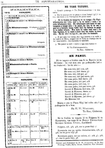 TE PIPIWHARAUROA. HE TURE TUTURU. 1. Kotahi putanga o TE PIPIWHARAUROA i te ma- rama. 2. Ko te oranga mo te pepa e rima hereni (5/-) i te tau, me nooti o te Poutapeta me pane ranei, auaka i te tiaki he pane kingi hepene nga pane e tino hiahiatia ana. 3. Ki te pau nga hereni a tetahi tangata i tuku mai ai ka tukua atu he kaute. Ki te tae atu te kaute kia hohoro te tuku mai i te moni, na te moni hoki i puta atu ai te pepa ehara i te mea tupu noa. 4. E pai ana kia tukua mai nga korero o ia wahi o ia wahi o te Motu, engari kei te Etita te tikanga mo te ta i aua korero : kia marama te tuhituhi. 5. Me penei te tuhi i waho o nga reta katoa: — Ki TE PIPIWHARAUROA, Te Rau, Gisborne. HE PANUI Ki te tangata e hiahia ana ki te Rawiri ki te Himene : he nui noa atu nga pukapuka kei a au inaianei : ko te utu : — He mea nui, kin noa ... 2/6 He mea nui, kiri wher ... 3/- He mea nui, kiri pai ... 4/— He mea nui kiri pai rawa ... 5/6 H e mea paku, kiri whero ... 1/6 H e mea paku, kiri pai . . . 2/6 He mea paku, kiri noa ... 1/- He mea paku, kiri pai rawa 3/6 Rawiri & Himene, kiri noa 1/6 Rawiri & Himene, whero ... 2/- Rawiri & Himene, pai ... 3/- Rawiri & Himene, pai rawa 4/- He Himene ... ... -/6 Maku e utu te Pane Kingi hei tuku atu i nga pukapuka ki a koe. Na H. W. WILLIAMS, Te Rau, Gisborne. Ki te hiahia te tangata ki te Paipera ki te, Kawenata, me tono ki te BIBLE DEPOSITORY SUNDAY SCHOOL UNION, Auckland. Paipera, 2/6, 3/6, 4/6, me te pane kingi //- Kawenata me nga upoko whakamarama 2/6 3/- 4/6, me te pane kingi 3d. Kawenata paku, me nga waiata 2/-, 2/6, 3/-, 3/6, 4/-, me te pane kingi, 3d. Printed and Published by H. W. WILLIAMS, at Te Rau Printing Works, Berry Street, Gisborne, New Zealand.