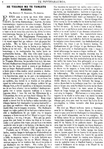 2 TE PIPIWHARAUROA. HE TIKANGA MA TE TANGATA MARENA. Na REWETI T. KOHERE, Te Araroa. E KIIA ana e toru nga mea tino nunui e puta" ana ki te tangata i tenei ao: Tuatahi, ko tona whanautanga; tuarua, ko tona marenatanga; tuatoru ko tona matenga. Kahore a te tangata wahi mo te mea tuatahi, kahore hoki ana wahi mo te wahi tuatoru, ara, e kore e taea e ia te mea kia ora tonu ia, otira ko tona marenatanga, haunga ia i nga ra o nehera, e whai wahi ana ia. Na Naporeana Ponepaata te kupu ko te kaha o te iwi, kahore i te pu kahore i te moni engari kei nga matua—kei nga papa kei nga hoka. Ma te kaha o nga whanau takitahi, ka kaha ai te hapu, ma te kaha o nga hapu ka kaha ai te iwi nui. Ki te kaha kore nga hono- honotanga o te mekameka ka kaha kore te mekameka katoa. He tino tiko enei kupu a Naporiana, a, na konei au ka mea ko ta tatou putake korero inaianei, ara, ko Oa Tikanga ma te Tangata Marena, he putake tino nui, he mea hei ata whakaaroarohanga ma tenei hui, kei penei tatou na he mea tenei e puta ai nga whakaaro me nga kupu whakaahuareka. I mahara ano au e kore pea e tika maku tenei putaka e whaka- takoto ki te aroaro o te hui i te mea ehara au i te kaumatua, anei ia te pai o te taitamariki he tu i waenganui i nga ao e rua, i te ao hou i te ao tawhito, ma konei ia e mohio ai me pehea ranei te tuhonotanga o nga tikanga tawhito ki nga tikanga hou, a ko te tauwira o te tangata marena no te ao hou ehara i te ao tawhito i whakapono- ngatia nei o tatou tupuna wahine e o tatou tupuna tane, i kau ke nei ko Hinemoa ki a Tutanekai, ko to te ao hou hoki tikanga ko Tu- tanekai ke e kau ki a Hinemoa. Kua rongo etahi o tenei hui ki te kaha o taku tautoko i nga tikanga katoa hei whakaako i a tatou tamariki— nga tane nga wahine—kia mohio ai ratou ki nga mahi tika ma te tangata marena. He whakaaro tenei no toku ngakau ki te kahore a tatou tama- riki e whakaakona ki nga mahi ma te tangata marena e kore rawa te Iwi Maori e tupu i runga i te kaha, i te ora, i te pai. Kia pai nga pura- pura kia pai hoki te mara ka tika ai te tuma- nako o te ngakau kia tupu pai nga hua o te mara waihoki ma te pai o te kainga, o te whare, ma te pai o nga matua ka pai ai hoki nga tamariki. Tuatahi, mo te Whare.—He kupu na te pa- keha, matua hanga te kohanga ka whakatakoto ai i nga pi He tino ture hoki na te pakeha e kore e tika te marena wawe i te mea kahore ano kia rite he kainga; ko ta te Maori tikanga ia matua rapua ko te wahine hei muri ka puta ai nga whakaaro mo te whare. He maha nga he e puta ana i runga i tenei tikanga a taua a te Maori. Ka marena te tamaiti ka noho ano i roto i te whare o nga matua kahore e wehe ke nga whare, nga rawa, nga whakahaere; kahore e tupu te nga- kau ahuwhenua, te ngakau penapena taonga i te mea ka whakawhirinaki tonu nga tamariki ki nga matua hei poupou mo raua. Ko te tikanga tino kino rawa ia ko te noho ko te moe huihui i roto i te whare kotahi—he tikanga tenei e punga ana i te Iwi ki raro. E kore e taea e au te whaka- tepe te nui o nga kino e puta mai ana i roto o te noho o te moe huihui o nga whanau tokomaha i roto i te whare kotahi. Ka matakitaki tonu mai etahi ki etahi e moe ana e tanga ana, e purupuru ana i nga kakahu, kahore he tapunga o te tangata o ana rawa ranei; ka whakahanumi nga tamariki, ka rongo i nga tu korero katoa, ka whakaakona ki nga tikanga ki nga whakaaro kino. Ko nga tamariki e whakatupuria ana i runga i tenei ahuatanga he uaua e tupu totika ai. Ko te mea tuatahi ma te tangata marena ma te tangata ranei e tata ana te marena ko te hanga whare kia wehe ke kia makohakoha ai ta raua na noho ko tona hoa, kia pihangaiti ai a raua taonga, kia tupu ai a raua tamariki i runga i te ataahua. Ko te whare o te tokomaha ehara i te whare no te tangata, e kore hoki te tangata e hoko tonu e mahi tonu ranei he kai papai ma te tokomaha. He tokomaha nga tangata kua kite ahau kahore e whakaaro nui ana ki te hanga kainga totika mo ratou, a he tokomaha ano kua whiwhi whare he rawa iho kahore he taonga o ratou whare kei te tu tahanga noa iho—ko waho noa e kitea atu ana he whare ko roto ia he whare poak. Ehara rawa i te mea uaua te hanga whare te hanga kainga pai mehemea e whakaaro nui ana te tangata. Mehemea e u tonu ana te tangata ki te mahi e tohu ana i te moni he mea takoto noa te oti o te whare o te kainga. Ko te tikanga pai, riro ana mai he moni ka tuku ki te poutapeta, a, kitea rawatia ake kua puranga te moni. He tini nga Maori kahore rawa e whakaaro ana ki te whakapai i o ratou whare, ko a ratou moni e pau ano mo te whakapai i o ratou tinana, mo nga mahi ahuareka, mo te inu waipiro. Ki te kitea ratou ki nga taone tera e pohehetia he hunga tino rangatira, otira ko o ratou whare e rite ana ki te kauta ki te pakoro ranei: Ka puta ana mai he moni ki te tangata ko tona whakaaro tuatahi tonu ehara i te mea ko te hoko kai, ko te hoko kakahu, ko te hoko taonga mo tona whare, kaore engari ko te haere ki te taone ki te inu waipiro ki te haute, he haere ki nga reihi hoiho. Ahakoa ranei he nama ana kahore e utua e ia kia ngawari ai te pakeha a muri atu, ma te pakeha tonu e whawhai haere e hamene ranei e whakaaro ai te nuinga o te Maori ki te utu i a ratou nama.