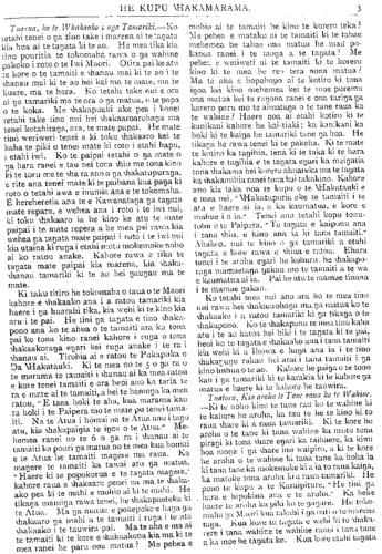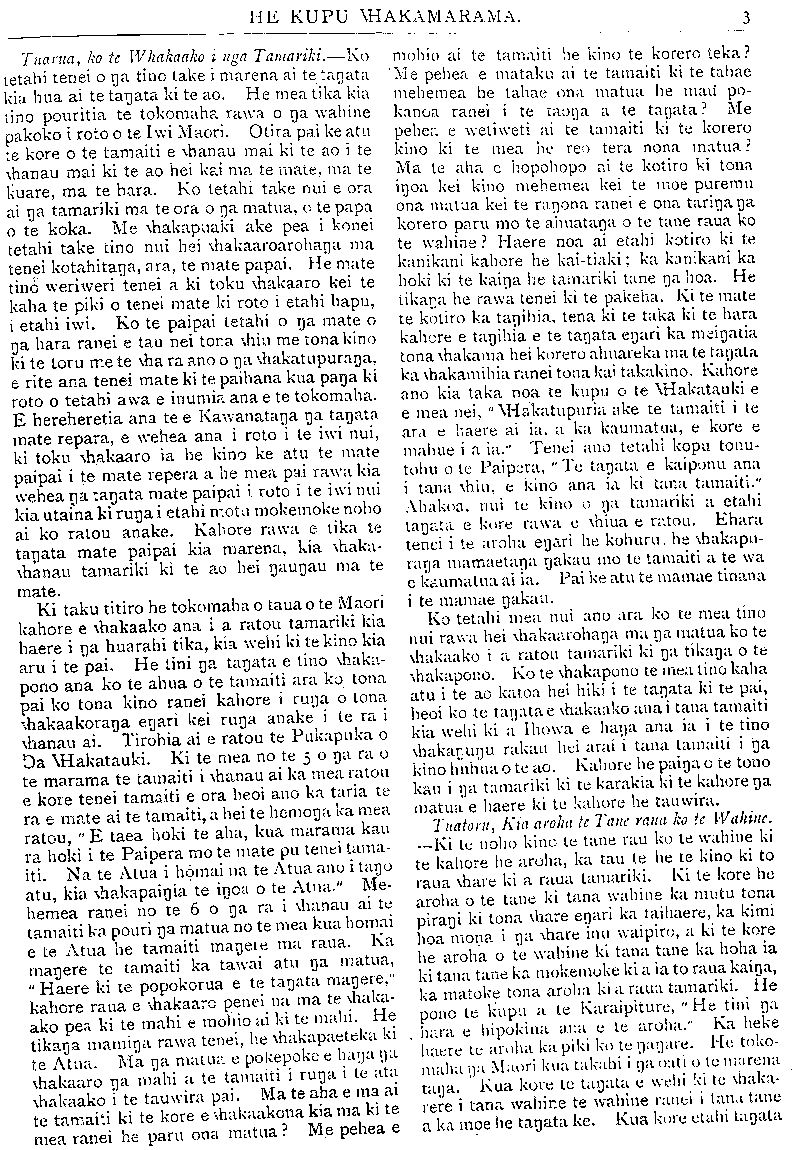HE KUPU WHAKAMARAMA. Tuarua, ko te Whakaako i nga Tamariki.—Ko tetahi tenei o nga tino take i marena ai te tanata kia hua ai te tangata ki te ao. He mea tika kia tino pouritia te tokomaha rawa o nga wahine pakoko i roto o te Iwi Maori. Otira pai ke atu te kore o te tamaiti e whanau mai ki te ao i te whanau mai ki te ao hei kai ma te mate, ma te kuare, ma te hara. Ko tetahi take nui e ora ai nga tamariki ma te ora o na matua, o te papa o te koka. Me whakapuaki ake pea i konei tetahi take tino nui hei whakaaroarohanga ma tenei kotahitanga, ara, te mate papai. He mate tino weriweri tenei a ki toku whakaaro kei te kaha te piki o tenei mate ki roto i etahi hapu, i etahi iwi. Ko te paipai tetahi o nga mate o nga hara ranei e tau nei tona whiu me tona kino ki te toru me te wha ra ano o nga whakatupuranga, e rite ana tenei mate ki te paihana kua panga ki roto o tetahi awa e inumia ana e te tokomaha. E hereheretia ana te e Kawanatanga nga tangata mate repara, e wehea ana i roto i te iwi nui, ki toku whakaaro ia he kino ke atu te mate paipai i te mate repera a he mea pai rawa kia wehea nga tangata mate paipai i roto i te iwi nui kia utaina ki runga i etahi motu mokemoke noho ai ko ratou anake. Kahore rawa e tika te tangata mate paipai kia marena, kia whaka- whanau tamariki ki te ao hei ngaungau ma te mate. Ki taku titiro he tokomaha o taua o te Maori kahore e whakaako ana i a ratou tamariki kia haere i nga huarahi tika, kia wehi ki te kino kia aru i te pai. He tini nga tangata e tino whaka- pono ana ko te ahua o te tamaiti ara ko tona pai ko tona kino ranei kahore i runga o tona whakaakoranga engari kei runga anake i te ra i whanau ai. Tirohia ai e ratou te Pukapuka o Nga Whakatauki Ki te mea no te 5 o nga ra o te marama te tamaiti i whanau ai ka mea ratou e kore tenei tamaiti e ora heoi ano ka taria te ra e mate ai te tamaiti, a hei te hemonga ka mea ratou, " E taea hoki te aha, kua marama kau ra hoki i te Paipera mo te mate pu tenei tama- iti. Na te Atua i homai na te Atua ano i tango atu, kia whakapaingia te ingoa o te Atua." Me- hemea ranei no te 6 o nga ra i whanau ai te tamaiti ka pouri nga matua no te mea kua homai e te Atua he tamaiti mangere ma raua. Ka mangere te tamaiti ka tawai atu nga matua, " Haere ki te popokorua e te tangata mangere," kahore raua e whakaaro penei na ma te whaka- ako pea ki te mahi e mohio ai ki te mahi. He tikanga maminga rawa tenei, he whakapaeteka ki te Atua. Ma nga matua e pokepoke e hanga na whakaaro nga mahi a te tamaiti i runa i te ata whakaako i te tauwira pai. Ma te aha e ma ai te tamaiti ki te kore e whakaakona kia ma ki te mea ranei he paru ona matua? Me pehea e mohio ai te tamaiti he kino te korero teka? Me pehea e mataku ai te tamaiti ki te tahae mehemea he tahae ona matua he mau po- kanoa ranei i te taonga a te tangata? Me pehea e wetiweti ai te tamaiti ki te korero kino ki te mea he reo tera nona matua? Ma te aha e hopohopo ai te kotiro ki tona ingoa kei kino mehemea kei te moe puremu ona matua kei te rangona ranei e ona taringa nga korero paru mo te ahuatanga o te tane raua ko te wahine? Haere noa ai etahi kotiro ki te kanikani kahore he kai-tiaki; ka kanikani ka hoki ki te kainga he tamariki tane na hoa. He tikanga he rawa tenei ki te pakeha. Ki te mate te kotiro ka tangihia, tena ki te taka ki te hara kahore e tangihia e te tanata engari ka meingatia tona whakama hei korero ahuareka ma te tangata ka whakamihia ranei tona kai takakino. Kahore ano kia taka noa te kupu o te whakatauki e e mea nei, " whakatupuria ake te tamaiti i te ara e haere ai ia, a ka kaumatua, e kore e mahue i a ia Tenei ano tetahi kopu tonu- tohu o te Paipera, "Te tanata e kaiponu ana i tana whiu, e kino ana ia ki tana tamaiti." Ahakoa nui te kino o nga tamariki a etahi tangata e kore rawa e whiua e ratou Ehara tenei i te aroha engari he kohuru, he whakapu- tanga mamaetanga ngakau mo te tamaiti a te wa e kaumatua ai ia. Pai ke atu te mamae tinana i te mamae ngakau. Ko tetahi mea nui ano ara ko te mea tino nui rawa hei whakaarohanga ma nga matua ko te whakaako i a ratou tamariki ki nga tikanga o te whakapono. Ko te whakapono te mea tino kaha atu i te ao katoa hei hiki i te tangata ki te pai, heoi ko te tangata e whakaako ana i tana tamaiti kia wehi ki a Ihowa e hanga ana ia i te tino whakangungu rakau hei arai i tana tamaiti i nga kino huhua o te ao. Kahore he painga o te tono kau i nga tamariki ki te karakia ki te kahore nga matua e haere ki te kahore he tauwira. Tuatoru, Kia aroha te Tane raua ko te Wahine. —Ki te noho kino te tane rau ku te wahine ki te kahore he aroha, ka tau te he te kino ki to raua whare ki a raua tamariki. Ki te kore he aroha o te tane ki tana wahine ka mutu tona pirangi ki tona whare engari ka taihaere, ka kimi hoa mona i nga whare inu waipiro, a ki te kore he aroha o te wahine ki tana tane ka hoha ia ki tana tane ka mokemoke ki a ia to raua kainga, ka matoke tona aroha ki a raua tamariki. He pono te kupu a te Karaipiture, " He tini nga hara e hipokina ana e te aroha." Ka heke haere te aroha ka piki ko te ngangare. He toko- maha nga Maori kua takahi i nga oati u te marena tana. Kua kore te tangata e wehi ki te whaka- rere i tana wahine te wahine ranei i taua tane a ka moe he tangata ke. Kua koru etahi tanata