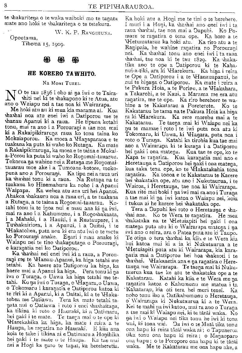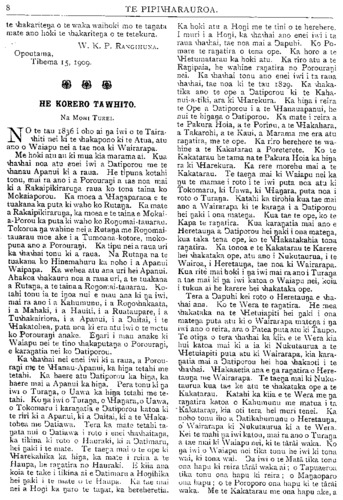 TE PIPIWHARAUROA. te whakaritenga o te waka waihoki mo te tangata mate ano hoki te whakaritenga o te tetekura. W. K. P. RANGIHUNA. Opoutama, Tihema 15, 1909. HE KORERO TAWHITO. Na MOHI TUREI. NO te tau 1836 i oho ai nga iwi o te Taka- whiti nei ki te whakapono ki te Atua, atu ano o Waiapu nei a tae noa ki Wairarapa. Me hoki atu au ki mua kia marama ai. Kua whawhai noa atu enei iwi a Ngatiporou me te whanau Apanui ki a raua. He tipuna kotahi tonu, mai ra ano i a Porourangi a tae noa mai ki a Rakaipikirarunga raua ko tona taina ko Mokaiaporou. Ka moea a Whangaparaoa e te tuakana ka puta ki waho ko Rutanga. Ka mate a Rakaipikirarunga, ka moea e te taina e Mokai- a-Porou ka puta ki waho ko Rongomai-tauarau. Tokorua nga wahine nei a Rutanga me Rongomai- tauarau moe ake i a Tumoana-kotore, moko- puna ano a Porourangi. Ka tipu nei a raua uri ka whawhai tonu ki a raua. Na Rutanga na te tuakana ko Hinemahuru ka noho i a Apanui Waipapa. Ka wehea atu ana uri hei Apanui. Ahakoa whakauru noa a raua uri, a te tuakana a Rutanga, a te taina a Rongomai-tauarau. Ko- tahi tonu ia te ingoa nui e mau ana ki nga iwi, mai ra ano i a Kahungunu, i a Rongowhakaata, i a Mahaki, i a Hauiti, i a Ruataupare, i a Tuwhakairiora, i a Apanui, i a Ngaitai, i te Whakatohea, puta noa ki era atu iwi o te motu ko Porourangi anake. Engari i mau anake ki Waiapu nei te tino whakaputanga o Porourangi, e karangatia nei ko Ngatiporou. Ka whawhai nei enei iwi ki a raua, a Porou- rangi me te Whanau-Apanui, ka hinga tetahi me tetahi. Ka haere atu Ngatiporou ka hinga, ka haere mai a Apanui ka hinga. Pera tonu ki nga iwi o Turanga, o Uawa ka hinga tetahi me te- tahi. Ko nga iwi o Turanga, o Whangara, o Uawa, o Tokomaru i karangatia e Ngatiporou katoa ki te riri ki a Apanui, ki a Ngaitai, ki a te Whaka- tohea me Ngatiawa. Tera ka mate tetahi ta- ngata nui o Ngatiawa i roto i enei whawhaitanga, ka tikina ki roto o Hauraki, ki a Ngatimaru, hei ngaki i te mate. Te taenga mai o te ope ki Wharekahika ka hinga, ka mate i reira a te Haupa, he rangatira no Hauraki. E kiia ana koia te take i tikina ai e Ngatimaru a Hongihika hei ngaki i te mate o te Haupa. Ka tae mai nei a Hongi ka ngaro te tangata, ka hereheretia. Ka hoki atu a Hongi me te tini o te herehere. I muri i a Hongi, ka whawhai ano enei iwi i ta raua whawhai, tae noa mai a Ngapuhi. Ko Po- mare te rangatira o tena ope. Ka horo a te Whetumatarau ka hoki atu. Ka riro atu a te Rangipaia, he wahine rangatira no Porourangi nei. Ka whawhai tonu ano enei iwi i ta raua whawhai, tae noa ki te tau 1829. Ka whaka- tika ano te ope a Ngatiporou ki te Kaha- nui-a-tiki, ara ki wharekura. Ka hinga i reira te Ope a Ngatiporou i a te Whanauapanui, he nui te hinganga o Ngatiporou. Ka mate i reira a te Pakura Hoia, a te Porinu, a te Whakahara, a Takarohi, a te Kaui, a Marama me era atu rangatira, me te ope. Ka riro herehere te wa- hine a te Kakatarau a Poreterete. Ko te Kakatarau he tama nate Pakura Hoia ka hinga ra ki Wharekura. Ka rere morehu mai a te Kakatarau. Te taenga mai ki Waiapu nei ka ngu te mamae i roto i te iwi puta noa atu ki Tokomaru, ki Uawa, ki Whangara, puta noa i roto o Turanga. Katahi ka tirohia kua tae mai ano a Wairarapa ki te karanga i a Ngatiporou hei ngaki i ona matenga. Kua tae te ope, ko te Kapa te rangatira. Kua karangatia mai ano e Heretaunga a Ngatiporou hei ngaki i ona matenga, kua taka tena ope, ko te Whakatakahia tona rangatira. Ka tonoa e te Kakatarau te Karere hei whakataka ope, atu ano i Nukutaurua, i te Wairoa, i Heretaunga, tae noa ki Wairarapa. Kua rite mai hoki i nga iwi mai ra ano i Turanga a tae mai ki nga iwi katoa o Waiapu nei, koia i tukua ai he karere hei whakataka ope. Tera a Ngapuhi kei roto o Heretaunga e wha- whai ana. Ko te Wera te rangatira. He mea whakataka na te Whetuiapiti hei ngaki i ona matenga puta atu ki o Wairarapa matenga i nga iwi ano o reira, ara o Patea puta atu ki Taupo. Te otinga o tera whawhai ka kiia e te Wera kia hui katoa mai ki a ia ki Nukutaurua a te Whetuiapiti puta atu ki Wairarapa, kia kara- ngatia mai a Ngatiporou hei hoa whakaoti i te whawhai. Whakaaetia ana e nga rangatira o Here- taunga me Wairarapa. Te taenga mai ki Nuku- taurua kua tae ke atu te whakataka ope a te Kakatarau. Katahi ka kiia e te Wera me nga rangatira katoa o Kahungunu me matua i ta Kakatarau, kia oti tera hei muri tenei. Ka noho tonu iho a Ngatikahungunu o Heretaunga, o wairarapa ki Nukutaurua ki a te Wera. Kei te mahi na iwi katou, mai ra ano o Turanga a tae mai ki Waiapu nei, ki te tarai waka. Ko nga iwi o Waiapu nei tika tonu he iwi ki tona wai, ki tona wai. Nga iwi o te Mata tika tonu ona hapu ki reira tarai waka ai; o Tapuaeroa tika tonu ona hapu ki reira; o Mangaoparo ona hapu; o te Poroporo ona hapu ki te tarai waka. Me te Kakatarau me ona hapu ake, a