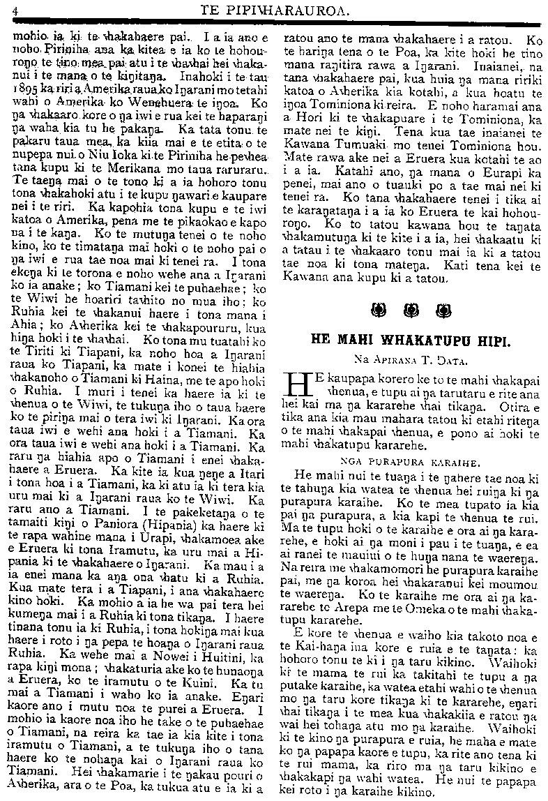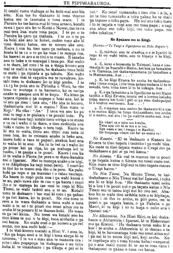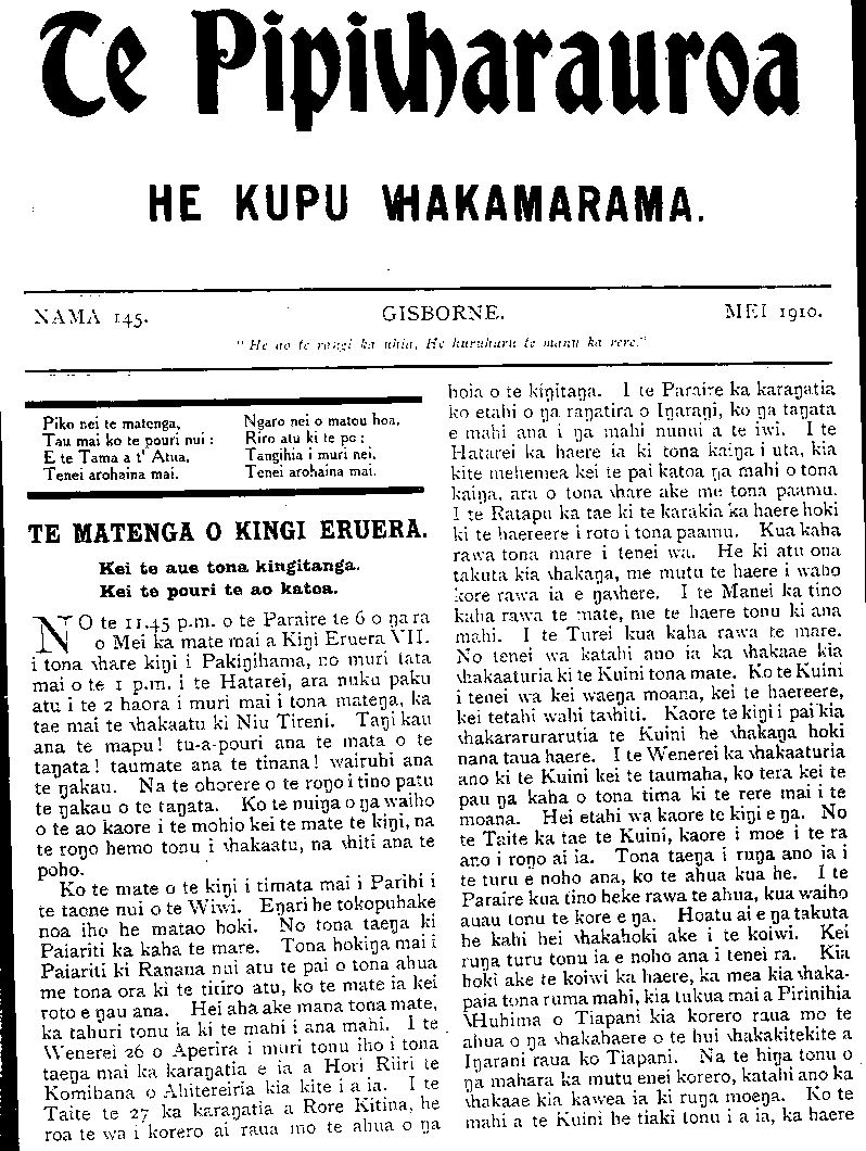 Te Pipiwharauroa HE KUPU WHAKAMARAMA. NAMA 145 GISBORNE. "He ao te rangi ka uhia He huruhuru te manu ka rere." MEI 1910. Piko nei te matenga, Tau mai ko te pouri nui E te Tama a t' Atua, Tenei arohaina mai. Ngaro nei o matou hoa, Riro atu ki te po Tangihia i muri nei, Tenei arohaina mai. TE MATENGA O KINGI ERUERA. Kei te aue tona kingitanga. Kei te pouri te ao katoa. NO te 11.45 p.m. o te Paraire te 6 o nga ra o Mei ka mate mai a Kingi Eruera VII. i tona whare kingi i Pakingihama, no muri tata mai o te 1 p.m. i te Hatarei, ara nuku paku atu i te 2 haora i muri mai i tona matenga, ka tae mai te whakaatu ki Niu Tireni. Tangi kau ana te mapu! tu-a-pouri ana te mata o te tangata! taumate ana te tinana! wairuhi ana te ngakau. Na te ohorere o te rongo i tino patu te ngakau o te tangata. Ko te nuinga o nga waiho o te ao kaore i te mohio kei te mate te kingi, na te rongo hemo tonu i whakaatu, na whiti ana te poho. Ko te mate o te kingi i timata mai i Parihi i te taone nui o te Wiwi. Engari he tokopuhake noa iho he matao hoki. No tona taenga ki Paiariti ka kaha te mare. Tona hokinga mai i Paiariti ki Ranana nui atu te pai o tona ahua me tona ora ki te titiro atu, ko te mate ia kei roto e ngau ana. Hei aha ake mana tona mate, ka tahuri tonu ia ki te mahi i ana mahi. I te Wenerei 26 o Aperira i muri tonu iho i tona taenga mai ka karangatia e ia a Hori Riiri te Komihana o Ahitereiria kia kite i a ia. I te Taite te 27 ka karangatia a Rore Kitina, he roa te wa i korero ai raua mo te ahua o na hoia o te kingitanga. I te Paraire ka karangatia ko etahi o na rangatira o Ingarangi, ko nga tangata e mahi ana i na mahi nunui a te iwi. I te Hatarei ka haere ia ki tona kainga i uta, kia kite mehemea kei te pai katoa nga mahi o tona kainga, ara o tona whare ake me tona paamu. I te Ratapu ka tae ki te karakia ka haere hoki ki te haereere i roto i tona paamu. Kua kaha rawa tona mare i tenei wa. He ki atu ona takuta kia whakanga, me mutu te haere i waho kore rawa ia e ngawhere. I te Manei ka tino kaha rawa te mate, me te haere tonu ki ana mahi. I te Turei kua kaha rawa te mare. No tenei wa katahi ano ia ka whakaae kia whakaaturia ki te Kuini tona mate. Ko te Kuini i tenei wa kei waenga moana, kei te haereere, kei tetahi wahi tawhiti. Kaore te kingi i pai kia whakararurarutia te Kuini he whakanga hoki nana taua haere. I te Wenerei ka whakaaturia ano ki te Kuini kei te taumaha, ko tera kei te pau nga kaha o tona tima ki te rere mai i te moana. Hei etahi wa kaore te kingi e nga. No te Taite ka tae te Kuini, kaore i moe i te ra ano i rongo ai ia. Tona taenga i runga ano ia i te turu e noho ana, ko te ahua kua he. I te Paraire kua tino heke rawa te ahua, kua waiho auau tonu te kore e nga. Hoatu ai e nga takuta he kahi hei whakahoki ake i te koiwi. Kei runga turu tonu ia e noho ana i tenei ra. Kia hoki ake te koiwi ka haere, ka mea kia whaka- paia tona ruma mahi, kia tukua mai a Pirinihia Whuhima o Tiapani kia korero raua mo te ahua o nga whakahaere o te hui whakakitekite a Ingarani raua ko Tiapani. Na te hinga tonu o na mahara ka mutu enei korero, katahi ano ka whakaae kia kawea ia ki runga moenga. Ko te mahi a te Kuini he tiaki tonu i a ia, ka haere