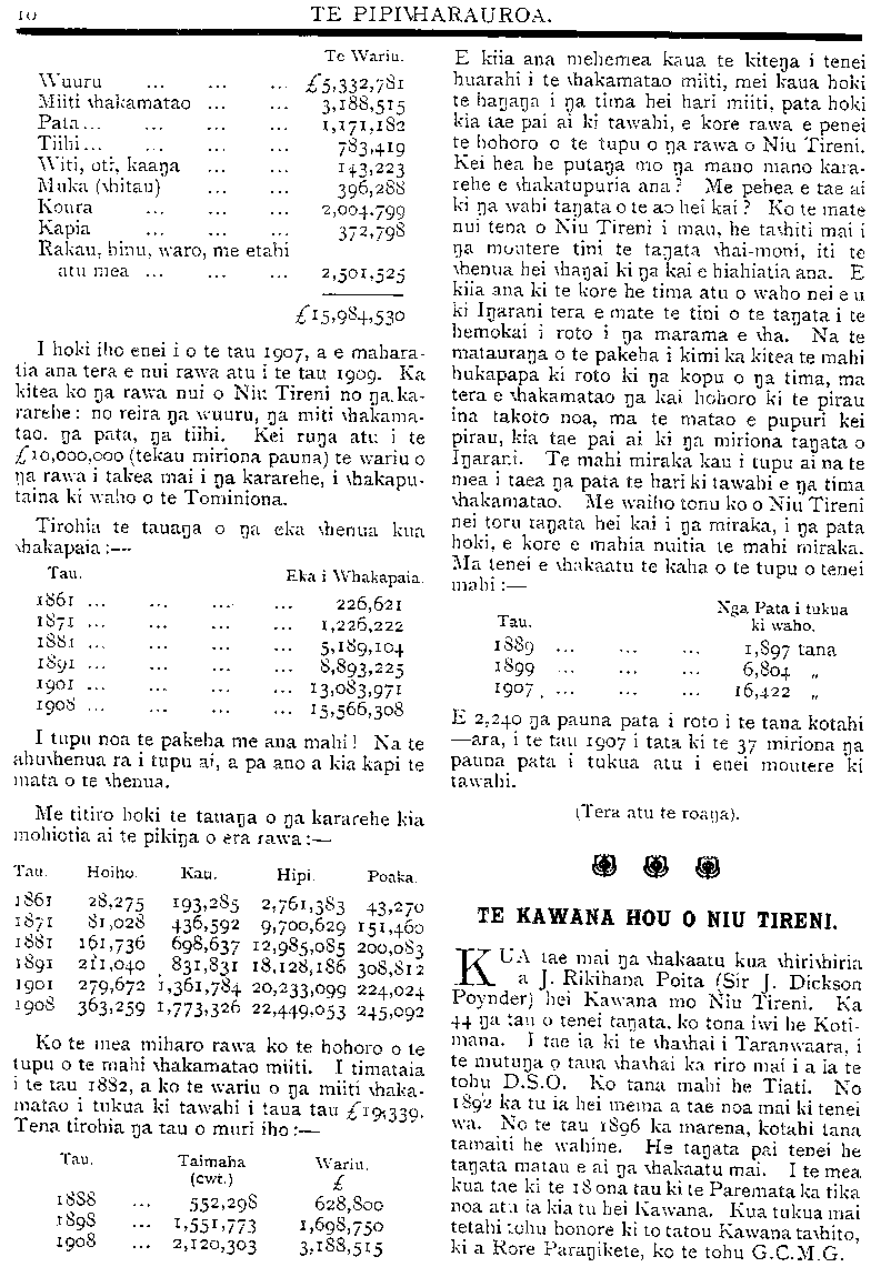 10 TE PIPIWHARAUROA. Wuuru Miiti whakamatao ... Pata... Tiihi... Witi, oti kaanga Muka (whitau) Koura Kapia Rakau; hinu, waro, me etahi atu mea ... Te Wariu. £5.332, 781 3,8, 515 1, 171, 182 783.419 143, 223 396, 288 2, 004.799 372, 798 2,501,525 £15, 984, 53o I hoki iho enei i o te tau 1907 a e mahara- tia ana tera e nui rawa atu i te tau 1909 Ka kitea ko nga rawa nui o Niu Tireni no nga. ka- rarehe: no reira nga wuuru, nga miti whakama- tao, nga pata, nga tuhi. Kei runga atu i te £10, ooo, ooo (tekau miriona pauna) te wariu o nga rawa i takea mai i nga kararehe, i whakapu- taina ki waho o te Tominiona. Tirohia te tauanga o nga eka whenua kua whakapaia: Tau. Eka i Whakapaia. l86l ... ... ... ... 226, 621 1871 l88l 1891 1901 1908 1, 220, 222 5, 189, 104 8, 893, 225 13, 083, 971 15,566, 308 I tupu noa te pakeha me ana mahi! Na te ahuwhenua ra i tupu ai, a pa ano a kia kapi te mata o te whenua. Me titiro hoki te tauanga o nga kararehe kia mohiotia ai te pikinga o era rawa:— Tau.1861 1871 1881 1891 1901 1908Hoiho.28, 275 81, 028161, 736 211, 040 279, 672363.259Kau.193.285436, 592 698, 637 831, 831 1, 361, 7841 773 326Hipi.2, 761, 383 9, 700, 629 12, 985, 085 18, 128, 18620, 233, 09922, 449, 053Poaka.^3^7° 151, 460200, 083 308, 812 224, 024 245, 092 Ko te mea miharo rawa ko te hohoro o te tupu o te mahi whakamatao miki. I timataia i te tau 1882, a ko te wariu o nga miiti whaka- matao i tukua ki tawahi i taua tau £19 339- Tena tirohia nga tau o muri iho:— Tau. 1888 1898 1908 Taimaha (cwt.) 552, 298 1, 55I,773 2, 120, 303 Wariu. £ 628, 800 1, 698, 750 3, 188, 515 E kiia ana mehemea kaua te kitenga i tenei huarahi i te whakamatao miiti, mei kaua hoki te hanganga i nga tima hei hari miiti, pata hoki kia tae pai ai ki tawahi, e kore rawa e penei te hohoro o te tupu o nga rawa o Niu Tireni. Kei hea he putanga mo nga mano mano kara- rehe e whakatupuria ana? Me pehea e tae ai ki na wahi tangata o te ao hei kai? Ko te mate nui tena o Niu Tireni i mau, he tawhiti mai i nga moutere tini te tangata whai-moni, iti te whenua hei whangai ki na kai e hiahiatia ana. E kiia ana ki te kore he tima atu o waho nei e u ki Ingarani tera e mate te tini o te tangata i te hemokai i roto i nga marama e wha. Na te matauranga o te pakeha i kimi ka kitea te mahi hukapapa ki roto ki nga kopu o nga tima, ma tera e whakamatao nga kai hohoro ki te pirau ina takoto noa, ma te matao e pupuri kei pirau, kia tae pai ai ki nga miriona tangata o Ingarani. Te mahi miraka kau i tupu ai na te mea i taea nga pata te hari ki tawahi e nga tima whakamatao. Me waiho tonu ko o Niu Tireni nei toru tangata hei kai i nga miraka, i nga pata hoki, e kore e mahia nuitia te mahi miraka. Ma tenei e whakaatu te kaha o te tupu o tenei mahi:— Nga Pata i tukua Tau. ki waho. 1889 ... ... ... 1; 897 tana 1899 ••• ••• ••• 6, 804 „ 1907 ... ... ... 16, 422 „ E 2, 240 nga pauna pata i roto i te tana kotahi —ara, i te tau 1907 i tata ki te 37 miriona nga pauna pata i tukua atu i enei moutere ki tawahi. (Tera atu te roanga). TE KAWANA HOU O NIU TIRENI. KUA tae mai nga whakaatu kua whiriwhiria a J. Rikihana Poita (Sir J. Dickson Poynder) hei Kawana mo Niu Tireni. Ka 44 nga tau o tenei tangata, ko tona iwi he Koti- mana. I tae ia ki te whawhai i Taranwaara, i te mutunga o taua whawhai ka riro mai i a ia te tohu D.S.O. Ko tana mahi he Tiati. No 1892 ka tu ia hei mema a tae noa mai ki tenei wa. No te tau 1896 ka marena, kotahi tana tamaiti he wahine. He tangata pai tenei he tangata matau e ai nga whakaatu mai. I te mea kua tae ki te 18 ona tau ki te Paremata ka tika noa atu ia kia tu hei Kawana. Kua tukua mai tetahi tohu honore ki to tatou Kawana tawhito, ki a Rore Parangikete, ko te tohu G. C.M. G.