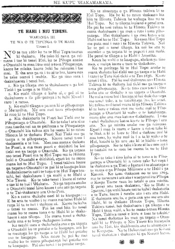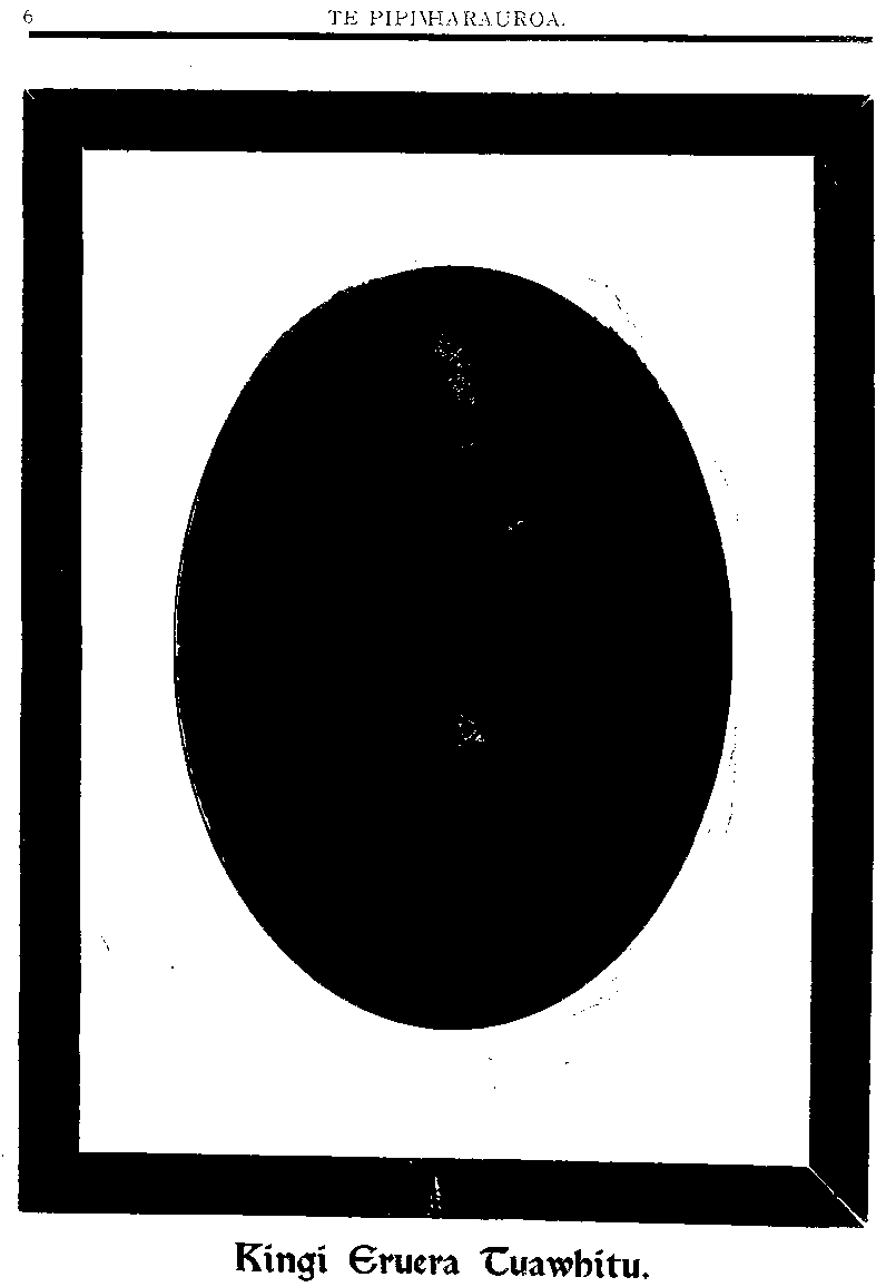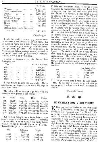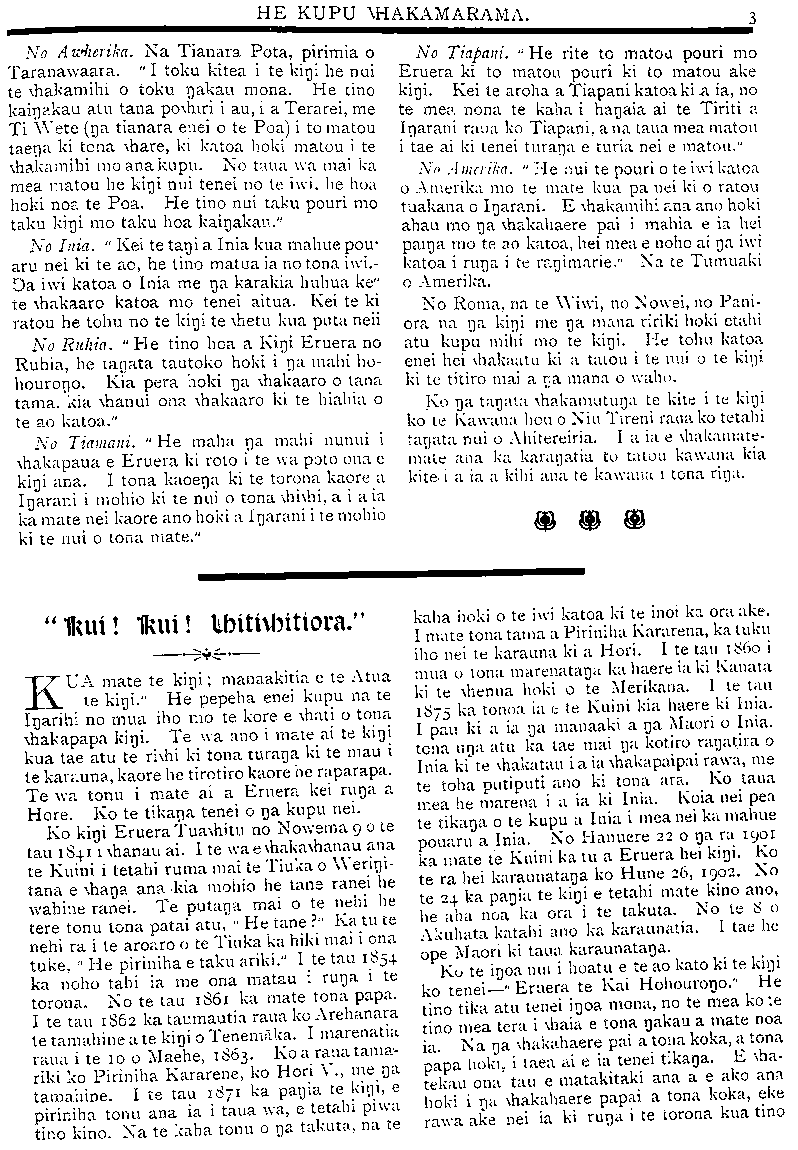 HE KUPU WHAKAMARAMA, No Awherika. Na Tianara Pota, pirimia o Taranawaara. " I toku kitea i te kingi he nui te whakamihi o toku ngakau mona. He tino kaingakau atu taua powhiri i au, i a Terarei, me Ti Wete (nga tianara enei o te Poa) i to matou taenga ki tona whare, ki katoa hoki matou i te whakamihi mo ana kupu. No taua wa mai ka mea matou he kini nui tenei no te iwi, he hoa hoki noa te Poa. He tino nui taku pouri mo taku kingi mo taku hoa kaingakau." No Inia. " Kei te tangi a Inia kua mahue pou- aru nei ki te ao, he tino matua ia no tona iwi Nga iwi katoa o Inia me nga karakia huhua ke" te whakaaro katoa mo tenei aitua. Kei te ki ratou he tohu no te kingi te whetu kua puta neii No Ruhia. "He tino hoa a Kingi Eruera no Ruhia, he tangata tautoko hoki i nga mahi ho- hourongo. Kia pera hoki nga whakaaro o tana tama. kia whanui ona whakaaro ki te hiahia o te ao katoa." No Tiamani. " He maha nga mahi nunui i whakapaua e Eruera ki roto i te wa poto ona e kingi ana. I tona kaoenga ki te torona kaore a Ingarani i mohio ki te nui o tona whiwhi, a i a ia ka mate nei kaore ano hoki a Ingarani i te mohio ki te nui o tona mate." No Tiapani. " He rite to matou pouri mo Eruera ki to matou pouri ki to matou ake kingi. Kei te aroha a Tiapani katoa ki a ia, no te mea nona te kaha i hangaia ai te Tiriti a Ingarani raua ko Tiapani, ana taua mea matou i tae ai ki tenei turanga e turia nei e matou." No Amerika. " He nui te pouri o te iwi katoa o Amerika mo te mate kua pa nei ki o ratou tuakana o Ingarani. E whakamihi ana ano hoki ahau mo nga whakahaere pai i mahia e ia hei painga mo te ao katoa, hei mea e noho ai na iwi katoa i runga i te rangimarie." Na te Tumuaki o Amerika. No Roma, na te Wiwi, no Nowei, no Pani- ora na nga kini me nga mana ririki hoki etahi atu kupu mihi mo te kini. He tohu katoa enei hei whakaatu ki a tatou i te nui o te kingi ki te titiro mai a nga mana o waho. Ko na tangata whakamutunga te kite i te kingi ko te Kawana hou o Niu Tireni raua ko tetahi tangata nui o Ahitereiria. I a ia e whakamate- mate ana ka karangatia to tatou kawana kia kite i a ia a kihi ana te kawana i tona ringa. "KUI! KUI! WHITIWHITIORA." KUA mate te kingi; manaakitia e te Atua te kingi." He pepeha enei kupu na te Ingarihi no mua iho mo te kore e whati o tona whakapapa kingi. Te wa ano i mate ai te kingi kua tae atu te riwhi ki tona turanga ki te mau i te karauna, kaore he tirotiro kaore he raparapa. Te wa tonu i mate ai a Eruera kei runga a Hore. Ko te tikanga tenei o nga kupu nei. Ko kingi Eruera Tuawhitu no Nowema 9 o te tau 18411 whanau ai. I te wa e whakawhanau ana te Kuini i tetahi ruma mai te Tiuka o Weringi tana e whanga ana kia mohio he tane ranei he wahine ranei. Te putanga mai o te nehi he tere tonu tona patai atu, " He tane?" Ka tu te nehi ra i te aroaro o te Tiuka ka hiki mai i ona tuke, " He piriniha e taku ariki." I te tau 1854 ka noho tahi ia me ona matau i runga i te torona. No te tau 1861 ka mate tona papa. I te tau 1862 ka taumautia raua ko Arehanara te tamahine a te kingi o Tenemaka. I marenatia raua i te 10 o Maehe, 1863. Koa raua tama- riki ko Piriniha Kararene, ko Hori V., me nga tamahine. I te tau 1871 ka pangia te kini, e piriniha tonu ana ia i taua wa, e tetahi piwa tino kino. Na te kaha tonu o na takuta, na te kaha hoki o te iwi katoa ki te inoi ka ora ake. I mate tona tama a Piriniha Kararena, ka tuku iho nei te karauna ki a Hori. I te tau 1860 i mua o tona marenatanga ka haere ia ki Kanata ki te whenua hoki o te Merikana. I te tau 1875 ka tonoa ia e te Kuini kia haere ki Inia. I pau ki a ia na manaaki a nga Maori o Inia. tona una atu ka tae mai nga kotiro rangatira o Inia ki te whakatau i a ia whakapaipai rawa, me te toha putiputi ano ki tona ara. Ko taua mea he marena i a ia ki Inia. Koia nei pea te tikanga o te kupu a Inia i mea nei ka mahue pouaru a Inia. No Hanuere 22 o nga ra 1901 ka mate te Kuini ka tu a Eruera hei kingi. Ko te ra hei karaunatanga ko Hune 26, 1902. No te 24 ka pangia te kingi e tetahi mate kino ano, he aha noa ka ora i te takuta. No te 8 o Akuhata katahi ano ka karaunatia. I tae he ope Maori ki taua karaunatanga. Ko te in oa nui i hoatu e te ao kato ki te kingi ko tenei—" Eruera te Kai Hohourongo." He tino tika atu tenei ingoa mona, no te mea ko te tino mea tera i whaia e tona ngakau a mate noa ia. Na na whakahaere pai a tona koka, a tona papa hoki, i taea ai e ia tenei tikanga. E wha- tekau ona tau e matakitaki ana a e ako ana hoki i nga whakahaere papai a tona koka, eke rawa ake nei ia ki runga i te torona kua tino