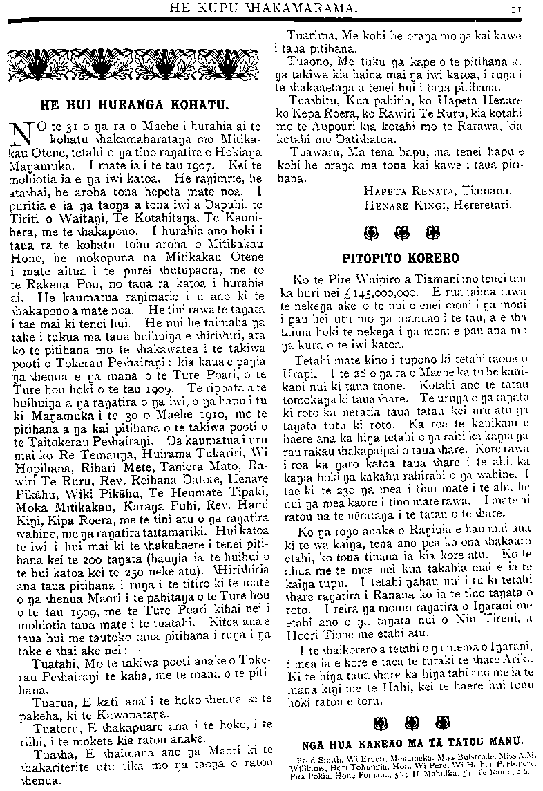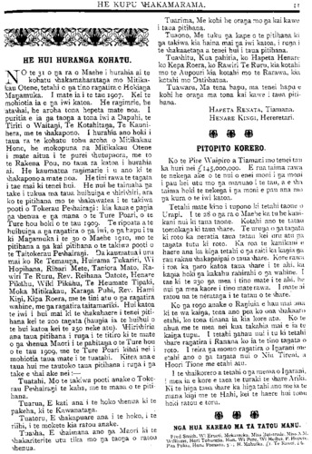 HE KUPU WHAKAMARAMA. 11 HE HUI HURANGA KOHATU. NO te 31 o nga ra o Maehe i hurahia ai te kohatu whakamaharatanga mo Mitika- kau Otene, tetahi o nga tino rangatira o Hokianga Mangamuka. I mate ia i te tau 1907 Kei te mohiotia ia e nga iwi katoa. He rangimarie, he atawhai, he aroha tona hepeta mate noa. I puritia e ia nga taonga a tona iwi a Ngapuhi, te Tiriti o Waitangi, Te Kotahitanga, Te Kauni- hera, me te whakapono. I hurahia ano hoki i taua ra te kohatu tohu aroha o Mitikakau Hone, he mokopuna na Mitikakau Otene i mate aitua i te purei whutupaora, me to te Rakena Pou, no taua ra katoa i hurahia ai. He kaumatua rangimarie i u ano ki te whakapono a mate noa. He tini rawa te tangata i tae mai ki tenei hui. He nui he taimaha nga take i tukua ma taua huihuinga e whiriwhiri, ara ko te pitihana mo te whakawatea i te takiwa pooti o Tokerau Pewhairangi: kia kaua e pangia nga whenua e nga mana o te Ture Poari, o te Ture hou hoki o te tau 1909 Te ripoata ate huihuinga a nga rangatira o nga iwi, o nga hapu i tu ki Mangamuka i te 30 o Maehe 1910, mo te pitihana a nga kai pitihana o te takiwa pooti o te Taitokerau Pewhairangi. Nga kaumatua i uru mai ko Re Temaunga, Huirama Tukariri, Wi Hopihana, Rihari Mete, Taniora Mato, Ra- wiri Te Ruru, Rev. Reihana Ngatote, Henare Pikahu, Wiki Pikahu, Te Heumate Tipaki, Moka Mitikakau, Karanga Puhi, Rev. Hami Kingi, Kipa Roera, me te tini atu o nga rangatira wahine, me nga rangatira taitamariki. Hui katoa te iwi i hui mai ki te whakahaere i tenei piti- hana kei te 200 tangata (haungia ia te huihui o te hui katoa kei te 250 neke atu). Whiriwhiria ana taua pitihana i runga i te titi ro ki te mate o nga whenua Maori i te pahitanga o te Ture hou o te tau 1909, me te Ture Poari kihai nei i mohiotia taua mate i te tuatahi. Kitea ana e taua hui me tautoko taua pitihana i runga i nga take e whai ake nei:— Tuatahi, Mo te takiwa pooti anake o Toke- rau Pewhairangi te kaha, me te mana o te piti- hana. Tuarua, E kati ana i te hoko whenua ki te pakeha, ki te Kawanatanga. Tuatoru, E whakapuare ana i te hoko, i te nihi, i te mokete kia ratou anake. Tuawha, E whaimana ano nga Maori ki te whakariterite utu tika mo nga taonga o ratou whenua. Tuarima, Me kohi he oranga mo nga kai kawe i taua pitihana. Tuaono, Me tuku nga kape o te pitihana ki nga takiwa kia haina mai nga iwi katoa, i runa i te whakaaetanga a tenei hui i taua pitihana. Tuawhitu, Kua pahitia, ko Hapeta Henare ko Kepa Roera, ko Rawiri Te Ruru, kia kotahi mo te Aupouri kia kotahi mo te Rarawa, kia kotahi mo Ngatiwhatua. Tuawaru, Ma tena hapu, ma tenei hapu e kohi he oranga ma tona kai kawe i taua piti- hana. HAPETA RENATA, Tiamana. HENARE KINGI, Hereretari. PITOPITO KORERO. Ko te Pire Waipiro a Tiamani mo tenei tau ka huri nei £145 ooo, ooo. E rua taima rawa te nekenga ake o te nui o enei moni i nga moni i pau hei utu mo nga manuao i te tau, a e wha taima hoki te nekenga i na moni e pau ana mo nga kura o te iwi katoa. Tetahi mate kino i tupono ki tetahi taone o Urapi. I te 28 o nga ra o Maehe ka tu he kani- kani nui ki taua taone. Kotahi ano te tatau tomokanga ki taua whare. Te urunga o nga tangta ki roto ka neratia taua tatau kei uru atu na tangata tutu ki roto. Ka roa te kanikani e haere ana ka hinga tetahi o nga raiti ka kangia nga rau rakau whakapaipai o taua whare. Kore rawa i roa ka ngaro katoa taua whare i te ahi, ka kangia hoki nga kakahu rahirahi o na wahine. I tae ki te 230 nga mea i tino mate i te ahi. he nui nga mea kaore i tino mate rawa. I mate ai ratou na te neratanga i te tatau o te whare." Ko nga rongo anake o Rangiuia e hau mai ana ki te wa kainga, tena ano pea ko ona whakaaro etahi, ko tona tinana ia kia kore atu. Ko te ahua me te mea nei kua takahia mai e ia te kainga tupu. I tetahi ngahau nui i tu ki tetahi whare rangatira i Ranana ko ia te tino tangata o roto. I reira nga momo rangatira o Ingarani me etahi ano o nga tangata nui o Niu Tireni a Hoori Tione me etahi atu. I te whaikorero a tetahi o nga mema o Ingarani, i mea ia e kore e taea te turaki te whare Ariki. Ki te hinga tana whare ka hinga tahi ano me ia te mana kingi me te Hahi, kei te haere hui tonu hoki ratou e toru. NGA HUA KAREAO MA TA TATOU MANU. Fred Smith, Wi Erueti, Mekameka, Miss Bulstrode. Miss A.M. Williams, Hori Tohungia, Hon. Wi Pere. Wi Heihei. P. Hopere. Pita; Pokia, Hone Pomana, 5/-; H. Mahuika. £1. Te Rahui 2 0.
