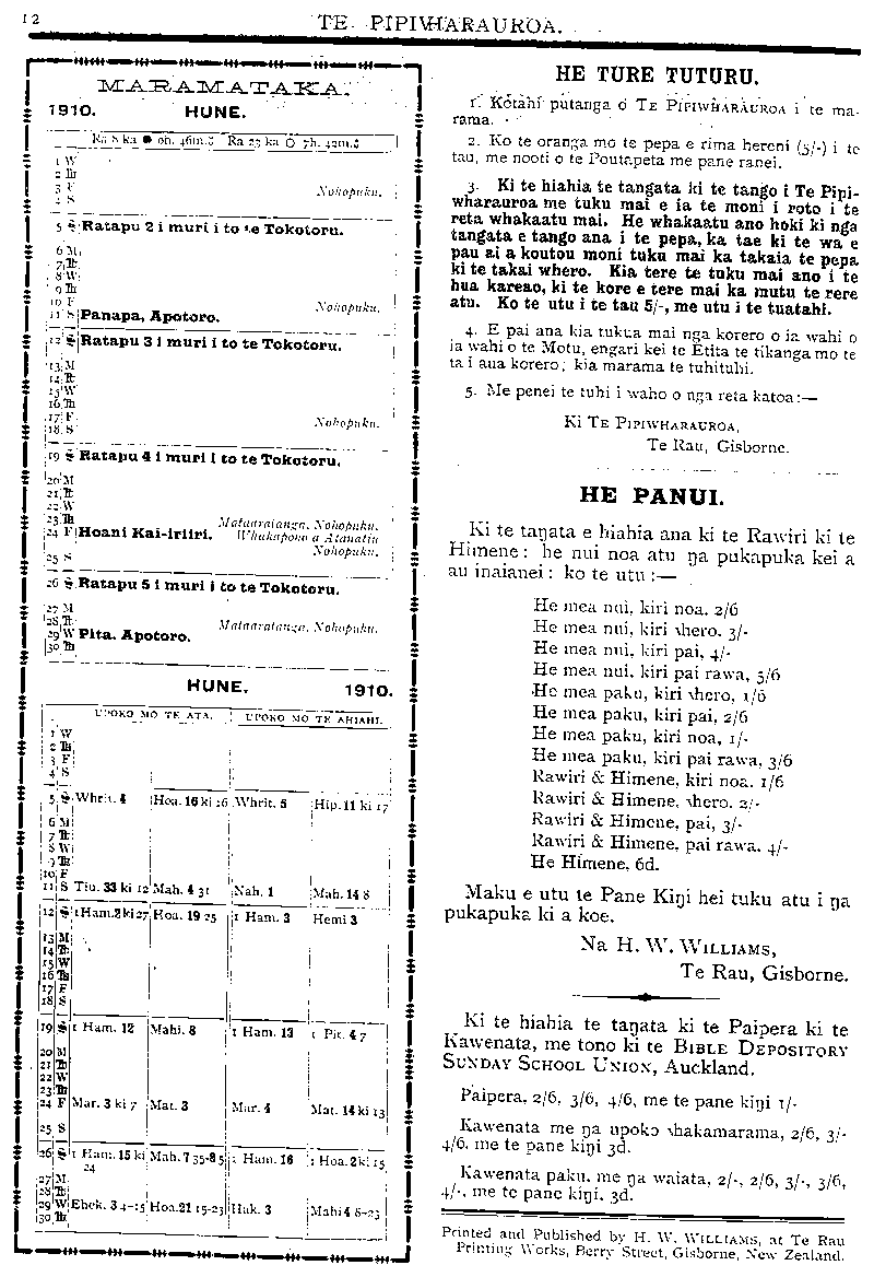 TE PIPIWHARAUROA. HE TURE TUTURU. 1. Kotahi putanga o TE PIPIWHARAUROA i te ma- rama. 2. Ko te oranga mo te pepa e rima hereni (5/-) i te tau, me nooti o te Poutapeta me pane ranei, auaka i te tiaki he pane kingi hepene nga pane e tino hiahiatia ana. 3. Ki te pau nga hereni a tetahi tangata i tuku mai ai ka tukua atu he kaute. Ki te tae atu te kaute kia hohoro te tuku mai i te moni, na te moni hoki i puta atu ai te pepa ehara i te mea tupu noa. 4. E pai ana kia tukua mai nga korero o ia wahi o ia wahi o te Motu, engari kei te Etita te tikanga mo te ta i aua korero : kia marama te tuhituhi. 5. Me penei te tuhi i waho o nga reta katoa: — Ki TE PIPIWHARAUROA, Te Rau, Gisborne. HE PANUI Ki te tangata e hiahia ana ki te Rawiri ki te Himene : he nui noa atu nga pukapuka kei a au inaianei : ko te utu : — He mea nui, kin noa ... 2/6 He mea nui, kiri wher ... 3/- He mea nui, kiri pai ... 4/— He mea nui kiri pai rawa ... 5/6 H e mea paku, kiri whero ... 1/6 H e mea paku, kiri pai . . . 2/6 He mea paku, kiri noa ... 1/- He mea paku, kiri pai rawa 3/6 Rawiri & Himene, kiri noa 1/6 Rawiri & Himene, whero ... 2/- Rawiri & Himene, pai ... 3/- Rawiri & Himene, pai rawa 4/- He Himene ... ... -/6 Maku e utu te Pane Kingi hei tuku atu i nga pukapuka ki a koe. Na H. W. WILLIAMS, Te Rau, Gisborne. Ki te hiahia te tangata ki te Paipera ki te, Kawenata, me tono ki te BIBLE DEPOSITORY SUNDAY SCHOOL UNION, Auckland. Paipera, 2/6, 3/6, 4/6, me te pane kingi //- Kawenata me nga upoko whakamarama 2/6 3/- 4/6, me te pane kingi 3d. Kawenata paku, me nga waiata 2/-, 2/6, 3/-, 3/6, 4/-, me te pane kingi, 3d. Printed and Published by H. W. WILLIAMS, at Te Rau Printing Works, Berry Street, Gisborne, New Zealand.