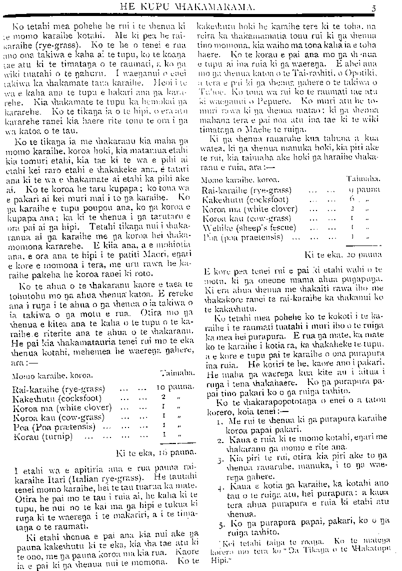 HE KUPU WHAKAMARAMA. Ko tetahi mea pohehe he rui i te whenua ki te momo karaihe kotahi. Me ki pea he rai- karaihe (rye-grass). Ko te he o tenei e rua ano ona takiwa e kaha ai te tupu, ko te koanga tae atu ki te timatanga o te raumati, a ko nga wiki tuatahi o te ngahuru. I waenganui o enei takiwa ka whakamate taua karaihe. Heoi i te wa e kaha ana te tupu e hakari ana nga kara- rehe. Kia whakamate te tupu ka hemokai nga kararehe. Ko te tikanga ia o te hipi. o era atu kararehe ranei kia haere rite tonu te ora i na wa katoa o te tau. Ko te tikanga ia me Whakaranu kia maha nga momo karaihe, koroa hoki, kia matamua etahi kia tomuri etahi, kia tae ki te wa e pihi ai etahi kei raro etahi e whakakeke ana. e tatari ana ki te wa e whakamate ai etahi ka pihi ake ai. Ko te koroa he taru kupapa; ko tona wa e pakari ai kei muri mai i to na karaihe. Ko nga karaihe e tupu poupou ana, ko na koma e kupapa ana; ka ki te whenua i na tarutaru e ora pai ai nga hipi. Tetahi tikanga nui i whaka- ranua. ai na karaihe me nga koroa hei whaka- momona kararehe. E kiia ana, a e mohiotia ana, e ora ana te hipi i te patiti Maori. engari e kore e momona i tera, me uru rawa he ka- raihe pakeha he koroa ranei ki roto. Ko te ahua o te whakaranu kaore e taea te tohutohu mo nga ahua whenua" katoa. E rereke ana i runga i te ahua o nga whenua o ia takiwa o ia takiwa o nga motu e rua. O tira mo nga whenua e kitea ana te kaha o te tupu o te ka- raihe e riterite ana te ahua o te whakaranu. He pai kia whakamatauria tenei rui mo te eka whenua kotahi, mehemea he waerenga ngahare, ara:— Momo karaihe. koroa. Taimaha. Rai-karaihe (rye-grass) Kakewhutu (cocksfoot) Koroa ma (white clover) Koroa kau (cow-grass) Poa (Poa praetensis) ... Korau (turnip) 10 pauna. 2 1 1 1 1 Ki te eka, 16 pauna. I etahi wa e apitiria ana e rua pauna rai- karaihe Itari (Italian rye-grass). He tautahi tenei momo karaihe, hei te tau tuarua ka mate. Otira he pai mo te tau i mia ai, he kaha ki te tupu, he nui no te kai ma nga hipi e tukua ki runga ki te waerenga i te makariri, a i te tima- tanga o te rau mati. Ki etahi whenua e pai ana kia nui ake na pauna kakewhutu ki te eka, kia wha tae atu ki te ono, me nga pauna koroa ma kia rua. Kaore ia e pai ki nga whenua nui te momona. Ko te kakewhutu hoki he karaihe tere ki te toha. na reira ka whakamamatia tonu rui ki na whenua tino momona kia waiho ma tona kaha ia e toha haere. Ko te korau e pai ana mo na whenua e tupu ai ina mia ki na waerenga. E ahei ana mo nga; whenua katoa o te Tai-rawhiti, o Opotiki. a tera e pai ki nga whenua. ngahere o te takiwa o Tuhoe Ko tona wa rui ko te raumati tae atu ki waenganui o Pepuera Ko muri atu he to- muri ravva ki na whenua matao; ki nga whenua mahana tera e pai noa atu ina tae ki te wiki timatanga o Maehe te mina. Ki nga whenua rauaruhe kua tahuna a kua watea, ki na whenua manuka hoki, kia piri ake te rui, kia taimaha ake hoki na haraihe whaka- ranu e mia, ara:— Momo karaihe koroa. Taimaha. Rai-karailie (rye-grass) ... ... 9 pauna Kakewhutu (cocksfoot) ... ... 6 " Koroa ma (white clover) ... ... 2 " Koroa kau (cow-grass) ... ... 1 Wehike (sheep's fescue) ... ... 1 Poa (poa praetensis) ... ... ... 1 Ki te eka. 20 pauna E kore pea tenei rui e pai ki etahi wahi o te motu ki na oneone mama ahua pungapunga Ki era ahua whenua me whakaiti rawa iho me whakakore ranei te rai-karaihe ka whakanui ko te kakawhutu. Ko tetahi mea pohehe ko te kokoti i te ka- raihe i te raumati tuatahi i muri iho o te mina ka mea hei purapura. E rua nga mate, ka mate ko te karaihe i kotia ra, ka whakaheke te tupu, a e kore e tupu pai te karaihe o ona purapura ina mia. He koriri te he, kaore ano i pakari. He maha nga waerenga kua kite au i aitua i runga i tena whakahaere. Ko nga purapura pa- pai tino pakari ko o nga mina tawhito. Ko te whakarapopototanga o enei o a tatou korero, koia tenei:— 1. Me rui te whenua ki na purapura karaihe koroa papai pakari. 2. Kaua e mia ki te momo kotahi, engari me whakaranu nga momo e rite ana. 3. Kia piri te rui, otira kia pin ake to nga whenua rauaruhe, manuka, i to nga wae- renga ngahere .1. Kaua e kotia na karaihe, ka kotahi ano tau o te mina atu, hei purapura: a kaua tera ahua purapura e ruia ki etahi atu whenua. 5. Ko na purapura papai, pakari, ko u nga ruinga tawhito. Kei tetahi tainga te roanga: . Ko te matenga korero mo tera; ko " Nga; Tikanga o te Whakatupu Hipi."
