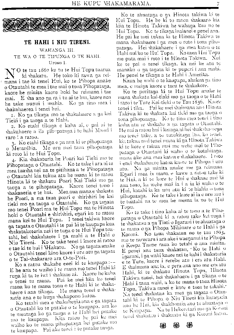 WHAKAMARAMA. Ko te ahuatanga o na Hinota takiwa ki te Hui Topu. He he ki to ratou whakaaro kia kiia te Hinota Takiwa he wahanga kau no te Hui Topu. Ko te tikanga inaianei e penei ana. He pai ke mei tukua ki te Hinota Takiwa te mana whakahaere i nga mea o roto i tona piho- patanga. Hei whakahaere i nga mea katoa o te Hahi nui ko te Mui Topu. Ko taua Hui Topu me puta mai i roto i te Hinota Takiwa. Nui ke te pai o tenei tikanga, ka nui ke atu te manako o na tangata ki te pupuri i aua mahi He penei te tikanga a te Mahi i Amen ka. Kaua he wahi o te kaupapa, ahakoa nga tino mea, e meinga kaore e taea te whakakore. Ko te puritanga ki te Mui Topu anake te mana whakatu kai-tiaki mo na taonga o te Hahi i raro i te- Ture Kai-tieki o te Tau 1856. Kaore tenei i tika. Pai ke mei whaimana ano I Hinota Takiwa ki te whakatu kai tieki mo nga taonga o tuna pihopatanga Ko te tino mea tenei i tino kaha atu te whakahe a nga tangata o Otautahi He nui a ratou hui i karanga ai hei whakahaerenga mo tenei take. a te tutukitanga iho ko tenei. kia tukua mai tenei mana ki na Hinota Takiwa ki te kore e tukua mai me wehe mai te Piho- patanga o Otautahi ki waho o te kotahitanga, mana ake ana mea katoa e whakahaere. I roto i enei whakahaere katoa kaore te Pihopa i uru atu. Na nga minita anake me nga reimana Engari i mea ia mana e kawe a ratou take ki te Hui, a ki te kore te Hui e whakaae mai ki aua tunu, ka wehe mai ia i a ia ki waho o te Hui, katahi ia ka uru atu ki te hiahia o tona pihopatanga. Ko te take i kore ai ia e uru atu i te tuatahi na te mea he mema ia no te Hui Topu. Ko tu take i tino kaha ai te tono a te Piho- patanga o Otautahi ki a ratou take kei Tuna i te whakatau a nga Tiati o Ingarani i te ahuatanga o te- mana o nga Pihopa Mihinare o te Hahi i na Koroni. Ko taua whakatau no te tau 1863, mo te raruraru i ara ake i waenganui i te Pihopa o Keepa Taone raua ko tetahi o ana minita. E penei; ana taua whakatau, " Ko tu Hahi o Ingarani i na wahi kaore nei te hahi i whakaturia e te Ture, kaore i rereke atu i era atu Hahi. E whaimana ana ia, e pera ana ano me era; atu Hahi, ki te whakatu Hinota Topu, Hinota Takiwa ranei, hei whakahaere i nga tikanga o te Hahi i taua wahi, a ko te mana o taua Hinota Topu, Takiwa ranei e kore e taea te takahi." Na tenei whakatau ka mea na tanata u Otau- tahi ki te Pihopa o Niu Tireni kia karangatia ano he Hui, kia whakahoutia ano te ahuatanga o te Kaupapa Na te Hekeretari mo na Koroni tenei whakatau i whakaatu ki na Koroni katoa
