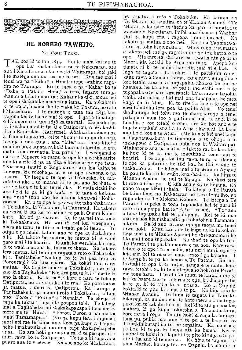 8 TE PIPIWHARAUROA. HE KORERO TAWHITO. Na MOHI TUREI. TAE noa ki te tau 1835- Kei te mahi kai ma te ope kua whakatakara ra te Kakaratau, atu ano i Nukutaurua a tae noa ki Wairarapa, hei ngaki i te matenga ona ma ua me te iwi. Kua tae mai i tenei wa nga " Kaha " a Hinetautope. wahine ranga- tira no Tauranga. Ko te ingoa o na " Kaha" ko te Ngaku o Pakura Hoia," o tona tungane turanga whanau e takoto mai ra i Kahanui-a-tiki, mona nei te ope i whakatakaia nei tana tama. Ka aukahatia ki te waka, huaina iho te waka ko Pakura, no roto i Maraehara. I te mutunga o taua tau 1835 kua rangona kei te haere mai te ope. I na ra timatanga o Hanuere o te tau 1836 ka tae mai. He maha nga ra i whakamanuhiritia ai e Ngatiporou, o Whakawhi- tira o Rangitukia. Kati tenei. Ahakoa kauwhau noa a Taumata-a-kura, kei te " kuhu" tonu nga ihu o na tohunga i ona atua i ana "kite,"ara "matakite" i ona iho tana tanata ra hoki kua matotorutia ki ana mahi, kua ururuatia, kua patiotia. I waenganui o na ra o Pepuere ka manu te ope he mea whakarite ano ki a rite Id na ra tika e haere ai na ope taua. " Kia mau tautiti o Rongouaroa," ara kia kainga te kumara, kia rokohanga ai e te ope i waenga o na maara. Te taenga o te ope ki Tokakuku, ka ma- takitaki ake i te moana ki te pa. ano he whata e kore e taea e te kuri te rei ake. E matakitaki iho ana hoki te pa ki na waka o te taua e kukupa ana "ura" tonu ano he moana kahawai " Kohu- rawea." Ka u te ope ki na awa i te taha whakararo o Tokakuku, ki Waiopure, ki Tauranui. Ka takoto nga waka ki uta kei te hanga i te pa ki Oumu Kahu- kura. Ka oti na wharau. Ko te pa nei tata tonu ki Tokaakuaku. He wai iti nei kei waenganui, marama tonu te titiro a tetahi pa ki tetahi. Te otinga o na mahi. katahi ano te ope ka whakakite i a ia. Ka takoto he matua, he matua ki te wahi ngaro mai i te hoariri. Katahi ka werohia, ka puta Id te wahi marama ka tukua te whana. Ka takoto tera matua, kai te ui na tanata o roto o Tokakuku ki a Tangitaheke " Ka kiia ko te iwi pea tera ko Porourangi?" ka kiia ehara. Ka kokiri tahi ona matua. Ka tangi te umere a Tokakuku; me te ki ano ki a Tangitaheke " Koi ara pea te iwi?" me te ki ano ia ehara. Ka ki ia " E kore e ngaro te tohu a Ngatiporou, he ra whangake i te rua." Ka poto katoa nga matua, i muri ta Ngatiporou. Ka karanga a Tangitaheke ki na mano i roto i Tokakuku; katahi ano "Porou," " Porou" a "Nanaia." Te ekenga ki runa ka tukua i runga i te poupou tahi. Te kitenga mai a Tangitaheke kai whakakapakapa i tona mere- mere me te " Haha." " Porou, Porou a nanaia ka mahi Tamamapua." (Ko na kupu tera i rangona i muri nei me te kiinga ano, koia na kupu a Tangita- heke i makututia ai mo aua kupu whakapehapeha ana). Ka ara hoki na matua ra ki te peruperu; i muri rawa ko ta Ngatiporou. Te tuna ki runa. ana puare ana te waewae, Ka aue ano ko Whakatana, he rangatira i roto o Tokakuku. Ka karanga kia Te wharau he rangatira no te Whanau Apanui. "Te wharau e. ka ngaro te whenua ka ngaro te tanata i te waewae o Kakatarau, ihiihi ana whenua i Waiho." (Ko na kupu ena i rangona i muri iho nei). Ka takoto na matua e ono nei. Ka tu a Taumata-a- kura ka tohu ki nga matua. Whakarongo e nga matua e takoto nei. me na rangatira me nga toa katoa o te ope. Whakarerea whakarerea rawatia atu na atua Maori. kia kotahi he Atua mo taua. Apopo koe timata ai ki te mahi i haeretia mai ai e koe. E hinga te tangata i to kokiri. i to parekura ranei. kaua rawa e taonga e kainga, kaua rawa e tangohia e koe tetahi mea a to tupapaku ahakoa he pu. he hamanu he kakahu, he patu. me etahi mea a te tupapaku o te parekura ranei: kaua rawa e tangohia waiho atu mana e tiki mai ona tupapaku, he mea kana na te Atua. Ki te rite i a koe e te ope nei enei tohutohu tera pea ka pai te Atua. Ko tenei whawhaitanga hei tohu mo te maungaarongo o tenei pakanga o mua iho o na tipuna mai ra ano. ki te takahia e koe tetahi o enei tare ko koe ano e te tanata e takahi ana i a te Atua i kanga ai, ka kanga ano hoki koe e te Atua. (Me ki ake kei enei kupu a Taumata-a-kura te timatanga o te ohonga o te whakapono o Ngatiporou puta noa ki Wairarapa). Whakarongo ana nga matua e takoto ra. ka karakia, ka hoki ki te pa me te matakitaki tonu mai te hoariri. I te aonga, ka tau rawa te ra ka tikina e te ope ka pataritia, he tiki kai, he tiki wahie te whakataruna. Te kitenga mai o te Whanau Apanui ka pau te kokiri ki waho, kua whawhai. Ka hina te Whanau Apanui he nui te hinana. Ka whati tera ki roto o tona pa. E kiia ana e 25 te hinana. Ka noho te ope kihai i whaia. Te kitenga o Te Parata he taina tenei no Kakatarau no raro tonu iho. no runga ake i a Te Mokena Kohere. Te kitenga a Te Parata i tupeka a tona tupapaku kei te puru ki roto i taua paipa kai te " Pato " i te ahi. " To " ano a tana tupapaku kei te puhipuhi. Kei te ki noa mai na hoa kia maharatia na tohutohu a Taumata- a-kura. Ka ki ano ia, ana mo na taonga mo tenei rawa hoki. Mutu kau ano te kupu ra ko te kokiri- tanga mai a te Whanau Apanui he whakamomori he tiki mai i ona tupapaku. Ka whati te ope ka tu a Te Parata i te pu, ka mauria e nga hoa. Kore rawa tetahi o te ope i tu e puhia atu nei i muri, engari e kiia ana kei te rere te mata i roto i nga kakahu. I te taenga ki te pa ka hemo a Te Parata. Ka ma- takitaki te ope ki to ratou ngaunga e te mata, kore rawa tetahi i tu. ki te matenga ano hoki o te Parata mo tona hara. I te ata ka mutu te karakia me te kai ka haere ano te kokiri a te ope, ka whakapiritia ki te pa ki te taha ki te moana. Ko ta Ngapuhi kokiri ki te pito ki runga o te pa. Ka hinga a ano te Whanau Apanui. Te tuna te tanata i a Tamaki- hikurangi, ka unuhia e ia te hate whero u tana tupa- paku kei te kakahu ki a ia. Kei ki te atu nga hoa kia mahara ki na kupu tohutohu a Taumataakura, kore rawa i rongo Tu atu hoki ki runga ka tangi atu tona pu, puhia mai ana e te pu a te hoariri, ko Tamakihikurangi ka tu, he rangatira. Ka mauria e nga hoa ki te pa, te taenga atu ka hemo. Kei te whawhai te kokiri a Ngapuhi i te pito ki runa o te pa, i te taha ano ki te moana. Ka hinga