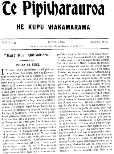 Te Pipiwharauroa HE KUPU WHAKAMARAMA. NAMA 147. GISBORNE. HURAE 1910. " He ao te rangi ka uhia He huruhuru te manu ka rere." "KUI! KUI! WHITIWHITIORA." ——— TOHEA TE TOHE. ITE tau 1908 i whakahaere tetahi pitihana e nga Maori kia tukua mai e te Kawana- tanga te mana pooti mo te waipiro ki a ratou. Ko taua pitihana he tono tonu atu i te mana pooti mo te turaki waipiro ki a homai ki nga Maori, a ki te kore e taea tera kati me homai nga Maori kia pooti mo ratou ano. Ko te tikanga o taua tono e penei ana, ko nga rohe pooti a na Maori ko nga rohe kaunihera: mehemea ki te nui nga Maori o tetahi rohe kaunihera e pooti kia hina te waipiro, ka hinga ano te waipiro i taua rohe ki a ratou, ara ka kore ratou e ahei te unu i te waipiro, engari ko nga hotera ka tu tonu mo nga pakeha, ma te pooti pakeha rawa ka hinga ai ngo hotera. Ko ta te Maori pooti i tenei pitihana mona ake ano. He pai a he kino ano kei roto i te tikanga e whaia nei e tenei pitihana, kati na runga tonu i te whakaaro iho ko tenei te tikanga e ahua ngawari mai ai te Kawanatanga na reira ka whaia, engari hoki i te korerawa. I whakatakotoria tenei pitihana ki te aroaro i te Pirimia e te hui Maori i tu nei ki Poneke i te tau 1908, whakahokia ana mai e tera mana e whakaaro. Kati kei te whakaaro tonu taea noatia mai tenei ra. Inatata ake nei te tunga o tetahi Inu nui ki Poneke na te taha turaki waipiro I whakahaerea te taha Maori o tenei take i taua hui a ko te motini i pahitia e taua hui ko tenei, "I te mea e whaka- aetia ana e na huihuinga katoa o te Maori o te Pakeha hoki te tika o te mana turaki waipiro kia tukua atu ki te Maori, he tono atu tenei ki te Kawanatanga kia hanga he rora mo nga Maori e noho ana i roto i nga rohe pooti o nga mema Pakeha, kia taea ai tenei mea e hiahiatia nei; ko na Maori i roto i aua roru me whai mana ki te pooti mo te take waipiro anake i te taima ano e pooti ai nga pakeha, kia kotahi tonu he pooti ma te pakeha raua ko te Maori mo taua take." Ki te ata titiro iho ko te tikanga pai rawa tenei. Kaore ia matou i te hiahia ki te whaiwhai atu ki roto i enei tikanga e rua ki te rapu atu i na pai i na kino ranei o tetahi o tetahi. Ko ta matou he whakaoho ano i o tatou whaka- aro ki tenei mea nui. Ka nui te kaha o tatou hoa Pakeha ki te tohe ki te Kawanatanga kia tukua mai he mana pooti kia tatou, engari kei te whakaaro tonu te Kawanatanga. He aha ra i kore ai e hohoro te tuku mai a te Kawana- tanga i tenei mana? Ma matou e ki ake he kore no te iwi e whakaatu ki te Kawanatanga kei te hiahia ia. He tika ano i puta he kupu ma te iwi i te tau 1908 engari kaore ia e rarua i te wero kotahi, engari me waiho auau tonu, kia kite mai ai ia he tika te ngakau nui o te iwi, ka homai. He penei te tikanga a te Kawana- tanga. Kaore ia e homai i tetahi mea i runa i te tono kotahi, engari mehemea ka waiho putu- putu tonu, ahakoa he aha nga mea uaua hei arai atu ka rapua ano e ia tetahi huarahi e homai ai. Ina te huarahi kua kitea e te