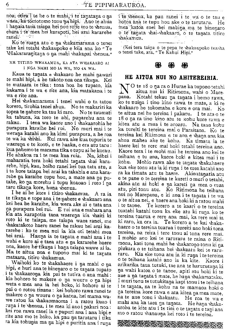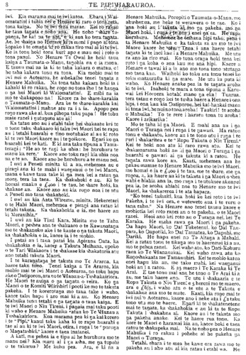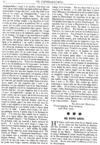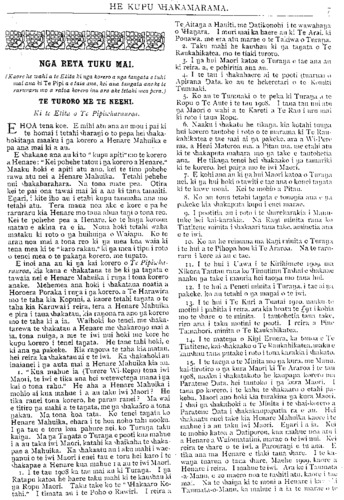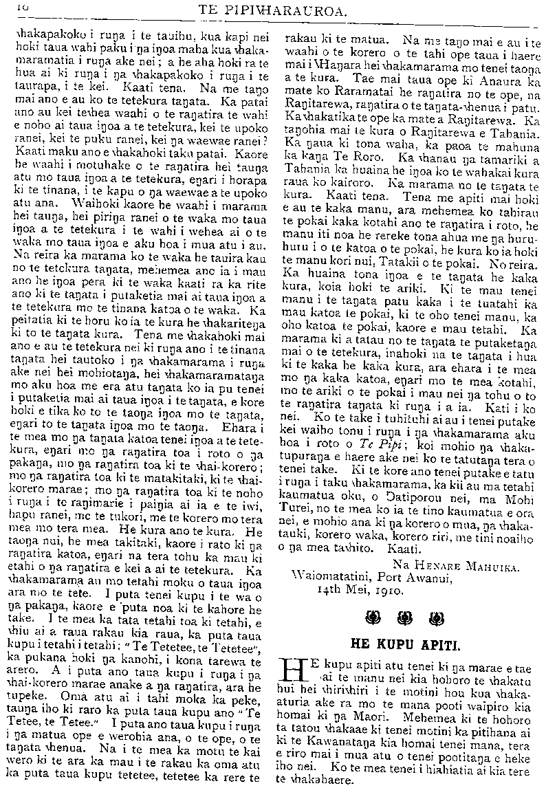 HE KUPU WHAKAMARAMA. NGA RETA TUKU MAI. (Kaore he wahi a te Etita ki nga korero a nga tangata e tuhi mai ana ki Te Pipi a e taia ana, kei ana tangata anake te raruraru mo a ratoa korero ina ara ake tetahi mea pera.) TE TURORO ME TE NEEHI. Ki te Etita o Te Pipiwharauroa E HOA tena koe. E mihi atu ana au mou i pai ki te homai i tetahi wharangi o to pepa hei whaka- hokitanga maaku i na korero a Henare Mahuika e pa ana mai ki a au. E whakaae ana au ki to " kupu apiti" mo te korero a Henare: " Kei pohehe tatou i na korero a Henare." Maaku hoki e apiti atu ano, kei te tino pohehe rawa atu nei a Henare Mahuika. Tetahi pohehe nui whakaharahara. Na tona mate pea. Otira kei te pai ona tawai mai Id a au ki tana tamaiti. Engari, i kite iho au i etahi kupu taumaha ana mo tetahi atu. Tera maua noa ake e kore e pa he raruraru kia Henare mo taua ahua tangi o tona reo. Kei te pohehe pea a Henare. ko te hanga koroua matau e akina ra e ia. Nona hoki tetahi waha mataku ki roto o na huihuinga o Waiapu. Ko te arau noa mai a tona reo ki ua mea kua waia ki tena mea ki te " karo rakau," ki na mea i tipu i roto o tenei mea o te pakanga korero, me tupato. E inoi ana au ki na kai korero o Te Pipiwha- rauroa, kia kaua e whakataua te he ki nga tanata e tawaia nei e Henare Mahuika i runa i tona korero anake. Mehemea ana hoki i whakataua noatia a Horoera Poraka i runa i nga korero, a Te Harawira ino te taha kia Kopuni, a kaore tetahi takata, o te taha kia Haruwai i reira, tera a Henare Mahuika e pira i taua whakatau, kia rakona ra ano ya korero ino te taha ki a ia. Waihoki ko tenei, ine whaka- tarewa te whakatau a Henare me whakaroho mai a ia, tona nuina, a me te iwi nui hoki me kore he kupu korero' i tenei tagata. He tane tahi hoki, e ki ana na pakeke. Kia i-anomi te taha kia matau, hei reira ka whakatau ai e te iwi. Ka whakahoki au inaianei i nga auta mai a Henare Mahuika kia au. i. "Kua mahue ia (Turere Wi-Repa) tona iwi Maoii, te iwi e tika ana hei wcteweteiJa inanaiija kai o tona rahu." He aha a Heuare Mahuika i mohio ai kua mahue i a au taku iwi Maori ? He tika ranei tona korero, he parau ranei ?a Ma wai e titiro na mahi a te taitata, me na whakaaro a tona nakau. ^ Ma tona hoa tata. Ko tenei tayat;i ko Henare Mahuika, ehara i te hoa noho tahi nooku. I ya tau e toru kua pahure nei, ko Turai.t;i taku kaika. Ma oa Tanata o Turaka e pooti kua mahue i a au taku iwi Maori, katahi ka whaikaha te whaka- pae a Mahuika. Ka whakaatu au i aku mahi i wae- iJanui o te iwi Maori i enei tau e toru hei karo i te Whakapae a Henare kua mahue i a au te iwi Maori. i. I te tau 1908 ka tae mai au ki Turaka. I i)a Ratapu katoa he haere taku mahi ki te kauwhau ki ya Ropu Maori. Taku take ko te " Wakaaro Ko- tahi." I timata au i te Poho o Rawiri. I reira a Te.AitaQn a Hauiti, me Datikonohi i te wawahai];i o MI-anara. I muri mai ka haere au ki Te Arai.'ki Pouawa, ine era atu marae o te Takiwa o Turait;i. 2. Taku mahi he kauwhau ki qa tanata o Te Raukahikatea. rno te tiaki turoro. 3- } ua hui Maori katoa o Turaya e tae aua au ki reira, a, e pohiritia ana au. 4. I te tau i whakahakre ai te pooti tuanui) o Apirana Oata.. ko au te hekeretari o te Komiti Tumuaki. 5. Ko au te Tumuaki o te peka ki Turait;i ;i te Ropu o Te Aute i te tau 1908. I taua tau inu .itu iJa Maori o wahi a te Kareti ;i Te Kau i uru mai ki roto i taua Ropu. 6. Naaku i whakatu he tik;iiJ:i, kia kot;ihi tunii;i hui korero tautohe i roto o te 'lu;u-;un;i ki Te R;ui- kahikatea e tae mai ai 11.1 pakeke, ani a Wi-Perc ma, a Heni Materoa m;i. a Pitau 111:1. me etahi ;itu ki te whakaputa uiahara mo 11.1 take e t;uitohpti;i ana. He tikaka tenei hei whakaako i ua t;uu;u-iki ki te korero, hei paiij;i mu te iwi Maori. 7. E kohi aua au ki ua hui M;iori katoa, o Tiir;iiJ;i nei. ki IJ.I hui hoki o t;iwiti e tae aua o konei t;ui;it;i ki te kawe moni. Kei te mohio ;i Pitau. 8. Ko ;iu tonu tetahi lay.-il;l e tuiioi)ia ;m;i i." ii;i pakeke ki;i \\hakaput;i kupu i enei iii;ir:ic. 9. I pootiti;i au i reto i te \\hcircka.raki;i i M;i.mi- tuke hei k;ii-k;irakia. X;i R;ii)i iiuiut;i r;m;i ko Tiatitcut- minita i \\h;ika;iri tau;i t;ike, aminetia ;ni;l e te iwi. 10. Ko au he reiiiiaua ina R;iiJi minita o Tur;iiJ;i i te hui a te Pihopa hou ki Te Ar;iroa. Na te raru- raru i kore ;u au e tae. 11. I te hui i L'aw;i i te Kirihimete i^uy. 111.1 Nikor;iTaut:ui mu;i ko Timutimu Ta\\h;ii e \\h;ik;i;ie uaaku i}a take i manria hei t;ioi)a ino taua hui. 12. I te hui a Peneti minita i Tiir;ii];i, i t;ie ;u i.l;l pakeke, ko au tetahi o IJ.I inaiJ;ii o te iwi. 13. I te hui i Te Kuri .1 Tuat;u iyio, n;i.;iku.U- motini i pahitia i reira, ar;i kia hoatu te AJI i kohi;i mo te \\harc o te minit;i. I t;iutnhcti;i tau;i t;ike. riro ana i taku motini te pooti. I reira ;i Hue T;i.iu;i.hori, minita o Te R;uik;ihik;ite;i. 14. I te mateha o Kini Eruer;i, k;i tono;i e Te Tiatitene, kaiwhakaako o Te K';iukahik:itc;i.iii;iku r kauwhau taiici putake i roto i ton;i k;ir;ikiui \\h;ik;itu. 15. I te t;iek;i o te Minita ino IJ;I kur;i. ine Manu. kai-tirutiro o IJ;I kura Maori ki Te Araro;i i tv t;in 1908, na;iku i \\hak;it;ikoto he kaupapa koi-tTo 111.1 Par;itene Data, hei tautoko i IJ;I kura M;n>ri. I taua po korero, i te k;ih;i te \\hak;iaro o etahi pa- keha, Maori ano hoki kia tur;ikina ya kura M;tori. I \\h;ii na whakahoki ;i te Minita i te \\hai-korero ;i Parateuc Data i \\h;ikak;uip;ip;itia r;i e au. Hei whakaatu enei take kiu Henaru Mahuika kauru i te mahue i a au taku iwi Maori. l;iJ;iri i ;i i;i. Kei te mohio katoa a Datiporou. ku;i mahue no;i ;itu i a Henare a Waiomatatini, inarae o te iwi nui. Kei reira te \\h;irc o te iwi. a Parourai)i e tu an;i. H • tika ana ina Henarc e tiaki taua \\h;ire. I te ka- wana tuarua o taua \\hare. Maehe 1909, k;nn'L' ;i He'narc i reira. I mahue te iwi. Ani ke i'r;uiinat;i -a-Manu, e 20 inacro noa te tawhiti atu, kaorc i t;ie mai. Na te \\haii};i ki te moni a Hcna.rc i k;i.- • ':i Taiunat;i-o-M;inu. ka inaliuc i a i;i te ui;ir;iu o ir