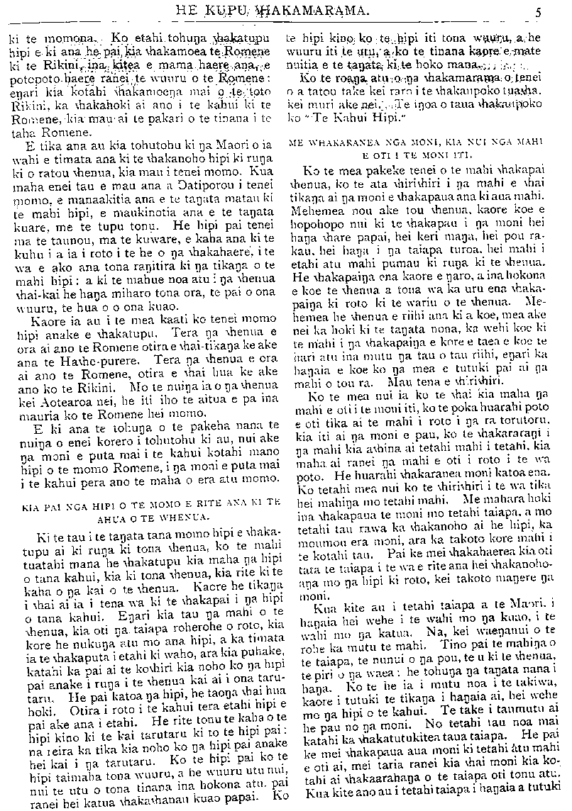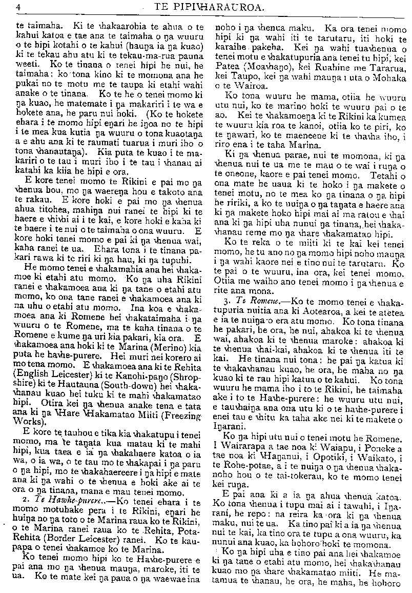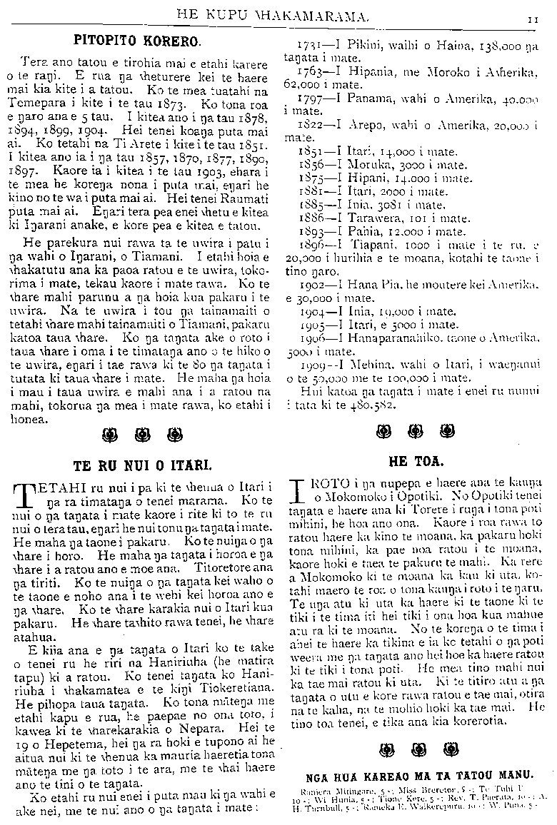 HE KUPU WHAKAMARAMA. PITOPITO KORERO. Tera ano tatou e tirohia mai e etahi karere o te rangi. E rua nga wheturere kei te haere mai kia kite i a tatou. Ko te mea tuatahi na Temepara i kite i te tau 1873 Ko tona roa e ngaro ana e 5 tau. I kitea ano i nga tau 1878, 1894 1899 1904 Hei tenei koanga puta mai ai. Ko tetahi na Ti Arete i kite i te tau 1851. I kitea ano ia i nga tau 1857, 1870, 1877, 1890, 1897. Kaore ia i kitea i te tau 1903, ehara i te mea he korenga nona i puta mai, engari he kino no te wa i puta mai ai. Hei tenei Raumati puta mai ai. Engari tera pea enei whetu e kitea ki Ingarani anake, e kore pea e kitea e tatou. He parekura nui rawa ta te uwira i patu i nga wahi o Ingarani, o Tiamani. I etahi hoia e whakatutu ana ka paoa ratou e te uwira, toko- rima i mate, tekau kaore i mate rawa. Ko te whare mahi parunu a nga hoia kua pakaru i te uwira. Na te uwira i tou nga tainamaiti o tetahi whare mahi tainamaiti o Tiamani, pakaru katoa taua whare. Ko nga tangata ake o roto i taua whare i oma i te timatanga ano o te hiko o te uwira, engari i tae rawa ki te 80 na tanata i tutata ki taua whare i mate. He maha nga hoia i mau i taua uwira e mahi ana i a ratou na mahi, tokorua nga mea i mate rawa, ko etahi i honea. TE RU NUI O ITARI. TETAHI ru nui i pa ki te whenua o I tari i nga ra timatanga o tenei marama. Ko te nui o nga tangata i mate kaore i rite ki to te ru nui o tera tau, engari he nui tonu nga tangata i mate. He maha nga taone i pakaru. Ko te nuinga o nga whare i horo. He maha nga tangata i horoa e nga whare i a ratou ano e moe ana. Titoretore ana nga tiriti. Ko te nuinga o nga tangata kei waho o te taone e noho ana i te wehi kei horoa ano e nga whare. Ko te whare karakia nui o Itari kua pakaru. He whare tawhito rawa tenei, he whare atahua. E kiia ana e nga tangata o Itari ko te take o tenei ru he riri na Haniriuha (he matira tapu) ki a ratou. Ko tenei tangata ko Hani- riuha i whakamatea e te kingi Tiokeretiana. He pihopa taua tangata. Ko tona matenga me etahi kapu e rua, he paepae no ona toto, i kawea ki te whare-karakia o Nepara. Mei te 190 Hepetema, hei nga ra hoki e tupono ai he aitua nui ki te whenua ka mauria haeretia tona matenga me nga toto i te ara, me te whai haere ano te tini o te tangata. Ko etahi ru nui enei i puta mau ki nga wahi e ake nei, me te nui ano o nga tanata i mate: 11 1731—I Pikini, waihi o Haina, 138, 000 na tanata i mate. 1763— I Hipania, me Moroko i Awherika, 62, 000 i mate. 1797—I Panama, wahi o Amerika, 40.000 i mate. 1822—I Arepo, wahi o Amerika, 20, 000 i mate. 1851—I Itari, 14, 000 i mate. 1856—I Moruka, 3000 i mate. 1875—I Hipani, 14.000 i mate. 1881—I Itari, 2000 i mate. 1885—I Inia, 3081 i mate. 1886—I Tarawera, 101 i mate. 1893—I Pahia, 12, 000 i mate. 1896—I Tiapani, 1000 i mate i te ru. e 20, 000 i hurihia e te moana, kotahi te taone i tino ngaro. 1902—I Hana Pia, he moutere kei Amerika e 30, 000 i mate. 1904—I Inia, 10,OOO i mate. 1905—I Itari, e 5000 i mate. 1906—I Hanaparanahiko. taone o Amerika, 5000 i mate. 1909—1 Mehina, wahi o Itari, i waenganui o te 50.000 me te 100, 000 i mate. Hui katoa na tanata i mate i enei ru nunui i tata ki te 480, 582. HE TOA. I ROTO i nga nupepa e haere ana te kauna o Mokomoko i Opotiki. No Opotiki tenei tangata e haere ana ki Torere i runga i tona poti mihini, he hoa ano ona. Kaore i roa rawa to ratou haere ka kino te moana, ka pakaru hoki tona mihini, ka pae noa ratou i te moana, kaore hoki e taea te pakuru te mahi. Ka rere a Mokomoko ki te moana ka kau ki uta, ko- tahi maero te roa o tona kaunga i roto i te ngaru. Te una atu ki uta ka haere ki te taone ki te tiki i te tima iti hei tiki i ona hoa kua mahue atu ra ki te moana. No te korenga o te tima i ahei te haere ka tikina e ia ko tetahi o nga poti weera me na tanata ano hei hoe ka haere ratou ki te tiki i tona poti. He mea tino mahi nui ka tae mai ratou ki uta. Ki te titiro atu a na tangata o utu e kore rawa ratou e tae mai, otira na te kaha, na te mohio hoki ka tae mai. He tino toa tenei, e tika ana kia korerotia. NGA HUA KAREAO MA TA TATOU MANU. Raniera Mitingare 5 Miss Brereton 5 Te Tuhi I 10 Wi Hunia; , 5-; Tione Kere. 5-; Rev. T. Paerata A. H Turnbull. 5 -; Rameka IE Waikerepuru 10 W. Puna 5 -