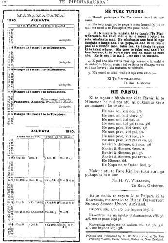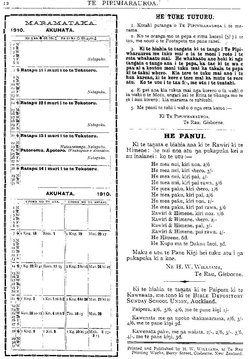 TE PIPIWHARAUROA. HE TURE TUTURU. 1. Kotahi putanga o TE PIPIWHARAUROA i te ma- rama. 2. Ko te oranga mo te pepa e rima hereni (5/-) i te tau, me nooti o te Poutapeta me pane ranei, auaka i te tiaki he pane kingi hepene nga pane e tino hiahiatia ana. 3. Ki te pau nga hereni a tetahi tangata i tuku mai ai ka tukua atu he kaute. Ki te tae atu te kaute kia hohoro te tuku mai i te moni, na te moni hoki i puta atu ai te pepa ehara i te mea tupu noa. 4. E pai ana kia tukua mai nga korero o ia wahi o ia wahi o te Motu, engari kei te Etita te tikanga mo te ta i aua korero : kia marama te tuhituhi. 5. Me penei te tuhi i waho o nga reta katoa: — Ki TE PIPIWHARAUROA, Te Rau, Gisborne. HE PANUI Ki te tangata e hiahia ana ki te Rawiri ki te Himene : he nui noa atu nga pukapuka kei a au inaianei : ko te utu : — He mea nui, kin noa ... 2/6 He mea nui, kiri wher ... 3/- He mea nui, kiri pai ... 4/— He mea nui kiri pai rawa ... 5/6 H e mea paku, kiri whero ... 1/6 H e mea paku, kiri pai . . . 2/6 He mea paku, kiri noa ... 1/- He mea paku, kiri pai rawa 3/6 Rawiri & Himene, kiri noa 1/6 Rawiri & Himene, whero ... 2/- Rawiri & Himene, pai ... 3/- Rawiri & Himene, pai rawa 4/- He Himene ... ... -/6 Maku e utu te Pane Kingi hei tuku atu i nga pukapuka ki a koe. Na H. W. WILLIAMS, Te Rau, Gisborne. Ki te hiahia te tangata ki te Paipera ki te, Kawenata, me tono ki te BIBLE DEPOSITORY SUNDAY SCHOOL UNION, Auckland. Paipera, 2/6, 3/6, 4/6, me te pane kingi //- Kawenata me nga upoko whakamarama 2/6 3/- 4/6, me te pane kingi 3d. Kawenata paku, me nga waiata 2/-, 2/6, 3/-, 3/6, 4/-, me te pane kingi, 3d. Printed and Published by H. W. WILLIAMS, at Te Rau Printing Works, Berry Street, Gisborne, New Zealand.