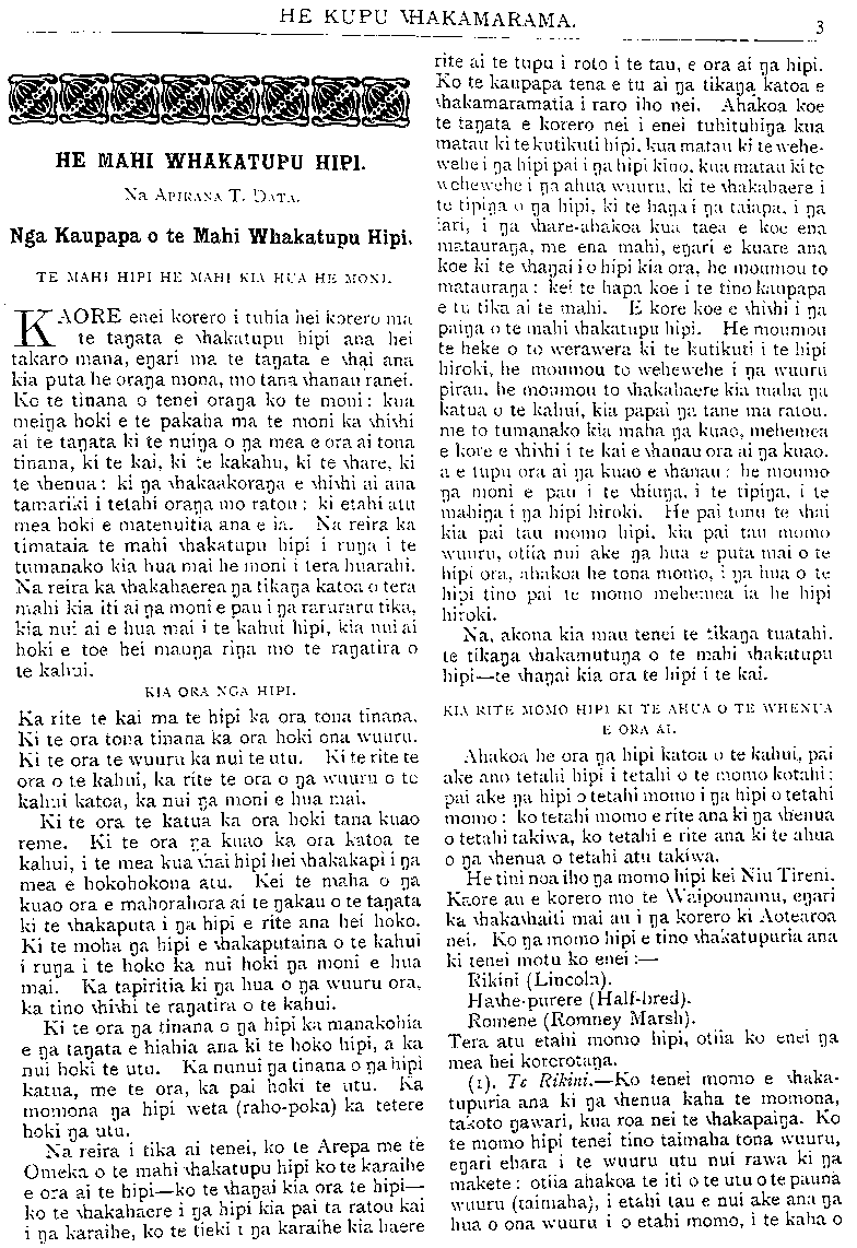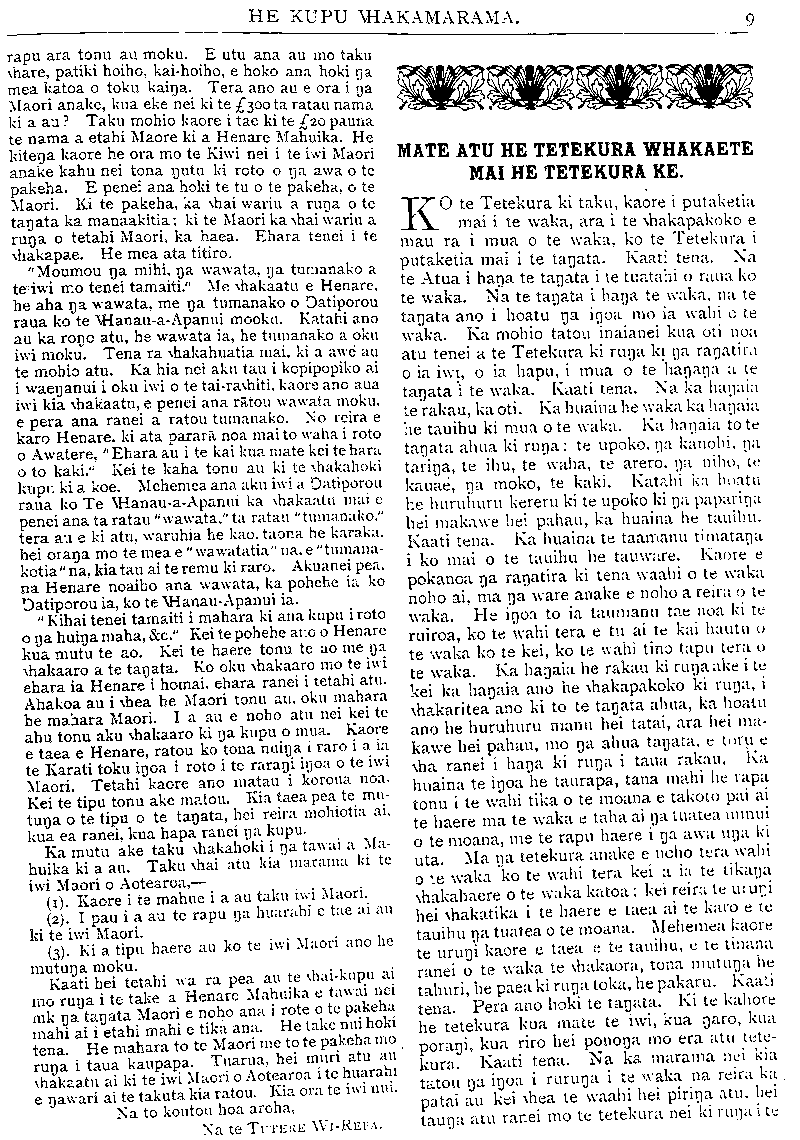 HE KUPU WHAKAMARAMA. rapu ara tonu au moku. E utu ana au mo taku whare, patiki hoiho, kai-hoiho, e hoko ana hoki na mea katoa o toku kainga. Tera ano au e ora i na Maori anake, kua eke nei ki te ^300 ta ratau nama ki a au? Taku mohio kaore i tae ki te ^20 pauna te nama a etahi Maore ki a Henare Mahuika. He kitenga kaore he ora mo te Kiwi nei i te iwi Maori anake kahu nei tona putu ki roto o nga awa o te pakeha. E penei ana hoki te tu o te pakeha, o te Maori. Ki te pakeha, ka "hai wariu a runa o te tanata ka manaakitia; ki te Maori ka whai wariu a runa o tetahi Maori, ka haea. Ehara tenei i te whakapae. He mea ata titiro. "Moumou na mihi. na wawata, ua tumanako a te iwi mo tenei tamaiti." Me whakaatu e Henare. he aha na wawata, me na tumanako o Ngatiporou raua ko te Whanau-a-Apanui mooku. Katahi ano au ka rongo atu, he wawata ia, he tumanako a oku iwi moku. Tena ra whakahuatia mai. ki a awe au te mohio atu. Ka hia nei aku tau i kopikopiko ai i waenganui i oku iwi o te tairawhiti. kaore ano aua iwi kia whakaatu, e penei ana ra, tou wawata moku. e pera ana ranei a ratou tumanako. No reira e karo Henare. ki ata parara noa mai to waha i roto o Awatere, " Ehara au i te kai kua mate kei te hara o to kaki." Kei te kaha tonu au ki te whakahoki kupu ki a koe. Mehemea ana aku iwi a Ngatiporou raua ko Te Whauau-a-Apanui ka whakatu; mai e penei ana ta ratau "wawata," ta ratau "tumanako." tera au e ki atu. waruhia he kao, taona he karaka. hei oranga mo te mea e " wawatatia" na. e "tumana- kotia " na, kia tau ai te remu ki raro. Akuanei pea, na Henare noaiho ana wawata, ka pohehe ia ko Ngatiporou ia, ko te Whanau-Apanui ia. " Kihai tenei tamaiti i mahara ki aua kupu i roto o na huinga maha, &c." Kei te pohehe ano o Henare kua mutu te ao. Kei te haere tonu te ao me na whakaaro a te tanata. Ko oku whakaaro mo te iwi ehara ia Henare i homai, ehara ranei i tetahi atu. Ahakoa au i whea he Maori tonu au, oku mahara he mahara Maori. I a au e noho atu nei kei te ahu tonu aku whakaaro ki na kupu o mua. Kaore e taea e Henare, ratou ko tona nuinga i raro i a ia te Karati toku ingoa i roto i te rarangi ingoa o te iwi Maori. Tetahi kaore ano matau i koroua noa. Kei te tipu tonu ake matou. Kia taea pea te mutu nga o te tipu o te tanata, hei reira mohiotia ai, kua ea ranei, kua hapa ranei nga kupu. Ka mutu ake taku whakahoki i na tawai a Ma- huika ki a au. Taku whai atu kia marama ki te iwi Maori o Aotearoa,— (1). Kaore i te mahue i a au taku iwi Maori. (2). I pau i a au te rapu na huarahi e tae ai au ki te iwi Maori. (3). Ki a tipu haere au ko te iwi Maori ano he mutunga moku. Kaati hei tetahi wa ra pea au te whaikupu ai mo runa i te take a Henare Mahuika e tawai nei mo na tanata Maori e noho ana i rote o te pakeha mahi ai i etahi mahi e tika ana. He take nui hoki tena. He mahara to te Maori me to te pakeha mo runa i taua kaupapa. Tuarua, hei muri atu au whakaatu ai ki te iwi Maori o Aotearoa ite huarahi e ngawari ai te takuta kia ratou. Kia ora te iwi nui. Na to koutou hoa aroha, Na te TUTERE Wi-REPA. MATE ATU HE TETEKURA WHAKAETE MAI HE TETEKURA KE. KO te Tetekura ki taku, kaore i putaketia mai i te waka, ara i te whakapakoko e mau ra i mua o te waka, ko te Tetekura i putaketia mai i te tangata. Kaati tena, Na te Atua i hanga te tangata i te tuatahi o raua ko te waka. Na te tangata i hanga te waka, na te tangata ano i hoatu nga ingoa mo ia wahi o te waka. Ka mohio tatou inaianei kua oti noa atu tenei a te Tetekura ki runga ki na rangatira o ia iwi, o ia hapu, i mua o te hanganga a te tangata i te waka. Kaati tena. Na ka hangaia te rakau, ka oti. Ka huaina he waka ka hangaia he tauihu ki mua o te waka. Ka hangaia to te tangata ahua ki runga: te upoko, ua kanohi. nga taringa, te ihu, te waha, te arero. nga a niho, te kauae, nga moko, te kaki. Katahi ka i hoatu he huruhuru kereru ki te upoko ki na paparinga hei makawe hei pahau, ka huaina he tauihu. Kaati tena. Ka huaina te taamanu timatanga i ko mai o te tauihu he tauware. Kaore e pokanoa nga rangatira ki tena waahi o te waka noho ai, ma nga ware anake e noho a reira o te waka. He ingoa to ia taumanu tae noa ki te ruiroa, ko te wahi tera e tu ai te kai hautu o te waka ko te kei, ko te wahi tino tapu tera u te waka. Ka hangaia he rakau ki runga ake i te kei ka hangaia ano he whakapakoko ki runga, i whakaritea ano ki to te tangata ahua, ka hoatu ano he huruhuru manu hei tatai, ara hei ma- kawe hei pahau, mo nga ahua tangata, e toru e wha ranei i hana ki runga i taua rakau. Ka huaina te ingoa he taurapa, tana mahi he rapa tonu i te wahi tika o te moana e takoto pai ai te haere ma te waka e taha ai nga tuatea nunui o te moana, me te rapu haere i na awa anga ki uta. Ma nga tetekura anake e noho tera wahi o te waka ko te wahi tera kei a ia te tikanga whakahaere o te waka katoa; kei reira te urungi hei whakatika i te haere e taea ai te karo e te tauihu nga tuatea o te moana. Mehemea kaore te urungi kaore e taea e te tauihu, e te tinana ranei o te waka te whakaora, tona mutunga he tahuri, he paea ki runa toka, he pakaru. Kaati tena. Pera ano hoki te tangata. Ki te kahore he tetekura kua mate te iwi, kua ngaro, kua porangi, kua riro hei pononga mo era atu tete- kura. Kaati tena. Na ka marama nei kia tatou nga ingoa i rurunga a i te waka na reira ka patai au kei whea te waahi hei piringa atu, hei taana atu ranei mo te tetekura nei ki runga i te