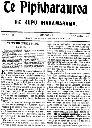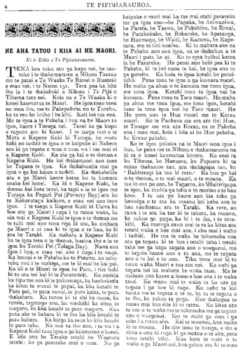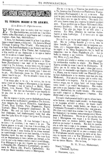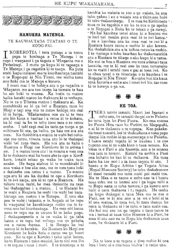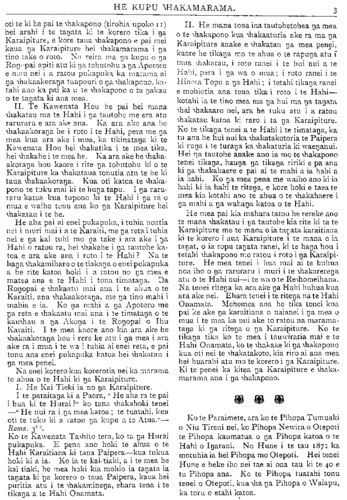 HE KUPU WHAKAMARAMA. HAMUERA MATENGA. TE KAUWHAUTANGA TUATAHI O TE RONGO-PAI. I KOREROTIA i tera putanga a ta tatou pepa te houhanga a Te Matenga i te rongo i waenganui i nga tangata o WHangaroa me o Pewhairangi. I mutu nga kupu ki te tapaenga a Te Matenga i nga rangatira ki te taonga. Ka puta etahi kupu inaianei mo te kauwhautanga tuatahi o te Rongo-pai ki Niu Tireni, me waiho tonu ano hoki ma te Matenga e korero. I muri mai i te hokinga atu o nga rangatira o Whangaroa me ara tou taonga ka tamate te hau ka aio hoki te moana. Ka hutia to matou haika katahi matou ka whakauru ki te wahapu. No te 22 o Tihema matou i whakauru ai. Ka matakitaki au ki nga iwi o Ruatara raua ko Hongi e tangi ana mo to ratou kokinga ora mai ki te kainga. Whakamatau noa au ki te mea atu kia kaua e haehae i a ratou ki te kohatu, ka ki mai ia ko te tohu tonu tera o to ratou aroha. I tahi rangi mai ka taria nga taonga a nga mihinare ki uta, nga hoiho, nga kau me era atu mea. Ka whiriwhiria e matou te wahi hei noho- anga mo ratou, timata tonu atu ki te whakapai wahi hei tunga whare. He nui atu te kaha o Ruatara o Hongi me Korokoro ki te awhina i au. Ia matou tonu atu i te moana e mea ana ki te whakauru mai ka haere ake te ope a Koro- koro, kotahi tekau nga waka he waka taua anake. He hanga atahua ki te matakitaki ki aua waka e hoe ake ana, me te mea tonu hoki e whakaeke ana ratou i a matou. To matou unga atu ki uta ka whawhai te ope a Korokoro ki te iwi kainga, ara ki te ope a Ruatara. He takaro taua mahi, he mea whakarite na raua hei whakangahau i a matou. I te Hatarei ko te mahi a Ruatara he mahi i te wahi hei kara- kiatanga mo matou i te Ratapu. E toru eka pea te wahi i taipatia e ia, hangaia ai he tepu ki waenganui he karakiatanga moku me te to- rona ano hei kauwhautanga. He mea uhi katoa nana te tepu me te torona ki te kaka pango. I whakapaepaetia e ia he waka ki nga taha katoa o te tepu hei nohoia mo nga pakeha me a ratou whanau. I te Ratapu ka hui matou ki te karakia. Ko Ruatara ko Honi me Korokoro he kaka hoia o ratou me nga hoari ano. Ko te ope a Koroko i taku taha katau, ko ta Ruatara i taku mauiui, ko te tini noa iho o te tangata i mua i muri. I te timatanga o te karakia ka waiatia te 100 o nga waiata, ka ana taku ngakau i au e waiata ana e titiro ana hoki ki taku whakaminenga. I te mea he Kirihimete taua ra ka tangohia e au ko te rua o nga upoko o te Rongopai a Ruka ko te tekau o nga rarangi, " He kai kauwhau tenei ahau ki a koutou mo te hari nui meake puta mai ki te iwi katoa." I au e kauwhau ana ka mea mai te iwi ki a Ruatara kaore ratou e mohio ki aku korero. Ka whakahokia atu e ia taihoa ratou ka mohio. I te mutunga o taku kauwhau ka whakamaoritia atu e Ruatara te tikanga o aku kupu ki a ratou. He nui te koa o Ruatara mo tona awhina i taua karakia, me te ki mai ano ko tana tumanako ko te mahi i tetahi mea e pai ai tona iwi. Ko te ahua tenei o te timatanga o te kauwhau i te Rongopai ki Niu Tireni Ko taku inoi kia kaua tona kororia e wehe atu i tenei iwi kia tae rano ki te korenga o nga wa. HE TOA. TERA tetahi tamaiti Maori kei Ingarani e I noho ana, he tamaiti whangai na te Pakeha ko tona ingoa ko Pani Paora. Ko ona matua ko Paora Hira raua ko Powhiri no Mangapuhi, e ai ki te whakaatu a te nupepa. Kua pakeke- tia tenei tamaiti, kei te whakaakona e tona papa whangai kia mohio ki nga matauranga o te Pakeha. I haere tetahi tangata ki te kaukau i te one tupono ana ki te wahi kino o taua moana. Ka kitea ia e Pani e aia haeretia ana e te moana kua tata te toremi. Katahi ka unihia e Pani ona kakahu ka kau ki te whakaora. Na tona kaha ka tae mai i a ia taua tangata ki uta. I hoatu e te Ropu Awhina i nga Tangata Aitua (Royal Humane Society) he tohu whakahonore ki tenei tamaiti mo tana mahi pai mahi toa. Na te Mea o te taone e noho ana ia i hoatu taua tohu me te homai ano i nga kupu mihi a te Ropu nana te tohu honore, i nga korero ano hoki o tana whakaora i te tangata. He maha nga kupu whakapai a taua Mea mo te toa o Pani, me te ki atu ano a te wa e hoki ai ia ki ona matua, ki tona iwi, ki tona whenua ko reira ia whakaatu ai i te tohu o tana mahi toa. He hui nui atu na nga tangata o taua taone te wa i homai ai taua tohu Honore ki a Pani, he mea ki atu ano na te Ropu kia whakanuia taua mea, he whakaaro ki a Pani. Na te kore o te tangata e tino mohio ki ona kau i kore ai e rite tona hiahia i o ratou utu.
