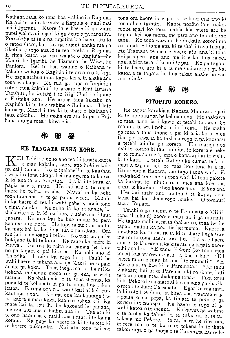10 TE PIPIWHARAUROA. Raihana raua ko toua hoa wahine i a Rangiuia Ka nui te pai o te mahi a Rangiuia e mahi mai nei i Ingarani. Kaore ia e haere ki nga whare purei waiata ai, engari ki nga whare o nga rangatira. Poroakitia ai ia e na rangatira kia haere atu ki o ratou whare, kati ko nga nunui anake me nga tiketike e rongo ana ki te reo roreka o Rangiuia. E rima katoa na reo waiata o Rangiuia—he Maori, he Ingarihi, he Tiamana, he Wiwi, he Paniora. Kei te hoa wahine o Raihana te kakahu waiata o Rangiuia i te aroaro o te kingi. He hanga atahua taua kapa, kei a ia anake ano tona waihanga. Ka rua nga tuna o Rangiuia i roto i taua kakahu i te aroaro o Kini Eruera Tuawhitu, ka kotahi i to Kini Hori i a ia ano e Piriniha ana. He aroha taua kakahu na Rangiuia ki te hoa wahine o Raihana. I kite katoa nga Maori i tae ki te whare o Raihana i taua kakahu. He maha era atu kupu a Rai- hana mo nga mea i kitea e ia. HE TANGATA KAKA KORE. KEI Tahiti e noho ano tetahi tangata kaore e mau kakahu, kaore ano hoki e kai i nga kai i tunua. Ko ia inaianei kei te kauwhau i te pai o tona tikanga hei mahina ma te katoa. E ki ana ia no Amerika. I a ia i te kura ka pangia ia e te mate. He kai atu i te rongoa kaore he paina he aha. Nawai ra ka heke tona taumaha ki te 90 pauna weeti. Katahi ia ka haere ki tetahi wahi ngahere, nona tonu e rima na eka. Ka noho ia ko ia anake, ka whakarite i a ia ki nga kiore e noho ana i taua ngahere. Ko ana kai he hua rakau he pera ano me a te kiore. He tope rakau tona mahi, ka matekai ka kai i nga hua o nga rakau. Ora atu ia i te nohoanga i reira. No tona oranga ka hoki ano ia ki te kura. Ka mutu ka haere ki Hawai. Ka roa ki reira ka panaia he kore no nga tangata e pai ki a ia. Ka hoki ano ki Amerika. I reira ka rongo ia ki Tahiti he wahi haere e tahanga ana nga Maori he rapaki anake nga kaka. Tona taenga mai ki Tahiti ka hokona he whenua mona 100 nga eka, he wahi maunga. Ka. whakapaia e ia tona whenua, ka poua ki te kokonati ki nga tu ahua hua rakau katoa. E rima ona rua wai i kari ai hei kau- kautanga mona. E rima ona kaukautanga i te ra, kaore e mau kaka, kaore e kohua kai. Ka mate kai ka rou iho he kokonati he panana, me era atu hua e hiahia ana ia. Tae atu ki te ono haora ia e mahi ana i muri i te kainga kotahi. Ka ngenge ka haere ia ki te takoto ki te korero pukapuka. Nui atu tona pai me tona ora kaore ia e pai ki te hoki mai ano ki tona ahua tawhito. Kaore noaiho ia e moke- moke engari ko tona hiahia kia haere atu he tangata hei hoa mona, me pera ano te noho me tana. Ko tona wawata he whakatu koroni mo nga tangata e hiahia ana ki te whai i tona tikanga. He Tiamana te mea e haere atu ana ki tona kainga e pera ana ano me ia e kai hua rakau ana, a ki ta tera ki ka nui te pai. Ko nga tangata ki te haere atu ki a ia me whakarere i nga kai katoa a te tangata he hua rakau anake he wai motu hoki. PITOPITO KORERO. He tangata karakia a Rapata Manawa, engari ko te kauwhau roa he kehua nona. He whakawa te mea nana ia i kawe ki tetahi taone, a he roa ano te wa i noho ai ia i reira. He maha nga mea o taua taone i pai ki a ia ko te mea tino pai rawa ia ko te whakarongo ki nga kauwhau a tetahi minita pu korero. He maringi noa mai te korero ki taua minita, te korero e heke ai te roimata me te mea e haparangi ai te waha ki te kata. I tetahi Ratapu ka kumea te kau- whau a tangata nei, he mea hou tera ki a ia. Ku oreore a Rapata, kua tango i tona wati. E whakahoki tonu ana i tona wati ki tona pakete ka karanga te minita ra e mea ana koe kua mutu te kauwhau, e hoa kaore ano. E kiia ana " Hei kai mahi ano koutou i te kupu, kaua kaua hei kai whakarongo anake." Ohomauri ana a Rapata. Tetahi o nga mema o te Paremata o Whini- rana (Finland) kaore e mau hu i nga raumati. He tangata mahi ia, na te whakaaro o tona iwi he tangata matou ka pootitia hei mema. Kaore ia i mahara ka tukua ra ia ki te whare hanga ture me mutu tona haere kore hu. I a ia e haere ana ki te Paremata ka kite atu nga tangata kaore tahi ona hu. " E tama Pekoro (ko tona ingoa tenei) kua wareware atu i a koe o hu." " E! kaore ra au e mau hu ana i te raumati." " E haere ana ra koe ki te Paremata." " Ki taku whakaaro hui ai te Paremata ki ro whare, kati tera ano ona mea whakamahana." Tika tonu ki ta Pekoro i whakaaro ai he mahana na whariki o roto i te whare Paremata. Engari te roa rawa ia ki roto i te whare ka kitea ona waewae e na ripoata o nga pepa, ka timata te puta o na korero i ro nupepa. Ka haere te rongo ki nga wahi katoa o te whenua. Ka kawea na wahine e te aroha ka tahuri ki te tuku hu ki te tui tokena mo Pekoro. Ia ra, ia ra he rite tonu te rere mai o te hu o te tokena ki te whare takotoranga o nga taonga o te Paremata kaore he