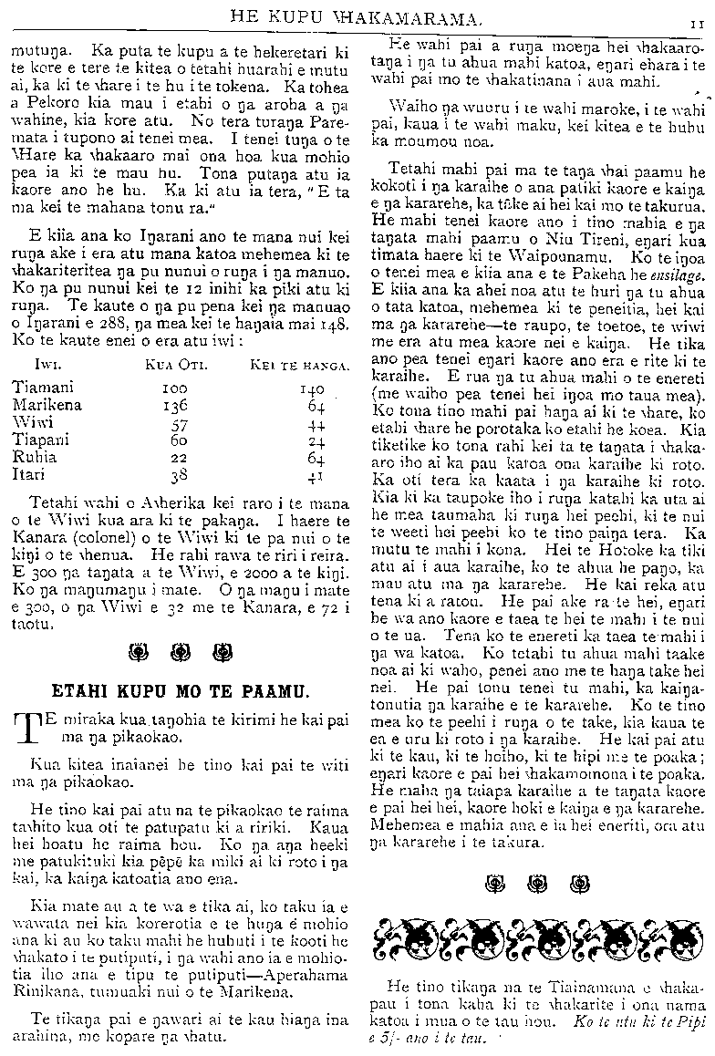 HE KUPU WHAKAMARAMA. mutunga. Ka puta te kupu a te hekeretari ki te kore e tere te kitea o tetahi huarahi e mutu ai, ka ki te whare i te hu i te tokena. Ka tohea a Pekoro kia mau i etahi o nga aroha a nga wahine, kia kore atu. No tera turanga Pare- mata i tupono ai tenei mea. I tenei tunga o te Whare ka whakaaro mai ona hoa kua mohio pea ia ki te mau hu. Tona putanga atu ia kaore ano he hu. Ka ki atu ia tera, " E ta ma kei te mahana tonu ra." E kiia ana ko Ingarani ano te mana nui kei runga ake i era atu mana katoa mehemea ki te whakariteritea nga pu nunui o runga i nga manuo. Ko nga pu nunui kei te 12 inihi ka piki atu ki runga. Te kaute o nga pu pena kei nga manuao o Ingarani e 288, nga mea kei te hangaia mai 148. Ko te kaute enei o era atu iwi: Iwi. KUA OTI. KEI TE HANGA. Tiamani 100 140 Marikena 136 64 Wiwi 57 44 Tiapani 60 24 Ruhia 22 64 Itari 38 41 Tetahi wahi o Awherika kei raro i te mana o te Wiwi kua ara ki te pakanga. I haere te Kanara (colonel) o te Wiwi ki te pa nui o te kingi o te whenua. He rahi rawa te riri i reira. E 300 na tangata a te Wiwi, e 2000 a te kingi. Ko nga mangumangu i mate. O nga mangu i mate e 300, o nga Wiwi e 32 me te Kanara, e 72 i taotu. ETAHI KUPU MO TE PAAMU. TE miraka kua tangohia te kirimi he kai pai 1 ma nga pikaokao. Kua kitea inaianei he tino kai pai te witi ma nga pikaokao. He tino kai pai atu na te pikaokao te raima tawhito kua oti te patupatu ki a ririki. Kaua hei hoatu he raima hou. Ko nga anga heeki me patukituki kia pepe ka miki ai ki roto i nga kai, ka kainga katoatia ano ena. Kia mate au a te wa e tika ai, ko taku ia e wawata nei kia korerotia e te hunga e mohio ana ki au ko taku mahi he huhuti i te kooti he whakato i te putiputi, i nga wahi ano ia e mohio- tia iho ana e tipu te putiputi—Aperahama Rinikana. tumuaki nui o te Marikena. Te tikanga pai e ngawari ai te kau hianga ina arahina, me kopare na whatu. He wahi pai a runga moenga hei whakaaro- tanga i nga tu ahua mahi katoa, engari ehara i te wahi pai mo te whakatinana i aua mahi. Waiho nga wuuru i te wahi maroke, i te wahi pai, kaua i te wahi maku, kei kitea e te huhu ka moumou noa. Tetahi mahi pai ma te tanga whai paamu he kokoti i nga karaihe o ana patiki kaore e kainga e nga kararehe, ka take ai hei kai mo te takurua. He mahi tenei kaore ano i tino mahia e nga tangata mahi paamu o Niu Tireni, engari kua timata haere ki te Waipounamu. Ko te ingoa o tenei mea e kiia ana e te Pakeha he ensilage. E kiia ana ka ahei noa atu te huri nga tu ahua o tata katoa, mehemea ki te peneitia, hei kai ma nga kararehe—te raupo, te toetoe, te wiwi me era atu mea kaore nei e kainga. He tika ano pea tenei engari kaore ano era e rite ki te karaihe. E rua nga tu ahua mahi o te enereti (me waiho pea tenei hei ingoa mo taua mea). Ko tona tino mahi pai hanga ai ki te whare, ko etahi whare he porotaka ko etahi he koea. Kia tiketike ko tona rahi kei ta te tangata i whaka- aro iho ai ka pau katoa ona karaihe ki roto. Ka oti tera ka kaata i na karaihe ki roto. Kia ki ka taupoke iho i runga katahi ka uta ai he mea taumaha ki runa hei peehi, ki te nui te weeti hei peehi ko te tino painga tera. Ka mutu te mahi i kona. Hei te Hotoke ka tiki atu ai i aua karaihe, ko te ahua he pango, ka mau atu ma nga kararehe. He kai reka atu tena ki a ratou. He pai ake ra te hei, engari he wa ano kaore e taea te hei te mahi i te nui o te ua. Tena ko te enereti ka taea te mahi i nga wa katoa. Ko tetahi tu ahua mahi taake noa ai ki waho, penei ano me te hanga take hei nei. He pai tonu tenei tu mahi, ka kainga- tonutia nga karaihe e te kararehe. Ko te tino mea ko te peehi i runga o te take, kia kaua te ea e uru ki roto i nga karaihe. He kai pai atu ki te kau, ki te hoiho, ki te hipi me te poaka; engari kaore e pai hei whakamomona i te poaka. He maha nga taiapa karaihe a te tangata kaore e pai hei hei, kaore hoki e kainga e nga kararehe. Mehemea e mahia ana e ia hei eneriti, ora atu nga kararehe i te takura. Me tino tikanga na te Tiainamana e whaka- pau i tona kaha ki te whakarite i ona nama katoa i mua o te tau hou. Ko te utu ki te Pipi e 51- ano i te tau.