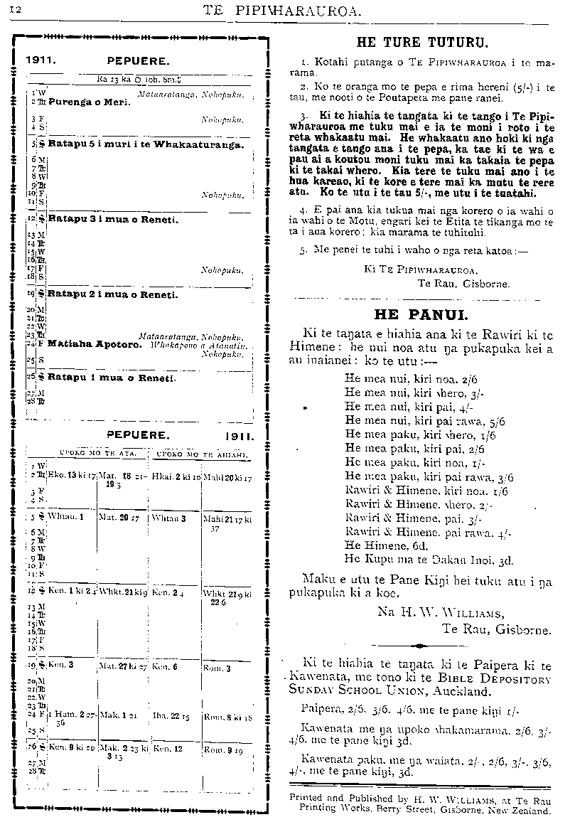 TE PIPIWHARAUROA. HE TURE TUTURU. 1. Kotahi putanga o TE PIPIWHARAUROA i te ma- rama. 2. Ko te oranga mo te pepa e rima hereni (5/-) i te tau, me nooti o te Poutapeta me pane ranei, auaka i te tiaki he pane kingi hepene nga pane e tino hiahiatia ana. 3. Ki te pau nga hereni a tetahi tangata i tuku mai ai ka tukua atu he kaute. Ki te tae atu te kaute kia hohoro te tuku mai i te moni, na te moni hoki i puta atu ai te pepa ehara i te mea tupu noa. 4. E pai ana kia tukua mai nga korero o ia wahi o ia wahi o te Motu, engari kei te Etita te tikanga mo te ta i aua korero : kia marama te tuhituhi. 5. Me penei te tuhi i waho o nga reta katoa: — Ki TE PIPIWHARAUROA, Te Rau, Gisborne. HE PANUI Ki te tangata e hiahia ana ki te Rawiri ki te Himene : he nui noa atu nga pukapuka kei a au inaianei : ko te utu : — He mea nui, kin noa ... 2/6 He mea nui, kiri wher ... 3/- He mea nui, kiri pai ... 4/— He mea nui kiri pai rawa ... 5/6 H e mea paku, kiri whero ... 1/6 H e mea paku, kiri pai . . . 2/6 He mea paku, kiri noa ... 1/- He mea paku, kiri pai rawa 3/6 Rawiri & Himene, kiri noa 1/6 Rawiri & Himene, whero ... 2/- Rawiri & Himene, pai ... 3/- Rawiri & Himene, pai rawa 4/- He Himene ... ... -/6 Maku e utu te Pane Kingi hei tuku atu i nga pukapuka ki a koe. Na H. W. WILLIAMS, Te Rau, Gisborne. Ki te hiahia te tangata ki te Paipera ki te, Kawenata, me tono ki te BIBLE DEPOSITORY SUNDAY SCHOOL UNION, Auckland. Paipera, 2/6, 3/6, 4/6, me te pane kingi //- Kawenata me nga upoko whakamarama 2/6 3/- 4/6, me te pane kingi 3d. Kawenata paku, me nga waiata 2/-, 2/6, 3/-, 3/6, 4/-, me te pane kingi, 3d. Printed and Published by H. W. WILLIAMS, at Te Rau Printing Works, Berry Street, Gisborne, New Zealand.