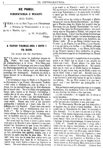 TE PIPIWHARAUROA HE PANUI. PIHOPATANGA O WAIAPU. HUI TOPU. TERA e tu te Hui Topu o te Pihopatanga o Waiapu ki Waiomatatini a te 19 o nga ra o Maehe, 1911 A. W. WAIAPU, Pihopa. A TATOU TAONGA-OHA I ROTO I TE HAHI. TE HAHI ME TE PAIPERA. KUA kitea e tatou he huihuinga tangata te Hahi. Kei taua Hahi e pupuri ana nga whakaaturanga a te Atua. Kua kitea ano hoki e tatou i te timatanga mai ano o taua Hahi ka whakarapopototia nga tino mea o taua whaka- aturanga o te Atua meinga ana aua whakarapo- pototanga hei whakapono. Inaianei ka ahua a tatou korero ki te ahuatanga o te Hahi ki te Paipera. I te timatanga i mau te Hahi a te Karaiti ki te Kawenata a nga Hurai—Kawenata Tawhito —kei reira e whakaaturia ana te ahua o te Atua, me nga poropititanga mo te Kai-whakaora kei te haere mai. Ko a te Hahi ake pukapuka kaore tahi, kaore a te Karaiti tuhituhinga i waiho iho ai ki ana akonga. Ko ta te Karaiti mahi he ako a waha i nga kai-whakahaere o taua Hahi, no to ratou mohiotanga, ka mutu tana mahi. Kaore ano hoki a nga Apotoro pukapuka i tuhituhi ai i muri tata iho i te kakenga atu o te Karaiti. Engari tera ano etahi i tuhi i muri mai, e whakaaturia mai ra e Ruka 1 12. Ko te tikanga a nga Apotoro me a ratou akonga he kauwhau anake i te whakapono, me te tautoko ano ki a ratou mahi. Kaore ratou i aro i te tuatahi ki te tuhituhi. No muri mai ka kitea e kore e puta wawe mai ano a te Karaiti i ana Apotoro e ora ana, katahi ka whakaaroa he pai rawa kia tuhia e ratou e te hunga mohio nga mea i mahia e te Karaiti i a ia i te ao nei. Tetahi take i tika ai kia tuhituhia kei apititia noatia atu e te korero ka ngaro noa iho te mea tika. Ko te- tahi take ano na te mea kua maha rawa nga tangata whenua kua huri ki te whakapono, a kaore aua wahi katoa e taea e nga Apotoro te haere. Na enei take e toru ka tuhia nga korero o nga mahi a te Karaiti i mahi ai i te ao nei. Na nga raruraru tohetohe me etahi atu tu raru- raru a nga Karaitiana a i te mea hoki he tawhiti o ratou pa ka timata nga Apotoro ki te tuhi- tuhi reta. Na enei ahua ka tuhia te Rongopai a Matiu hei pupuri ma nga Hurai Karaitiana; nga Rongo- pai a Maaka raua ko Kuka hei pupuri ma nga Romana me nga Kariki Karaitiana—ko enei e rua na Pita raua ko Paora nga korero; no muri rawa mai te Rongopai a Hoani, hei pupuri ma nga Hahi katoa. I muri mai ka tuhia te timatanga o te tipu o te Hahi i runga i te kauwhautanga a nga Apotoro—ko nga mahi tenei a nga Apotoro, na Ruka i tuhi. E 21 nga Reta i tuhia i taua wa. O enei 13 na Paora, e 2 na Pita, e 3 na Hoani, e 2 na nga teina o te Arika—1 na Hemi, pihopa tuatahi o Hiruharama; 1 na Hura, ko te mea ki nga Hiperu kaore e tino mohiotia, te puka- puka whakamutunga ko te whakakitenga na Hoani i tuhi. Ko te take tuatahi i manakohia ai enei puka- puka e te Hahi kei te ahua o nga tangata na ratou nei i tuhi. Engari ehara i te mea koia nei anake te take i manakohia ai. Ko tetahi take na te mea na te Hahi katoa te whakaae- tanga ki te pai o aua reta, na te Hahi o taua wa na te Hahi hoki o muri nei. Kotahi tonu te whakaaro o nga Karaitiana o muri mai ki te tika o nga korero o enei reta katoa ki nga he o ratou na takiwa. Na nga Hui nunui o te 300 tau i muri mai i ata whiriwhiri nga pukapuka o te Kenana. Kia pewheatia enei pukapuka tapu e te tangata karaitiana, kia pewheatia hoki e te Hahi? Ki te ata tirohia ka kitea e tino pai ana, (1) hei tohutohu i te tangata mo te ahua o tana karakia; (2) hei mana whakatau ma te Hahi i nga tau- tohe me era atu raruraru e ara ake ana. I. Te Kawenata Hou he pai hei tohutohu i te tangata mo te ahua o tana karakia. Ko te mahi ma te Karaitiana he whai i te tauwira o Ihu Karaiti. I a ia ano i te ao nei e ai ki ta Paora, " Kia whaia e ia nga mea o runga, o te wahi e noho mai nei a te Karaiti."—Kovo. 3 1 Ko tana haere " Kia rite ki ta te Atua nana nei ia i karanga ki tona rangatiratanga, ki tona kororia.'" i Teka. 2 1 2 Kaore he tauwira i runga ake i tenei mo te tangata karaitiana, a heoi ano e taea ai ma te ako tonu i te ahua o ana mahi e korerotia nei i roto i nga Rongopai, ma te whaka rongo hoki ki na tohutohu a nga Apotoro e mau nei i roto i nga reta. Mehemea ko nga whaka- pono anake—a nga Apotoro, o Naihia, o Ata- natiu ranei—hei puritanga ma te tangata karai- tiana kaore te Kawenata Hou kua kore e taea te whai te tauwira o Ihu Karaiti. Ahakoa kua