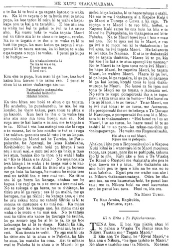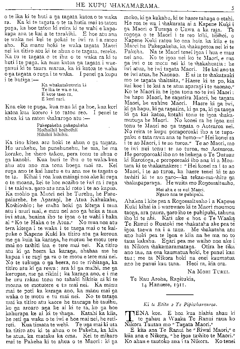 HE KUPU WHAKAMARAMA. o te ika ki te huti a nga tangata katoa o te waka ra. Ka ki te tangata o te ta hutia mai to tatou punga, ka hoe tatou ki reira ki te wahi e kapa- kapa aua te kai a te tarakihi. E hoe atu ana te waka nei kei te pokai te iwi ra i a ratou aho. Ka manu hoki te waka tangata Maori nei ka titiro atu ki te ahua o te tangata, rereke. Ka tu te tangata o te ihu o te waka ra ki te huti ite punga, ka mau katoa nga tangata i wae- nganui ki te taura matua, ka ki katoa te waha o nga tangata o runga i te waka. I penei nga kupu i te hutinga:— Ka whakatakotoria ki Te ika te wa o tu, E kote taeo tu, E kori rari. Kua eke te punga, kua mau ki nga hoe, kua kori katoa kua korero i to ratou reo. I penei te ahua ki ta ratou whakarongo atu:— Pakepakeha pakepakeha Hoihoihii hoihoihii Hihihii hihihii. Ka tino kitea atu hoki te ahua o nga tangata. He urukehu, he punehunehu, he ma, he ma korako, he whero takou, pera tonu te ahua o nga kanohi. Kua huri te ihu o te waka kua ahu atu ano ma tona hoenga mai ra. Kei runga ano te kai hautu e tu ana me te tangata o te ta. Kihai i roa kua maiangi noa ake ki runga o te moana, kei te hoe noaiho te iwi ra i runga i te takiwa ngaro atu ana ki roto i te ao kapua. Ka mohio nga Maori nei he Turehu, he Patu- paiarehe, he Aparangi, he Atua Kahukahu, Kowhiowhio; he maha hoki nga kitenga i mua atu i muri mai, e mau nei ano nga haka a taua iwi atua, huaina iho te ingoa o te wahi i haka ai " Ko te Haka o te Atua." No mua noa atu tera kitenga i te waka i te taenga mai o te kai- puke o Kapene Kuki ka titiro atu nga koroua me nga kuia ka karanga, he motuu he motu tere mai no tawhiti ina e tere mai nei. Ka titiro atu ki nga heera ka karanga, ahahaa me he kapua i te rangi nga ra o te motu e tere mai nei. No te tukunga o nga heera, no te riwhitanga, ka titiro atu ki nga rewa; ara ki nga maihi, me nga kurupae, me nga rikini; ka karanga ano, e i me he uru rakau tonu no tahaki hikitia ai ki te moana te motutere e tu mai nei. Ka manu mai te poti ka karanga ano, ka manu mai nga waka o te motu e tu mai nei. No te tatanga mai ka titiro atu kaore he taurapa he tauihu, ko nga aroaro anga ke ai ki te ta, ko nga hoe kahurapa ke ai ki te whanga. Katahi ka kiia, he reti nga waka o te iwi e hoe mai nei, he reti- reti. Kua timata te wehi. Te unga mai ki uta ka titiro atu ki te ahua o te Pakeha, ka kiia he atua, ka mataku ka oma. Kei te miharo mai te Pakeha ki te ahua o te Maori: ki nga moko, ki nga kakahu, ki te haere tahanga o etahi. He roa te wa i whakarata ai a Kapene Kuki i nga Maori o Turanga o Uawa a ka rata. Te rongonga o te Maori i te reo kihi, hoihoi, o Kapene Kuki ratou ko ona hoia ka kiia e te Maori he Pakepakeha, ka whakapotoa nei ki te Pakeha. Na te Maori tenei ingoa i hua e mau nei ano. Ko te ingoa nei ko te Maori, e rua pa iwi o te motu nei ki te whakahuatia: he iwi atua, he iwi tangata Maori. He kai ano ta te iwi atua, he Naonao. E ai ta te whakatauki mo te tangata whaitaita, " Haere ki te po, kia kai koe i te kai a te atua aparangi i te naonao." Ko te Maori ia he ingoa tonu no te iwi Maori: he hapu Maori, he rangatira Maori, he tangata Maori, he wahine Maori. Haere ki nga iwi, ki nga hapu, ki nga rangatira, ki nga pa, ki nga taonga ki nga kai katoa, kotahi tonu te ingoa whaka- mutunga he Maori. No konei ra he ingoa nui tonu te Maori no nga tangata o Aotearoa nei. No reira te kupu poraporoaki iho a te tupa- paku e tata rawa ana te hemo—" Hei konei ra i te ao Maori, i te ao turoa." Te ao Maori, mo te iwi nui tonu: te ao turoa, mo Aotearoa. He poroporoaki iho no te hekenga o Te Outuau ki Rarotonga, e poroporoaki iho ana ki a Mou- tara ki te whakamakere: " Hei konei ra i te ao Maori, i te ao turoa, ka haere tenei ki te ao tawhiti ki te ao ngaro—ka tekau-ma-whitu nga whakapaparanga. He waita mo Rongomaituaho, Hei aha e te nui Maori, Ngaro noa te puhipuhi. Ahakoa i kite pea a Rongomaituaho i a Kapene Kuki kihai ia i wareware ki te Maori moumou taonga, ara paura, ngaro iho te puhipuhi, tahuna iho ki te ahi. Kati ake e hoa e Te Waaka Te Ranui o Ruatoki me whakataha ake pea te ingoa taewa na i a taua. Me whakataha atu ano hoki pea te ingoa e kiia na he ma no to taua kakahu. Engari pea me waiho noa ake i ta Nikora whakamaramatanga. Otira he tika ano tau, na ena kaumatua hoki, he panui kau tau; me ta Nikora hoki na enei kaumatua ano he panui kau tana. Heoi ra, kia ora. Na MOHI TUREI. Te Rau Aroha, Rangitukia, 14 Hanuere, 1911. Ki te Etita o Te Pipiwharauroa. TENA koe. E hoa kua hiahia ahau ki I te ngahau a Waaka Te Ranui raua ko Nikora Tautau mo " Tangata Maori." E kiia ana Te Ranui he " Riwai Maori," e kiia ana e Nikora, " he ingoa tawhito te Maori." Ko ahau e tautoko ana i ta Nikora. Ko tenei