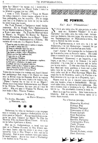 4 TE PIPIWHARAUROA. HE AHA TATOU I KIIA AI HE MAORI. Ki te Etita o Te Pipiwharauroa. TENA koa tuku atu nga kupu nei, he tau- toko i te whakamarama a Nikora Tautau mo te patai a Te Waaka Te Ranui o Ruatoki e mau nei, i te Nama 151. Tera pea ka kite iho ia i te whakahoki a Nikora i Te Pipi o Tihema tata nei. Koia na e Te Waaka ki o konei kaumatua te Maori. He ingoa tonu tena no mua iho, me te Pakepakeha no te Turehu, ko te reo he hoiho i he kihi. Kati kei roa noa. Mo te ingoa a te Pakeha i hua na he Maori to ingoa, kaore i Turanga nei. Tenei ke nga kupu e rangona ana ki konei. I te taenga mai o te Motu o Kapene Kuki ki Turanga, he motu hoki no tawhiti te ingoa o te kaipuke ki Nehera ara ki nga tangata o mua o taua wa i tae mai ai a Kapene Kuki. Ka uia nga kai o te whenua e Kapene Kuki. He kai whakamaori ano tana ko Tupaea te ingoa. Ka whakahuatia mai nga ingoa o nga kai katoa o tawhiti. Ka whakahokia atu e nga Maori kaore katoa ko te kumara anake kei konei. Ka ki o Kapene Kuki, he whenua kai kore tenei, ka tapa e Ia te ingoa mo Turanga ka Papati Pei (Poverty Bay) ara ko te Kokorutanga kaikore, e mau nei ano taua ingoa. I te taenga a Kapene Kuki ki Uawa ka hoe atu nga Maori i runga i to ratou waka, ka uia mai e Kapene Kuki te ingoa o te whenua me te tuhi mai ano tona ringa ki uta, ka mahara nga Maori e ui ana ki te ingoa o te hau, ka ki atu he Taraki. Ka mahara a Kapene Kuki ko te ingoa tera o te whenua, huaina iho e ia te ingoa ko Taraki Pei (Tolaga Bay). Nana ena ingoa i hua, e mau nei ano i runga i te mapi. Ka homai e te Pakeha ko te Puteito, ka tohu- tohu mai i te mahinga, me te ki mai he kai pai. Ka kii e te Maori te ingoa he Para, i rite hoki ki to uta nei kai ki te Paratawhiti. Ka onokia ka tipu tae noa ki te pakaritanga, ka hauhaketia ka kitea te nunui te papai, ka kiia katahi te Para pai, te para nunui, te para kaita, te para whakahara. Ka tunua ki te ahi ka maoa, ka romia, tangotango ana, ka mawhaki ka kitea te mangaro, ka kiia katahi te para mangaro. Kua puta ake te kakara ki te ihu ka kiia katahi te para kakara. Ka kainga ka reka ka kiia katahi te para reka. No aua ra iho ano, i te wa i a Kapene Kuki taua ingoa a na kaumatua o konei. E kiia ana he Taraka tetahi he Waeruru tetahi: ko nga parareka enei o mua. No na kaipuke o muri mai ka tae mai etahi parareka me nga ingoa ano—he Papaka, he Aniwaniwa, he Parete, he Taewa, he Pokohinu, he Riwai, he Parakokako, he Rokeroke, he Apetaonga, he Huamango, he Waiti, he Karamu, he Kape- tana, me te tini noaiho. Ki te mahara ake na te Pakeha ano aua ingoa, na te whakahua a te Maori i puta ke ai. Ko to ingoa huihui katoa ia he Parareka. He penei ano hoki pea ki te Pakeha, ki te iwi nana te kai, he ingoa ano to nga puteito. Ka huia te ingoa kotahi he putei- tohii. Pena tonu te ingoa o nga kumara maori. He maha nga ahua o te kumara me tonu ingoa, me tona ingoa. Kotahi tonu te ingoa nui he kumara. Pena tonu te Taro maori. He maha nga ahua me tona ingoa, me tona ingoa, kotahi tonu ia tona ingoa nui he Taro maori. He He pena ano te Hue maori me te Korau maori. Ko te Paukena me era atu tini Hue, te Tonape me era atu Korau, na te Pakeha ena i mau mai, koia i kiia ai he Hue pakeha, he Korau pakeha. Ko te ingoa pakeha na te Maori tena ingoa i hua, he pena me ta Nikora e whakamarama na ki ta o konei kaumatua korero. Ko enei ra ko Tihema, ko Hanuere, ko Pepuere ki ta ratou whakamoe tau, ara whakapapa tau, ko " Rukiterangi ka tau ki raro." Ka hua nga kai o te whenua, o te wai maori, o te moana. Ka tae ki ona po ano, he Tangaroa, ko Whaitiripapa te ingoa, ka tirohia nga tohu o te marino o te hau kore. I te ata po kaore ano kia toko nga kawainga o te ata ka maanu koi kaha ana te hau tuawhenua ara te Taraki. Ka rere, ao rawa i te ata ka tae ki te tahora, ka maanu, ka tukua nga punga, ka hi i te ika, i te tara- kihi. Ka morunga rawa mai te ra ka kitea atu tetahi waka e hoe mai ana, i ahu mai i waho i tawhiti. He roa te waka he tokomaha noa atu nga tangata ki te hoe i tetahi taha i tetahi taha me nga kapa tangata ano o waenganui, me te tangata hautu ano e tu ana, me te tangata ano o te kei e tu ana. Tika tonu mai ki to ratou waka Maori e tau atu nei. Ka wehi nga tangata nei ka mahara he waka taua. Me te mahara ano kaore a konei e hoe ana i te waka taua. Ko manu mai te waka ra ka uta nga tangata i nga hoe ki runga. Ka noho te kai hautu me te tangata o te ta, ka tu te tangata o te ihu, ka tukua te punga. Kua whakapae te manu mai kua rite ki to ratou. Ka kitea atu te roa o te waka me te tokomaha me nga tangata ano o waenganui. Kei te mahi na mea i nga taha i a ratou aho. Kei te mounou, kua maka ki te moana. He rite tonu te hutinga, e wha e rima e ono ki runga ki na matau o te aho, pera tonu tetahi taha. Kua kore te wehi o te waka o na Maori nei, kua ngahau atu ki te mau