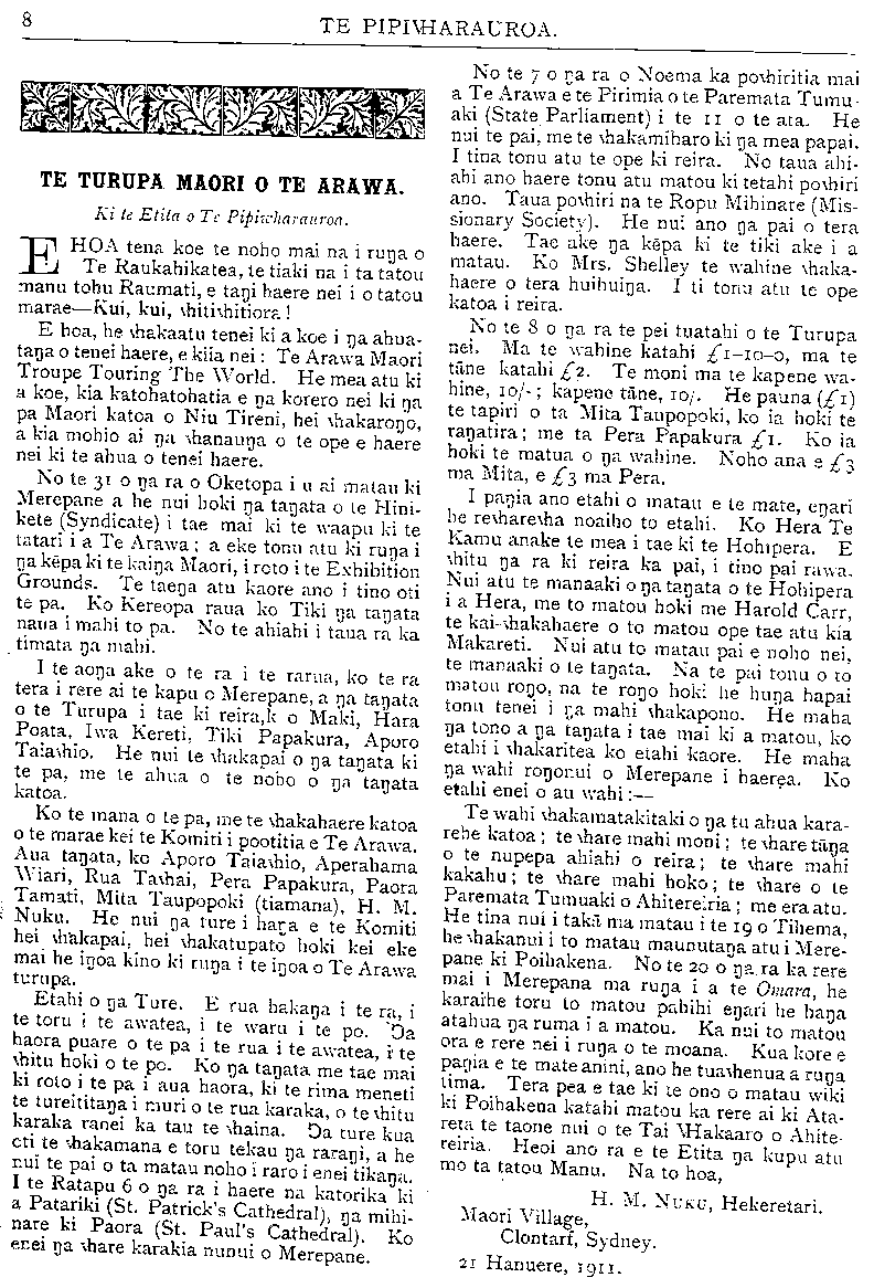 8 TE PIPIWHARAUROA. TE TURUPA MAORI O TE ARAWA. Ki te Etita o Te Pipiwharauroa . EHOA tena koe te noho mai na i runga o Te Raukahikatea, te tiaki na i ta tatou manu tohu Raumati, e tangi haere nei i o tatou marae—Kui, kui, whitiwhitiora! E hoa, he whakaatu tenei ki a koe i nga ahua- tanga o tenei haere, e kiia nei: Te Arawa Maori Troupe Touring The World. He mea atu ki a koe, kia katohatohatia e nga korero nei ki nga pa Maori katoa o Niu Tireni, hei whakarongo, a kia mohio ai nga whanaunga o te ope e haere nei ki te ahua o tenei haere. No te 31 o nga ra o Oketopa i u ai matau ki Merepane a he nui hoki nga tangata o te Hini- kete (Syndicate) i tae mai ki te waapu ki te tatari i a Te Arawa; a eke tonu atu ki runga i nga kepa ki te kainga Maori, i roto i te Exhibition Grounds. Te taenga atu kaore ano i tino oti te pa. Ko Kereopa raua ko Tiki nga tangata nana i mahi to pa. No te ahiahi i taua ra ka timata nga mahi. I te aonga ake o te ra i te rarua, ko te ra tera i rere ai te kapu o Merepane, a nga tangata o te Turupa i tae ki reira, ko Maki, Hara Poata, Iwa Kereti, Tiki Papakura, Aporo Taiawhio. He nui te whakapai o nga tangata ki te pa, me te ahua o te noho o nga tangata katoa. Ko te mana o te pa, me te whakahaere katoa o te marae kei te Komiti i pootitia e Te Arawa. Aua tangata, ko Aporo Taiawhio, Aperahama Wiari, Rua Tawhai, Pera Papakura, Paora Tamati, Mita Taupopoki (tiamana), H. M. Nuku. He nui nga ture i hanga e te Komiti hei whakapai, hei whakatupato hoki kei eke mai he ingoa kino ki runga i te ingoa o Te Arawa turupa. Etahi o nga Ture. E rua hakanga i te ra, i te toru i te awatea, i te waru i te po. Nga haora puare o te pa i te rua i te awatea, i te whitu hoki o te po. Ko nga tangata me tae mai ki roto i te pa i aua haora, ki te rima meneti te tureititanga i muri o te rua karaka, o te whitu karaka ranei ka tau te whaina. Nga ture kua oti te whakamana e toru tekau nga rarangi, a he nui te pai o ta matau noho i raro i enei tikanga. I te Ratapu 6 o nga ra i haere na katorika ki a Patariki (St. Patrick's Cathedral), nga mihi- nare ki Paora (St. Paul's Cathedral). Ko enei nga whare karakia nunui o Merepane. No te 7 o nga ra o Noema ka powhiritia mai a Te Arawa e te Pirimia o te Paremata Tumu- aki (State Parliament) i te 11 o te ata. He nui te pai, me te whakamiharo ki nga mea papai. I tina tonu atu te ope ki reira. No taua ahi- ahi ano haere tonu atu matou ki tetahi powhiri ano. Taua powhiri na te Ropu Mihinare (Mis- sionary Society). He nui ano nga pai o tera haere. Tae ake nga kepa ki te tiki ake i a matau. Ko Mrs. Shelley te wahine whaka- haere o tera huihuinga. I ti tonu atu te ope katoa i reira. No te 8 o nga ra te pei tuatahi o te Turupa nei. Ma te wahine katahi £1-10-0, ma te tane katahi £2. Te moni ma te kapene wa- hine, 10/-; kapene tane, 10/. He pauna (£1) te tapiri o ta Mita Taupopoki, ko ia hoki te rangatira; me ta Pera Papakura £1. Ko ia hoki te matua o nga wahine. Noho ana e £3 ma Mita, e £3 ma Pera. I pangia ano etahi o matau e te mate, engari he rewharewha noaiho to etahi. Ko Hera Te Kamu anake te mea i tae ki te Hohipera. E whitu nga ra ki reira ka pai, i tino pai rawa. Nui atu te manaaki o nga tangata o te Hohipera i a Hera, me to matou hoki me Harold Carr, te kai-whakahaere o to matou ope tae atu kia Makareti. Nui atu to matau pai e noho nei, te manaaki o te tangata. Na te pai tonu o to matou rongo, na te rongo hoki he hunga hapai tonu tenei i nga mahi whakapono. He maha nga tono a nga tangata i tae mai ki a matou, ko etahi i whakaritea ko etahi kaore. He maha nga wahi rongonui o Merepane i haerea. Ko etahi enei o au wahi:— Te wahi whakamatakitaki o nga tu ahua kara- rehe katoa; te whare mahi moni; te whare tanga o te nupepa ahiahi o reira; te whare mahi kakahu; te whare mahi hoko; te whare o te Paremata Tumuaki o Ahitereiria; me era atu. He tina nui i taka ma matau i te 19 o Tihema, he whakanui i to matau maunutanga atu i Mere- pane ki Poihakena. No te 20 o nga ra ka rere mai i Merepana ma runga i a te Omara, he karaihe toru to matou pahihi engari he hanga atahua nga ruma i a matou. Ka nui to matou ora e rere nei i runga o te moana. Kua kore e pangia e te mate anini, ano he tuawhenua a runga tima. Tera pea e tae ki te ono o matau wiki ki Poihakena katahi matou ka rere ai ki Ata- reta te taone nui o te Tai Whakaaro o Ahite- reiria. Heoi ano ra e te Etita nga kupu atu mo ta tatou Manu. Na to hoa, H. M. NUKU, Hekeretari. Maori Village, Clontarf, Sydney. 21 Hanuere, 1911.