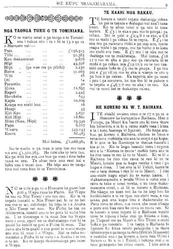 HE KUPU WHAKAMARAMA. TE KAARI HUA RAKAU. NGA TAONGA TUKU O TE TOMINIANA. KO te wariu tenei o na taonga o te Tomini- ana i tukua atu i te i ki te 15 o nga ra o Hanuere. nei:—- Pata ... ... ... £158, 523 Tuhi ... ... ... ... 91,365 Kau whakamatao ... ... 9,876 Hipi ... ... ... 43,398 Hipi „ (nga wae me nga pihihi) 2, 230 Reme „ ... ... ... 91,083 Witi ... ... ... 16 Oti ... ... ... 14 Parareka ... ... ... 50 Muka ... ... ... 12, 895 Rapeti ... ... ... . 4, 445 Harakeke ... ... ... 643 Kapia ... ... ... 10, 229 Kaanga me etahi hua ... ... 16 Haapi ... ... ... 45 Kin Kau ... ... ... 5,831 Kiri Hipi ... ... ... 18, 601 Hinu (Kau, Hipi) ... ... 25,359 6, 717 Papa Wuuru Koura 545.143 62, 485 Hui katoa, £1, 088, 964 Ko te wariu o na mea o tera tau mo taua wa ano £1,310,763 He rahi ake to tera tau. Ko nga witi me era atu hua nga mea i tino heke rawa te utu. Te ahua tera ano enei kai e heke ano i tenei tau. He hipi ano te taonga tino nui tona hua ki te Tominiana. NO te tahi o na ra o Hanuere ka purei hoe poti a Wepu raua ko Piana. Ko Wepu he toa no Niu Tireni i era tau atu. Ko ia te tangata tuatahi o Niu Tireni nei ki te tu hei toa mo te ao, rokohanga ka hinga ia i a Anaha o Niu Tireni nei ano. Ko Piana he toa no Ahitereiria, katahi ano ia ka puta ki waho hoe ai. I te timatanga o ta raua hoe ko Wepu tonu i mua, engari no te whakatatanga mai ki te paahi ka kokiri te poti o Piaha ki mua. Tae rawa atu ki te paahi e rua pooti te mataratanga atu ona ki mua i a Wepu. Kei te noho tu- manako a Piaha ki te wero i a Anaha i te toa o te ao. Ko te hoenga whakamutunga pea tenei a Wepu. 9 TE korero a tetahi tangata whakatipu rakau ka pei te tangata e whakapai nui ana i tana kaari. Ko te ahua tenei o nga utu ki tana korero. E £5 i te eka e pau mo te pounga i nga rakau. Mo te naki e £2/4/8 i te eka, e 6/6 mo te mahi i nga rakau ki te rongoa. oa. E £4 i te eka mo nga raruraru ririki e pa mai ana, mo te mapu mahi i nga rongoa, mo nga hoiho o te kata me etahi atu mea. E £7 mo i te eka mo te whatianga me te makitetanga. Hui katoa, £18 11/2 mo te eka e pau mo nga raruraru ki te mahi o nga rakau, ara £12/11/2 no te tau tua- tahi anake hoki te £5 mo te pounga. I nga tau pai e £59/18/10 mo te eka a waenga te utu o nga hua o nga rakau. Ka tangohia atu nga moni i pau i nga raruraru, ka toe iho ki te pakete o te tangata e £46/7/8 mo te eka i te tau. Ka nui te moni kei te whakatipu rakau. HE KORERO NA W. T. RAIHANA. ITE ahiahi awatea tonu o te 17 o nga ra o Hanuere ko karangatia e Raihana, Mea o Turanga, nga Maori kia haere atu ki tona whare kia korerotia e ia ki a ratou etahi mea i kitea e ia i tona haerenga ki Ingarani. He hanga ata- hua nga korero a Raihana, ahakoa te haua o tona reo e mohiotia atu ana te aronga o nga kupu. E ki ana ia ko Rarotonga te whenua tuatahi i tae ai ia. Ko te kupu tuatahi tonu i rangona atu e ia "Kumea te taura" mohio tonu atu ia he rite tonu te reo ki to te Maori. Ki te ki a Raihana he tino rite rawa te reo ki to te Maori, kotahi pea te kupu rereke i roto i nga kupu e rima. I tae ano ia ki Tahiti, kaore te reo o tera whenua i rite ki to te Maori. I rite ano etahi kupu engari ko te nuinga kaore. I whakamaramatia e tetahi Wiwi e noho ana i reira te take o tenei rereke, a ko tana whaka- marama tenei, e ai ki te korero a Raihana. He tikanga na taua iwi ka tu he kingi hou ka hurihiaketia e ia he ingoa mo etahi mea, e rua tekau pea ana kupu hou e whakarereke ai. Pena tonu te ahua, roa rawa ake taua tikanga e pera ana kua rere ke rawa to ratou reo. Ki te korero a taua tangata ki a Raihana kotahi tonu te tipuna i heke; nai nga Iniana o Inia, nga Tiapani me na Maori o Niu Tireni o etahi hoki o nga moutere. I te taenga o Raihana ki Ingarani ka kitea tetahi pukapuka i te whare takotoranga o nga taonga tawhito (British Museum) e tautoko ana i na korero a tona hoa Wiwi i korero ra ki a ia i Tahiti, i hokona mai e ia taua pukapuka hei titiro mana. I kite ano a