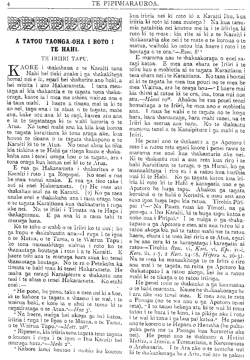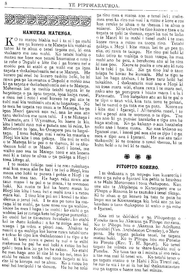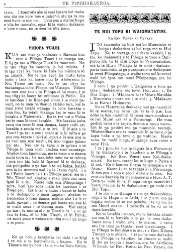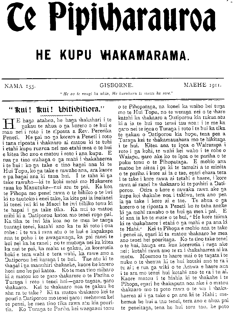 Te Pipiwharauroa HE KUPU WHAKAMARAMA. NAMA 155 GISBORNE. " He ao te rangi ka uhia, He huruhuru te manu ka; we." MAEHE 1911. "KUI! KUI! WHITIWHITIORA." HE hanga atahua, he hanga whakahari i te ngakau te ahua o nga korero o te hui e mau nei i roto i te ripoata a Rev. Pererika Peneti. He pai no nga korero a Peneti i roto i tana ripoata i whakaaro ai matou ki te tuhi i etahi kupu ruarua nei mo etahi mea o te hui e kitea iho ano e matou i roto i ana kupu. E rua nga tino wahanga o nga mahi i whakahaerea i te hui:- ko nga take e tino hangai ana ki te Hui Topu, ko nga take e rawaho ana, ara kaore e pa hangai ana ki taua hui. I te taha ki nga take rawaho—ki te kohi moni mo Hukarere raua ko Manutuke—nui atu te pai, Ka koa te Pihopa mo penei rawa o te hihiko o te iwi ki to tautoko i enei take, ka kite pai ia inaianei ki tenei iwi ki te Maori he iwi hihiko tonu ki te hapai i nga take tika. Ka nui to matou mihi ki a Ngatiporou katoa mo tenei rongo pai. Ka tika te iwi kia koa no te mea he taonga tuarangi tenei, katahi ano ka tu ki roto i ona rohe: i te wa i mua atu o te hui e kapakapa ana te poho i te awangawanga, ka pai ranei te hui nei ka he ranei; no te mutunga nei ka kitea ka nui te pai, ka maha te ngakau, ka korerotia hoki e tera wahi e tera wahi, ka rawe ano a Ngatiporou hei karanga i te hui. Tae atu ki te whangai i nga manuhiri whakaeke, kaore he korero heoi ano he pai katoa. Ko te mea tino miharo ki a matou ko te ngaro whakarere o te Pariha o Turanga i roto i tenei hui—ngaro tangata, ngaro whakaaro. Kei te whakaaro noa te ngakau he aha ra te take? Ki ta matou whakaaro kei te pouri a Ngatiporou mo tenei ngaro: mehemea kei te penei, he mea tino tika rawa atu kia pouri- tia. Ko Turanga te Pariha kei waenganui tonu o te Pihopatanga, na konei ka waiho hei tunga mo te Hui Topu, no te weranga nei o te whare katahi ka whakaaro a Ngatiporou kia tukua atu ki a ia te hui mo tenei tau noa:- i te me ka ngaro nei te ingoa o Turanga i roto i te hui ka tika te ngakau o Ngatiporou kia hopu, tena pea a Turanga kei te whakamauahara mo te hikitanga i te hui. Kitea ana te ingoa o Wairarapa i roto i nga kohi, te wahi kei waho i te rohe o Waiapu, ngaro ake ko te ingoa o te pariha o te puku tonu o te Pihopatanga. E mohio ana matou he aitua i pa ki te tamaiti a te minita o te pariha i kore ai ia e tae, engari ehara tera i te take i kore rawa ai tetahi e haere, i kore rawa ai ranei he whakaaro ki te powhiri a Ngati- porou. O tira e kore e rawaka rawa ake nga kupu koi whakahe noa i takiwa, tera ano pea ia nga take i kore ai e tae. Te ahua o nga korero o te ripoata a Peneti ko te taha anake ki nga mahi rawaho o te hui nga mea i pai. E ki ana ia ko te mate o te hui, " He kore taima ki te whakahaere i etahi o nga mahi e pa ana ki te Hahi." Kei te Pihopa e mohio ana te take i penei ai, engari ki ta matou whakaaro he mea ano tenei hei pouritanga. Ko te tino take tenei o te hui, haunga era kua korerotia i runga ake nei; kotahi rawa ano te ra i whakahaerea ai ka mutu. Moumou te haere mai o te tangata i te nuku o te whenua ki te hui kotahi ano te ra i tu ai; e rua nga wiki o te Arawa e haere ana i te ara mo tenei hui kotahi ano te ra i tu ai. Kaore matou i te hiahia ki te whakahe i te Pihopa, engari he whakaputa noa ake i o matou whakaaro mo te poto rawa o te wa i whaka- haerea ai i nga take e pa ana ki te Hahi; me- hemea he hui a tau tenei, tera ano e ahua pai te peneitanga, tena he hui toru tau, he poto
