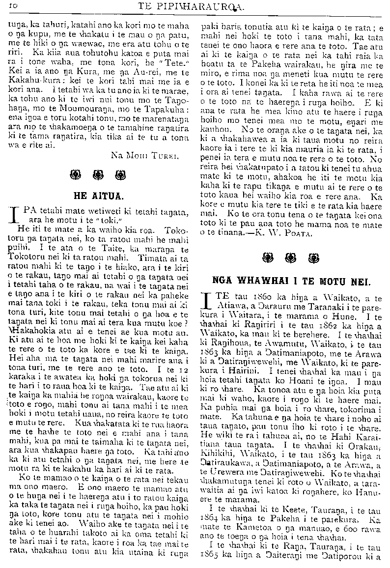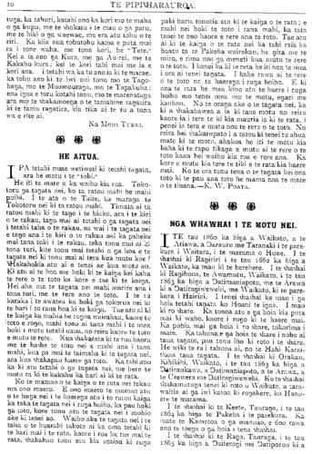 IO TE PIPIWHARAUROA. tunga, ka tahuri, katahi ano ka kori mo te maha o nga kupu, me te whakatu i te mau o na patu, me te hiki o nga waewae, me era atu tohu o te riri. Ka kiia aua tohutohu katoa e puta mai ra i tone waha, me tona kori, he " Tete." Kei a ia ano nga Kura, me nga Au-rei, me te Kakahu-kura: kei te kori tahi mai me ia e kori ana. I tetahi wa ka tu ano ia ki te marae, ka tohu ano ki te iwi nui tonu mo te Tango- hanga, mo te Moumouranga, mo te Tapakuha: ena ingoa e toru kotahi tonu, mo te marenatanga ara mo te whakamoenga o te tamahine rangatira ki te tama rangatira, kia tika ai te tu a tona wa e rite ai. Na MOHI TUREI. HE AITUA. I PA tetahi mate wetiweti ki tetahi tangata, ara he motu i te " toki." He iti te mate a ka waiho kia roa. Toko- toru nga tangata nei, ko ta ratou mahi he mahi puihi. I te ata o te Taite, ka maranga te Tokotoru nei ki ta ratou mahi. Timata ai ta ratou mahi ki te tango i te hiako, ara i te kin o te rakau, tango mai ai tetahi o nga tangata nei i tetahi taha o te rakau, na wai i te tangata nei e tango ana i te kiri o te rakau nei ka paheke mai tana toki i te rakau, teka tonu mai ai ki tona turi, kite tonu mai tetahi o nga hoa e te tangata nei ki tonu mai ai tera kua mutu koe? Whakahokia atu ai e tenei ae kua motu au. Ki atu ai te hoa me hoki ki te kainga kei kaha te rere o te toto ka kore e tae ki te kainga. Hei aha ma te tangata nei mahi mari re ana i tona turi, me te rere ano te toto. I te 12 karaka i te awatea ka hoki nga tokorua nei ki te hari i to raua hoa ki te kainga. Tae atu ai ki te kainga ka mahia he rongoa wairakau, kaore te toto e rongo, mahi tonu ai tana mahi i te mea hoki i motu tetahi uaua, no reira kaore te toto e mutu te rere. Kua whakatata ki te rua haora me te hawhe te toto nei e mahi ana i tana mahi, kua pa mai te taimaha ki te tangata nei, ara kua whakapau haere nga toto. Ka tahi ano ka ki atu tetahi o nga tangata nei, me here te motu ra ki te kakahu ka hari ai ki te rata. Ko te mamao o te kainga o te rata nei tekau ma ono maero. E ono maero te mamao atu o te hunga nei i te haerenga atu i to ratou kainga ka taka te tangata nei i runga hoiho, ka pau hoki nga toto, kore tonu atu te tangata nei i mohio ake ki tenei ao. Waiho ake te tangata nei i te taha o te huarahi takoto ai ka oma tetahi ki te hari mai i te rata, kaore i roa ka tae mai te rata, whakahau tonu atu kia utaina ki runa paki haria tonutia atu ki te kainga o te rata; e mahi nei hoki te toto i tana mahi, ka tata tenei te ono haora e rere ana te toto. Tae atu ai ki te kainga o te rata nei ka tahi raia ka hoatu ta te Pakeha wairakau, he ngira me te miro, e rima noa nga meneti kua mutu te rere o te toto. I konei ka ki te reta he iti noa te mea i ora ai tenei tangata. I kaha rawa ai te rere o te toto na te haerenga i runga hoiho. E ki ana te rata he mea kino atu te haere i runga hoiho mo tenei mea mo te motu, engari me kauhou. No te oranga ake o te tangata nei, ka ki a whakahawea a ia ki taua motu no reira kaore ia i tere te ki kia mauria ia ki te rata, i penei ia tera e mutu noa te rere o te toto. No reira hei whakatupato i a tatou ki tenei tu ahua mate ki te motu, ahakoa he iti te motu kia kaha ki te rapu tikanga e mutu ai te rere o te toto kaua hei waiho kia roa e rere ana. Ka kore e mutu kia tere te tiki e te rata kia haere mai. Ko te ora tonu tena o te tangata kei ona toto ki te pau ana toto he mama noa te mate o te tinana.—K. W. POATA. NGA WHAWHAI I TE MOTU NEI. ITE tau 1860 ka hinga a Waikato, a te Atiawa, a Ngarauru me Taranaki i te pare- kura i Waitara, i te marama o Hune. I te whawhai ki Rangiriri i te tau 1862 ka hinga a Waikato, ka mau ki te herehere. I te whawhai ki Rangihoua, te Awamutu, Waikato i te tau 1863 ka hinga a Ngatimaniapoto, me te Arawa ki a Ngatirangiwewehi, me Waikato, ki te pare- kura i Hairini. I tenei whawhai ka mau i nga hoia tetahi tangata ko Hoani te ingoa. I mau ki ro whare. Ka tonoa atu e nga hoia kia puta mai ki waho, kaore i rongo ki te haere mai. Ka puhia mai nga hoia i ro whare, tokorima i mate. Ka tahuna e nga hoia te whare i noho ai taua tangata, pau tonu iho ki roto i te whare. He wiki te rai tahuna ai, no te Hahi Karai- tiana taua tangata. I te whawhai ki Orakau,- Kihikihi, Waikato, i te tau 1863 ka hina a Ngatiraukawa, a Ngatimaniapoto, a te Arawa, a te Urewera me Ngatirangiwewehi. Ko te whawhai whakamutunga tenei ki roto u Waikato, a tara- waitia ai nga iwi katoa ki rongahere, ko Hanu- ere te marama. I te whawhai ki te Keete, Tauranga, i te tau 1864 ka hinga te Pakeha i te parekura. Ka mate te Kametoa o nga manuao, e 600 rawa ano te toenga o nga hoia i tena whawhai. I te whawhai ki te Rana, Tauranga, i te tau 1865 ka hinga a Ngaiterangi me Ngatiporou ki a