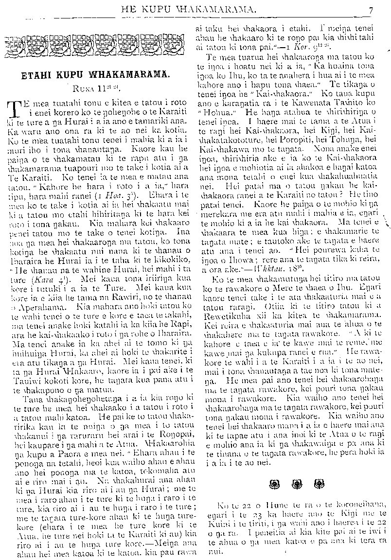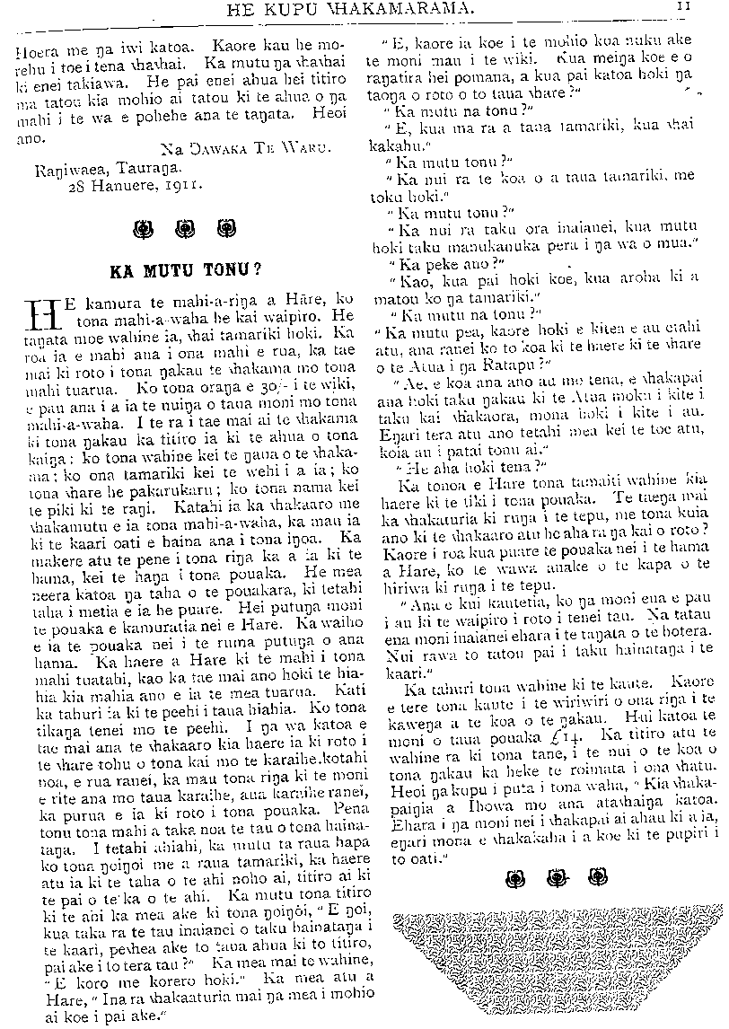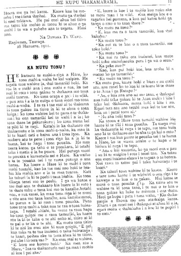 HE KUPU WHAKAMARAMA. 11 Hoera me nga iwi katoa. Kaore kau he mo- rehu i toe i tena whawhai. Ka mutu nga whawhai ki enei takiawa. He pai enei ahua hei titiro ma tatou kia mohio ai tatou ki te ahua o nga mahi i te wa e pohehe ana te tangata. Heoi ano. Na NGAWAKA TE WARU. Rangiwaea, Tauranga. 28 Hanuere, 1911. KA MUTU TONU? HE kamura te mahi-a-ringa a Hare, ko tona mahi-a-waha he kai waipiro. He tangata moe wahine ia, whai tamariki hoki. Ka roa ia e mahi aua i ona mahi e rua, ka tae mai ki roto i tona ngakau te whakama mo tona mahi tuarua. Ko tona oranga e 30 i te wiki, e pau ana i a ia te nuinga o taua moni mo tona mahi-a-waha. I te ra i tae mai ai te whakama ki tona ngakau ka titiro ia ki te ahua o tona kainga: ko tona wahine kei te ngaua o te whaka- ma; ko ona tamariki kei te wehi i a ia; ko tona whare he pakarukaru; ko tona nama kei te piki ki te rangi. Katahi ia ka whakaaro me whakamutu e ia tona mahi-a-waha, ka mau ia ki te kaari oati e haina ana i tona ingoa. Ka makere atu te pene i tona ringa ka a ia ki te hama, kei te hanga i tona pouaka. He mea neera katoa nga taha o te pouakara, ki tetahi taha i metia e ia he puare. Hei putunga moni te pouaka e kamuratia nei e Hare. Ka waiho e ia te pouaka nei i te ruma putunga o ana hama. Ka haere a Hare ki te mahi i tona mahi tuatahi, kao ka tae mai ano hoki te hia- hia kia mahia ano e ia te mea tuarua. Kati ka tahuri ia ki te peehi i taua hiahia. Ko tona tikanga tenei mo te peehi. I nga wa katoa e tae mai ana te whakaaro kia haere ia ki roto i te whare tohu o tona kai mo te karaihe kotahi noa, e rua ranei, ka mau tona ringa ki te moni e rite ana mo taua karaihe, aua karaihe ranei, ka puma e ia ki roto i tona pouaka. Pena tonu tona mahi a taka noa te tau o tona haina- tanga. I tetahi ahiahi, ka mutu ta raua hapa ko tona ngoingoi me a raua tamariki, ka haere atu ia ki te taha o te ahi noho ai, titiro ai ki te pai o te ka o te ahi. Ka mutu tona titiro ki te ahi ka mea ake ki tona ngoingoi, " E ngoi, kua taka ra te tau inaianei o taku hainatanga i te kaari, pewhea ake to taua ahua ki to titiro, pai ake i to tera tau?" Ka mea mai te wahine, " E koro me korero hoki." Ka mea atu a Hare," Ina ra whakaaturia mai nga mea i mohio ai koe i pai ake." " E, kaore ia koe i te mohio kua nuku ake te moni mau i te wiki. Kua meinga koe e o rangatira hei pomana, a kua pai katoa hoki nga taonga o roto o to taua whare?" " Ka mutu na tonu?" " E, kua ma ra a taua tamariki, kua whai kakahu." " Ka mutu tonu?" " Ka nui ra te koa o a taua tamariki, me toku hoki." " Ka mutu tonu?" " Ka nui ra taku ora inaianei, kua mutu hoki taku manukanuka pera i nga wa o mua." " Ka peke ano?" " Kao, kua pai hoki koe, kua aroha ki a matou ko na tamariki." " Ka mutu na tonu?" " Ka mutu pea, kaore hoki e kitea e au etahi atu, ana ranei ko to koa ki te haere ki te whare o te Atua i na Ratapu?" " Ae, e koa ana ano au mo tena, e whakapai ana hoki taku ngakau ki te Atua moku i kite i taku kai whakaora, mona hoki i kite i au. Engari tera atu ano tetahi mea kei te toe atu, koia au i patai tonu ai." " He aha hoki tena?" Ka tonoa e Hare tona tamaiti wahine kia haere ki te tiki i tona pouaka. Te taenga mai ka whakaturia, ki runga i te tepu, me tona kuia ano ki te whakaaro atu he aha ra na kai o roto? Kaore i rua kua puare te pouaka nei i te hama a Hare, ko te wawa anake o tu kapa o te hiriwa ki runga i te tepu. " Ana e kui kautetia, ko nga moni ena e pau i au ki te waipiro i roto i tenei tau. Na tatau ena moni inaianei ehara i te tangata o te hotera. Nui rawa to tatou pai i taku hainatanga i te kaari." Ka tahuri tuna wahine ki te kaute. Kaore e tere tona kaute i te wiriwiri o una ringa i te kawenga a te koa o te ngakau. Hui katoa te moni o taua pouaka £14. Ka titiro atu te wahine ra ki tona tane, i te nui o te koa o tona ngakau ka heke te roimata i ona whatu. Heoi nga kupu i puta i tona waha, " Kia whaka- paingia a Ihowa mo ana atawhainga katoa. Ehara i na moni nei i whakapai ai ahau ki a ia, engari mona e whakakaha i a koe ki te pupiri i to oati."
