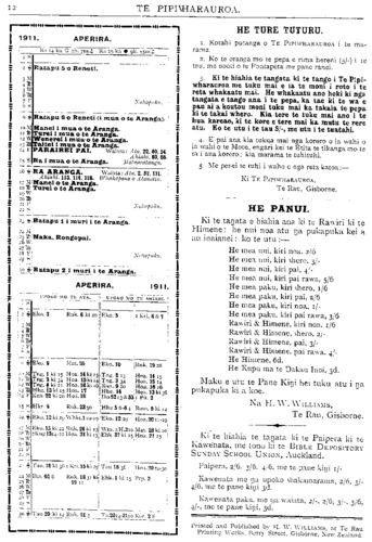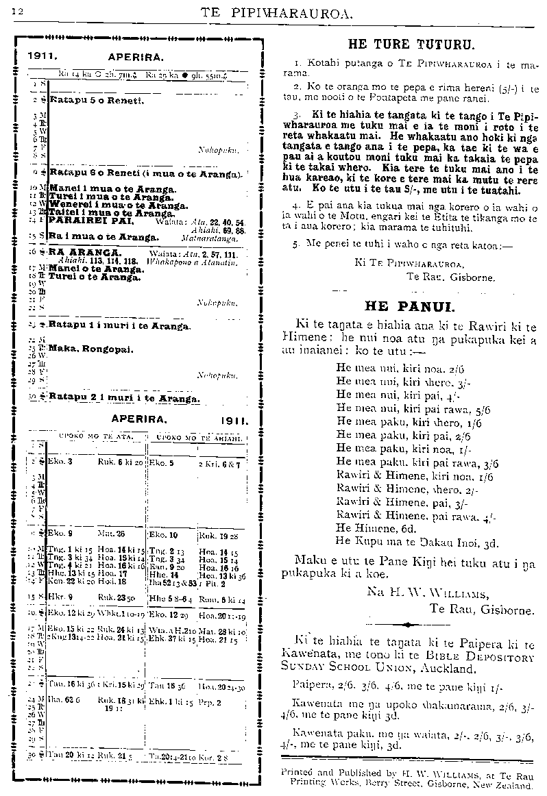 TE PIPIWHARAUROA. HE TURE TUTURU. 1. Kotahi putanga o TE PIPIWHARAUROA i te ma- rama. 2. Ko te oranga mo te pepa e rima hereni (5/-) i te tau, me nooti o te Poutapeta me pane ranei, auaka i te tiaki he pane kingi hepene nga pane e tino hiahiatia ana. 3. Ki te pau nga hereni a tetahi tangata i tuku mai ai ka tukua atu he kaute. Ki te tae atu te kaute kia hohoro te tuku mai i te moni, na te moni hoki i puta atu ai te pepa ehara i te mea tupu noa. 4. E pai ana kia tukua mai nga korero o ia wahi o ia wahi o te Motu, engari kei te Etita te tikanga mo te ta i aua korero : kia marama te tuhituhi. 5. Me penei te tuhi i waho o nga reta katoa: — Ki TE PIPIWHARAUROA, Te Rau, Gisborne. HE PANUI Ki te tangata e hiahia ana ki te Rawiri ki te Himene : he nui noa atu nga pukapuka kei a au inaianei : ko te utu : — He mea nui, kin noa ... 2/6 He mea nui, kiri wher ... 3/- He mea nui, kiri pai ... 4/— He mea nui kiri pai rawa ... 5/6 H e mea paku, kiri whero ... 1/6 H e mea paku, kiri pai . . . 2/6 He mea paku, kiri noa ... 1/- He mea paku, kiri pai rawa 3/6 Rawiri & Himene, kiri noa 1/6 Rawiri & Himene, whero ... 2/- Rawiri & Himene, pai ... 3/- Rawiri & Himene, pai rawa 4/- He Himene ... ... -/6 Maku e utu te Pane Kingi hei tuku atu i nga pukapuka ki a koe. Na H. W. WILLIAMS, Te Rau, Gisborne. Ki te hiahia te tangata ki te Paipera ki te, Kawenata, me tono ki te BIBLE DEPOSITORY SUNDAY SCHOOL UNION, Auckland. Paipera, 2/6, 3/6, 4/6, me te pane kingi //- Kawenata me nga upoko whakamarama 2/6 3/- 4/6, me te pane kingi 3d. Kawenata paku, me nga waiata 2/-, 2/6, 3/-, 3/6, 4/-, me te pane kingi, 3d. Printed and Published by H. W. WILLIAMS, at Te Rau Printing Works, Berry Street, Gisborne, New Zealand.