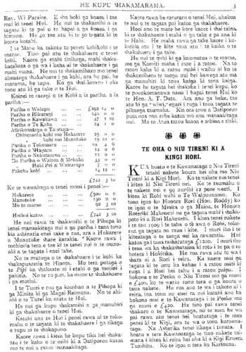 HE KUPU WHAKAMARAMA. Rev. Wi Paraire. E wha hoki na koaea i tae mai ki tenei Hui. He nui te whakamihi o te tangata ki te pai o te hapai a na koaea i na himene. He 40 tae atu ki te 50 tangata ki te koaea kotahi. I te Mane ka takoto te pereti kohikohi i te marae. Tino pai atu te whakahaere o tenei kohi. Kaore nga. mahi tinihanga, mahi whaka- katakata o na wa i kaha ai te whakahaere i nga mahi mana. He nui te whakamiharo mo tenei ahuatanga whakahaere i na kohi, ara he pai. he marama, he tapu. Ko na whai-korero i eke tonu atu ki nga take o te Hui. Koinei te rarangi o te Kohi a ia pariha, a ia pariha:— Pariha o Waiapu ... ... £292 14 o Pariha o Hikurangi ... ... 240 0 o Pariha o Kawakawa ... ... 47 1 10 Pariha o Te Kaha ... ... 24 1 o Atirikonatanga o Tauranga— Ohinemutu kohi mo Hukarere 25 0 o kohi mo Manutuke 15 10 o Pariha. o Tokomaru ... ... 19 4 6 Pariha o Whangara ... ... 12 o 6 Pariha. o Nukutaurua ... ... 12 0 0 Nga Pariha o Wairoa. & Mohaka 33 0 0 Haki Pei & Wairarapa 7 0 0 Pakeha kohi ... ... ... 14 12 o £742 3 10" Ko te wawahanga o tenei moni i penei:— Hukarere ... ... ... £500 Manutuke 150 0 0 Mo te marae 92 3 10 Huihui katoa ... ... ... £742 3 10 He nui rawa te whakamihi o te Pihopa ki tenei manaakitanga nui a nga pariha i tana tono kia awhinatia enei take e rua, ara a Hukarere a Man utu ke whare karakia. Kaore rawa i mohiotia tera e tae ki te tenei nui o te mana- aki a te tangata i enei take. No te mutunga o te whakahaere i te kohi ka whakapuaretia te Hinota. Mo tera putanga o te Pipi ka whakaatu ai i etahi o nga motini i pahitia. No te 10 p.m. ka mutu te whakahaere i nga motini. I te Turei e rua nga kauwhau a te Pihopa ki nga Minita ki nga Mangai Reimana. No te ahi- ahi o te Turei ka mutu te Hui. He nui nga kupu whakamihi a nga manuhiri ki na whakahaere o tenei Hui. Katahi ano te Hui i penei rawa ai te toko- maha o te tangata ki te whakahaere i nga tikanga e tupu ai te whakapono. Kaore rawa i kitea he kupu tika hei whaka- atu i te kaha o te mihi ki a Ngatiporou katoa mo te nui a ratou manaakitanga. Kaore rawa he raruraru o tenei Hui, ahakoa te nui o te tangata pai katoa na whakahaere. Heoi ano te mate he kore kaore i whai taina ki te whakahaere i etahi o na take e pa ana ki te Hahi. He maha rawa na take kaore i ko- kiritia atu i te kite tona atu i te kaika o te whakahaere i nga take. He nui te mihi ki na kaumatua o te marae, me nga Komiti maha i raro i a ratou. Na to ratou kaha ki a ratou mahi i waiho ai ko te whakamiharo te taonga nui hei kawenga atu ma na manuhiri ki tona kainga ki tona kainga. Kaore he tangata hei whakahe i tenei kupu. ko te pouokomanawa nana i hapai tenei Hui ko te Hon. A. T. Ngata. Ara ano nga heke, tae atu ki nga " wiwi," engari i runga i taua tangata te pikaunga taumaha. Kia ora tonu a Ngatiporou puta noa ona rohe katoa mo ana manaakitanga nui. Ma to Atua tatou katoa e awhina e tiaki. TE OHA O NIU TIRENI KI A KINGI HORI. KUA hoatu e te Kawanatanga o Niu Tireni tetahi nakete koura hei oha ma Niu Tireni ki a Kingi Hori. Ko te nakete nui tenei i kitea ki Niu Tireni nei. Ko te taumaha o te nakete nei e 99 aunihi 12 pene weeti, I kitea ki Rohi wahi o Te Waipounamu. Ko tona ingoa ko Honore Rori (Hon. Roddy) ko te ingoa o te Minita o nga Maina, te Honore Roteriki Makenehi na nga tangata mahi i whaka- poto ki a Rori Makenehi. I kitea tenei nakete i te tau 1909 i te taha o te awa o Rohi, toko- rua nga tangata na raua i kite. I muri iho i te kiteatanga o te taonga nei ka rawaratia. Hui katoa nga i taua rawharatanga £1 200. I muri iho i tena wa ka whakawhataina ki roto i te pa o te hotera i Hokitika. He roa rawa atu te wa i whata ai a Rori i reira. Ka haere mai nga tangata ki te unu ka kanae i a ratou mati ki runga i a Roti hei tahu i a ratou paipa. I hokona e te Peeka o Niu Tireni mo nga moni e £400, ko te wariu tonu tera o nga koura o taua nakete. He roa ano te wa i takoto ai i reira, ina tonu no enei ra nei katahi ano ka hokona mai e te Kawanatanga i te Peeke mo nga moni e £420. He tino pai rawa tenei whakaro o te Kawanatanga, no te mea he wa pai rawa atu tenei hei hoatutanga i te mea penei ki te Kingi, ara te wa o tona karauna- tanga. Na Awherika tenei tikanga i timata. I hoatu e tera Kawanatanga te tino nakete tai- mana i kitea ki reira hei oha ki a Kini Eruera Tuawhitu. Ko te ingoa o tera ko Karinana.