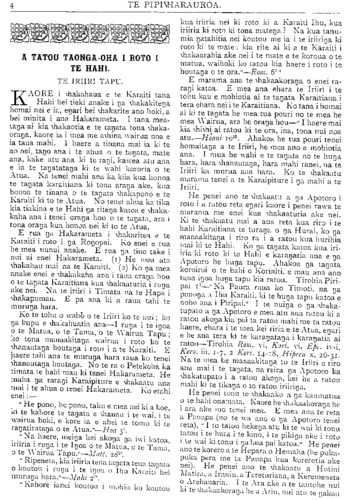 TE PIPIWHARAUROA. A TATOU TAONGA-OHA I ROTO I TE HAHI. TE IRIIRI TAPU. KAORE i whakahaua e te Karaiti tana Hahi hei tieki anake i nga whakakitenga homai nei e ia, engari hei whakarite ano hoki, a hei minita i ana Hakarameta. I tana mea- tanga ai kia whakaotia e te tangata tona whaka- oranga, kaore ia i mea me awhina wairua noa e ia taua mahi. I haere a tinana mai ia ki te ao nei, tango ana i te ahua o te tangata, mate ana, kake atu ana ki te rangi, kawea atu ana e ia te tangatatanga ki te wahi kororia o te Atua. Na tenei mahi ana ka kiia kua honoa te tangata karaitiana ki tona aranga ake, kua honoa te tinana o te tangata whakapono e te Karaiti ki to te Atua. No tenei ahua ka tika kia tiakina e te Hahi nga ritenga katoa e whaka- kaha ana i tenei oranga hou o te tangata, ara i tona oranga kua honoa nei ki to te Atua. E rua nga Hakarameta i whakaritea e te Karaiti i roto i nga Rongopai. Ko enei e rua kua iriiria nei ki roto ki a Karaiti Ihu, kua iriiria ki roto ki tona matenga? Na kua tanu- mia ngatahitia nei koutou me ia i te iriiringa ki roto ki te mate: kia rite ai ki a te Karati i whakaarahia ake nei i te mate e te koroua o te matua, waihoki ko tatou kia haere i roto i te houtanga o te ora."—Rom. 6 E marama ana te whakaakoranga o enei ra- rangi katoa. E mea ana ehara te Iriiri i te tohu kau e mohiotia ai te tangata Karaitiana i tera ehara nei i te Karaitiana. Ko tana i homai ai ki te tangata he mea tua pouri no te mea he mea Wairua, ara he oranga hou—" I haere mai kia whiwhi ai ratou ki te ora, ina, tona nui noa atu.—Hoani 10 1010 10. Ahakoa he tua pouri teneitenei homaitanga a te Iriiri, he mea ano e mohiotia ana. I mua he wahi e te tangata no te hunga hara, hara whanautanga, hara mahi ranei, na te Iriiri ka murua aua hara. Ko te whakaatu marama tenei a te Karaipiture i nga mahi a te Iriiri. He penei ano te whakaatu a nga Apotoro i roto i a ratou reta engari kaore i penei rawa te marama me enei kua whakaaturia ake nei. Ki te whakaatu mai a aua reta kua riro i te hahi Karaitiana te turanga o na Hurai, ko nga manaakitanga i riro ra i a ratou kua hurihia mai ki te Hahi. Ko nga tangata katoa kua iri- he mea nunui anake. E rua nga tino take i ina ki roto ki te Hahi e ri ana e nga nui ai enei Hakarameta. \_ (i) He mea ata Apotoro he huna tapu. Ahakoa nga tangata whakahau mai na te Karaiti. (2) Ko nga mea koroirui o te hahi o Koriniti, e mau ana ano anake enei e whakakaha ana i tana oranga hou taua inoa huna tapu kia ratou. Tirohia Piri- o te tangata Karaitiana kua whakaaturia i runa pai i1—"Na Paura raua ko Timoti, na nga ake nei. Na te iriiri i Timata na te Hapa i pononga a Ihu Karaiti, ki te hunga tapu katoa e whakapumau. E pa ana ki a raua tahi te noho'ana i Piripai." I te nuinga o na •whaka- marunga hara. ^ ^ tupato a nga Apotoro e mea atu ana ratou ki a Ko te tohu o waho o te Iriiri ko te wai; ko ratou akonga kia pai ta ratou mahi me ta ratou nga kupu e whakahuatia ana—I runga i te ingoa haere, ehara i te mea kei riria e te Atua, enari o te Matua, o te Tama, o te Wairua Tapu ; e he ana tera ki te karangatanga i karangatia ai ko tona manaakitanga wairua i roto ko te ratou—Tirohia Rom. vi, Kori. vi, Epc. iv-i, whanautanga houtanga i roto i a te Karaiti. E Karo. hi. 1-7, 2 Kori. 14-18. Hipem x, 26-31. haere tahi ana te murunga hara raua ku tenei Na te mea he manaakitanga to te Iriiri e riro whanautanga houtanga. No te ra o Petekoha ka ana mai i te tangata, na reira na Apotoro ka timata te hahi mau ki tenei Hakarameta. He whakatupato i a ratou akonga, kei lie a ratou maha nga rarani Karaipiture e whakaatu ana mahi ki te tikanga o to ratou iriirina. mai i te ahua o tenei Hakarameta. Ko etahi He penei tonu te whakaako a rja kaumatua- enei:— - o te hahi onamata. Kaore he whakaakoranga he \_ " He pono, he pono, taku e mea nei ki a koe, i ara ake mo tenei mea. E me;i ana te reta ki te kahore te tangata e whanau i te wai, i te a Panapa (no te wa ano o nga Apotoro tenei wairua hoki, e kore ia e ahei te tomo ki te reta), " I to tatou hekenga atu ki te wai ki tonu rangatiratanga o te Atua."— Hoa y. tatou i te hai-A i te kino, i te pikina ake i roto ^ " Na haere, meinga hei akona na iwi katoa, i te wai ki tonu i ngahua pai katoa." He penei mina i runga i te Ingoa o te Matua, o te Tama, ano te korero a te Hepara o Heniaha (lie puka- o te\\\\ airua Tapu."—Ma. 281". puka pera me ta Panapa kua korerotia ake "Ripeneta, kia mina tena tanata tena tanata nei). He penei ano te whakaatu a Hutini o koutou i runa i te inoa o Ihu Karaiti hei Matira, a Iraniu. aTereturiana, a Keremeneta muruna bara."—,V<7/» 2-'". o Arehanaria. I te Ara ake o te tautohe nui "Kahore ianei koutou i niuliio ko koutou ki te \\hakaakorana he a Ariu, nui atu te nakau