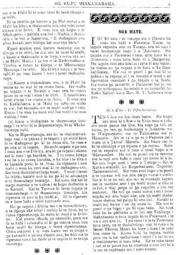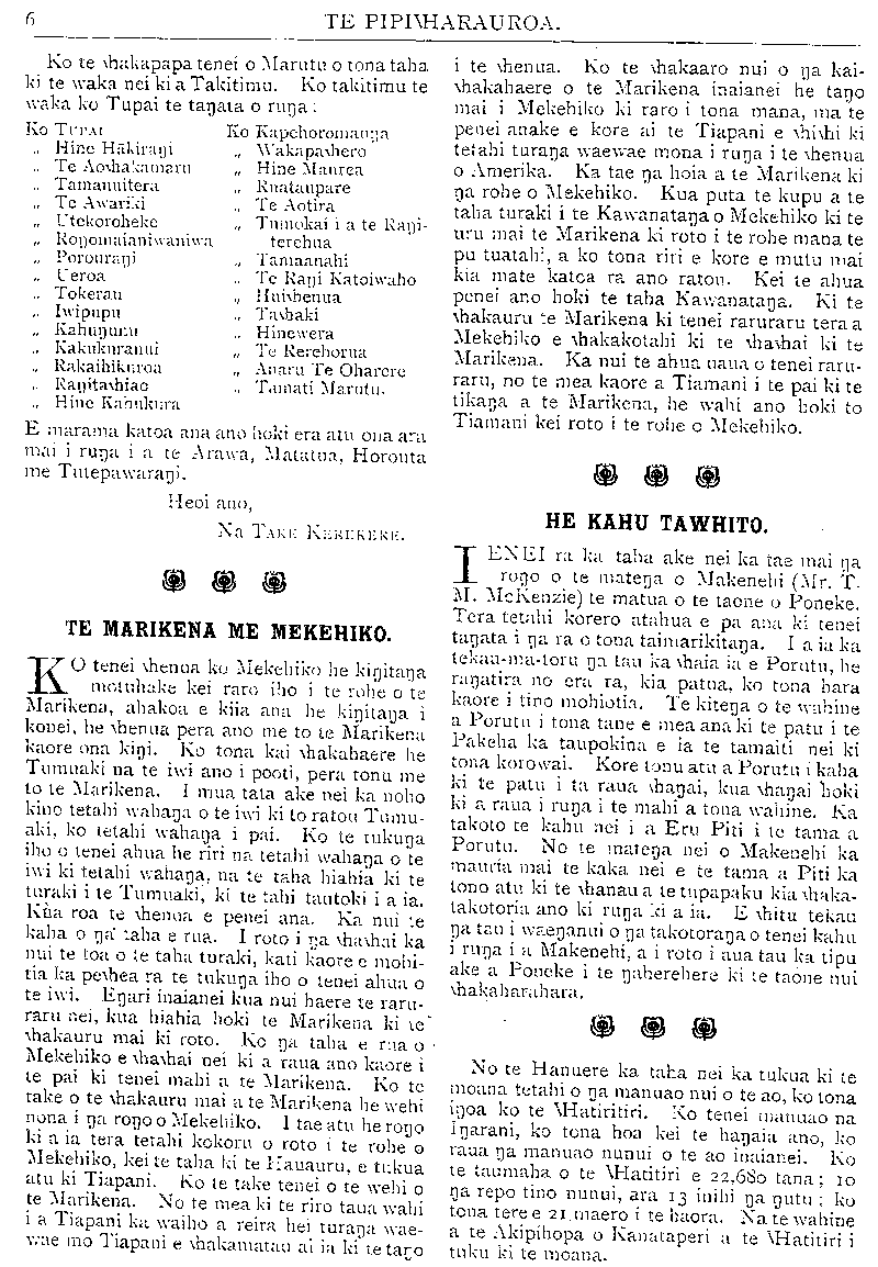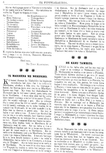 TE PIPIWHARAUROA. Ko te whakapapa tenei o Marutu o tona taha ki te waka nei ki a Takitimu. Ko takitimu te waka ko Tupai te tangata o runga: Ko TUPAI Ko Kapehoromaunga „ Hine Hakirangi „ Wakapawhero „ Te Aowhakamaru „ Hine Maurea „ Tamanuitera. „ Ruataupare „ Te Awariki „ Te Aotira „ Utekoroheke „ Tumokai i a te Rangi -„ Rongomaianiwaniwa terehua „ Porourangi „ Tamaauahi „ Ueroa „ Te Rangi Katoiwaho „ Tokerau „ Huiwhenua „ Iwipupu Tawhaki „ Kahungunu „ Hinewera „ Kakukuranui „ Te Rerehorua „ Rakaihikuroa „ Anaru Te Oharere „ Rangitawhiao „ Tamati Marutu „ Hine Kahukura E marama katoa ana ano hoki era atu ona ara mai i runa i a te Arawa, Matatua, Horouta me Tutepawarangi. Heoi ano, Na TAKE KEREKERE. TE MARIKENA ME MEKEHIKO. KO tenei whenua ko Mekehiko he kingitanga motuhake kei raro iho i te rohe o te Marikena, ahakoa e kiia ana he kingitanga i konei, he whenua pera ano me to te Marikena kaore ona kingi. Ko tona kai whakahaere he Tumuaki na te iwi ano i pooti, pera tonu me to te Marikena. 1 mua tata ake nei ka noho kino tetahi wahanga o te iwi ki to ratou Tumu- aki, ko tetahi wahanga i pai. Ko te tukunga iho o tenei ahua he riri na tetahi wahanga o te iwi ki tetahi wahanga na te taha hiahia ki te turaki i te Tumuaki, ki te tahi tautoki i a ia. Kua roa te whenua e penei ana. Ka nui te kaha o na taha e rua. I roto i na whawhai ka nui te toa o te taha turaki, kati kaore e mohi- tia ka pewhea ra te tukunga iho o tenei ahua o te iwi. Engari inaianei kua nui haere te raru- raru nei, kua hiahia hoki te Marikena ki te whakauru mai ki roto. Ko nga taha e rua o Mekehiko e whawhai nei ki a raua ano kaore i te pai ki tenei mahi a te Mari kena. Ko te take o te whakauru mai a te Marikena he wehi nona i nga rong o Mekehiko. I tae atu he rongo ki a ia tera tetahi kokoru o roto i te rohe o Mekehiko, kei te taha ki te Hauauru, e tukua atu ki Tiapani. Ko te take tenei o te wehi o te Marikena. No te mea ki te riro taua wahi i a Tiapani ka waiho a reira hei turanga wae- wae mo Tiapani e whakamatau ai ia ki te tango i te whenua. Ko te whakaaro nui o na kai- whakahaere o te Marikena inaianei he tango mai i Mekehiko ki raro i tona mana, ma te penei anake e kore ai te Tiapani e whiwhi ki tetahi turanga waewae mona i runa i te whenua o Amerika. Ka tae nga hoia a te Marikena ki na rohe o Mekehiko. Kua puta te kupu a te taha turaki i te Kawanatanga o Mekehiko ki te uru mai te Marikena ki roto i te rohe mana te pu tuatahi, a ko tona riri e kore e mutu mai kia mate katoa ra ano ratou. Kei te ahua penei ano hoki te taha Kawanatanga. Ki te whakauru te Marikena ki tenei raruraru tera a Mekehiko e whakakotahi ki te whawhai ki te Marikena. Ka nui te ahua uaua o tenei raru- raru, no te mea kaore a Tiamani i te pai ki te tikanga a te Marikena, he wahi ano hoki to Tiamani kei roto i te rohe o Mekehiko. HE KAHU TAWHITO. TENEI ra ka taha ake nei ka tae mai na rongo o te matenga o Makenehi (Mr. T. M. McKenzie) te matua o te taone o Poneke. Tera tetahi korero atahua e pa ana ki tenei tangata i na ra o tona taimauikitanga. I a ia ka tekau-ma-toru nga tau ka whaia ia e Porutu, he rangatira no era ra, kia patua, ko tona hara kaore i tino mohiotia. Te kitenga o te wahine a Porutu i tona tane e mea ana ki te patu i te Pakeha ka taupokina e ia te tamaiti nei ki tona korowai. Kore tonu atu a Porutu i kaha ki te patu i ta raua whangai, kua whangai "hoki ki a raua i runa i te mahi a tona wahine. Ka takoto te kahu nei i a Eru Piti i te tama a Porutu. No te matenga nei o Makenehi ka mauria mai te kaka nei e te tama a Piti ka tono atu ki te whanaua te tupapaku kia whaka- takotoria ano ki runa ki a ia. E whitu tekau na tau i waenganui o takotoranga o tenei kahu i runa i a Makenehi, a i roto i aua tau ka tipu ake a Poneke i te ngaherehere ki te taone nui whakaharahara. No te Hanuere ka taha nei ka tukua ki te moana tetahi o nga manuao nui o te ao, ko tona ingoa ko te Whatiritiri. Ko tenei manuao na Ingarani, ko tona hoa kei te hangaia ano, ko raua manuao nunui o te ao inaianei. Ko te taumaha o te Whatitiri e 22, 680 tana; 10 na repo tino nunui, ara 13 inihi na ngutu; ko tona tere e 21 maero i te haora. Na te wahine a te Akipihopa o Kanataperi a te Whatitiri i tuku ki te moana.